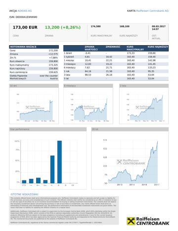 KARTA Raiffeisen Centrobank AG AKCJA ADIDAS AG ISIN: DE000A1EWWW0 173,00 EUR 13,200 (+8,26%) 174,500 168,100 08.03.2017 14:57 CENA ZMIANA KURS MAKSYMALNY KURS NAJNIŻSZY OST. AKTUAL. NOTOWANIA BIEŻĄCE ZMIANA WARTOŚCI ZMIENNOŚĆ KURS MAKSYMALNY KURS NAJNIŻSZY 1 dzień -0,41 - 173,33 159,80 +7,88% 1 tydzień 0,81 18,42 163,40 158,40 Kurs otwarcia 159,800 1 miesiąc 10,41 22,21 163,40 142,98 Kurs maksymalny 173,325 3 miesiące 12,83 19,22 163,40 141,45 159,800 6 miesięcy 7,62 21,71 163,40 133,23 159,625 1 rok 64,16 21,58 163,40 95,35 over the counter Austria 3 lata 98,53 26,18 163,40 53,04 5 lat - - 163,40 53,04 Cena 172,200 Zmiana +12,575 Zm.% Kurs najniższy Kurs zamknięcia Giełda Papierów Wartościowych 10 dni Year performance 6 miesięcy 2 lata 20 lat ISTOTNE WSKAZÓWKI The contents offered herein shall serve informational purposes only. Raiffeisen Centrobank makes no warranty and will accept no liability for the correctness, accuracy and completeness of such contents. The offered contents shall neither be considered as an offer or invitation to buy or sell any type of securities nor as an incentive recommendation for buying or selling investment instruments. The contents shall not replace the necessary investment advice concerning the purchase or sale of securities or investments. Any charts offered herein shall serve as information of historical chart developments only. No performance information of the described investment instruments are given herein. The issuer shall bear no liability for updating the offered contents on a regular basis. Additionally, Raiffeisen Centrobank AG is subject to supervision by the European Central Bank (ECB), which ECB undertakes within the Single Supervisory Mechanism (SSM), which consists of the ECB on national responsible authorities (Council Regulation (EU) No 1024/2013). All products offered by RCB are subject to the base prospectus (including all supplements and amendments, if any) for the current issuance programme of RCB, which has been approved by the Austrian Financial Market Authority and deposited at the Oesterreichische Kontrollbank AG. The mentioned documents are published on the website of Raiffeisen Centrobank AG. Raiffeisen Centrobank AG, registered at the Vienna commercial register under FN 117507 f, Tegetthoffstraße 1, 1010 Wien. Powered by TCPDF (www.tcpdf.org)
