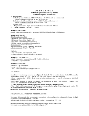PROPOZYCJE Halowe Regionalne Zawody Konne w Skokach przez Przeszkody 1. 2. 3. Organizator: 1) Ludowy Klub Jeździecki „OLIMP” Prudnik, 48-200 Prudnik ul. Jesionkowa 2 e-mail – [email protected] tel./fax. 077 436 32 06 2) Stadnina Koni Prudnik Spółka z o.o. 48-200 Prudnik ul. Jesionkowa 2 e-mail – [email protected] tel./fax. 077 436 32 06 3) OZJ Opole Miejsce zawodów: - Kryta Ujeżdzalnia Stadniny Koni Prudnik - Chocim Termin zawodów: 17.03.2012 r. (sobota) WARUNKI OGÓLNE: Zawody będą rozgrywane zgodnie z przepisami PZJ i Opolskiego Związku Jeździeckiego. OSOBY OFICJALNE: Skład komisji sędziowskiej: - Małgorzata Skok – Sędzia Główny PZJ - Małgorzata Skowrońska - Sędzia WZJ - Ewa Puzio – członek komisji sędziowskiej - Elżbieta Łapiak – członek komisji sędziowskiej Gospodarz toru: Dariusz Świderski Dyrektor Zawodów: Lesław Tokarz tel. 509-915 485 Lekarz weterynarii: Zbigniew Wysiecki UDZIAŁ: Kluby i sekcje OZJ, oraz zaproszeni goście. Liczba zawodników i Klubów/Sekcji bez ograniczeń WARUNKI TECHNICZNE Podłoże piaszczyste - kryta ujeżdżalnia SK Prudnik w Chocimiu Rozprężalnia – kryta ujeżdżalnia WARUNKI UDZIAŁU Zawodnicy – na własny koszt Luzacy – na własny koszt Konie – koszty transportu pokrywają delegujący. ZGŁOSZENIA Zawodników i koni należy przesyłać na oficjalnych drukach PZJ w terminie do dn. 14.03.2012r. na adres Stadniny Koni Prudnik Sp.z o.o. tel./fax. 077 436 32 06 e-mail – [email protected] Opłata organizacyjna – 65,00- zł od konia za jeden dzień zawodów (w tym 5,- zł opłata na działalność statutową OZJ). Opłaty należy dokonać w biurze SK Prudnik lub przelewem na konto LKJ „OLIMP” Prudnik w BS Prudnik Nr 24 8905 0000 2000 0020 6617 0001 Za konie zgłoszone po w/w terminie pobierana będzie opłata w wysokości – 85,- zł, Boksy – liczba miejsc ograniczona (tylko dla ogierów o pozostałych decyduje kolejność zgłoszeń) – opłata 80,zł, Za zmianę na listach startowych opłata 30,00 zł Stanowiska – bez ograniczeń – opłata 30,- zł. za całe zawody DOKUMENTACJA I PRZEPISY WETERYNARYJNE Wymagana dokumentacja dla koni: aktualne szczepienia ochronne, bez w/w dokumentów konie nie będą wpuszczone na teren Stadniny w Chocimiu. Dokumentacja dla Klubów/Sekcji i zawodników zgodna z wymaganiami OZJ i PZJ Organizator nie ponosi odpowiedzialności za zaistniałe szkody, wypadki i kradzieże. Listy startowe do wglądu od dnia 16.03.2012 r. od godz. 1300 . SOBOTA 17.03. 2012 r. Godz. 10.00 Godz. 1000 Odprawa techniczna Godz. 1100 rozpoczęcie konkursów Konkurs Nr 1 Kl. „LL” - (90 cm) dokładności bez rozgrywki art. 238 p. 1.1 Konkurs Nr 2 Kl. „L” - (100 cm) dokładności bez rozgrywki art. 238 p. 1.1 Konkurs Nr 3 Kl. „P” - (110 cm) zwykły bez rozgrywki – Art. 238.2.1 Konkurs Nr 4 Kl. „N” - (120 cm) zwykły bez rozgrywki – Art. 238.2.1 Konkurs Nr 5 Kl. „N-1” - (125 cm) zwykły z rozgrywką (wg tab A) Art. 238.2.2 Organizator zastrzega sobie prawo zmian w programie. - Dla zwycięskich par w konkursach przewidziane są flot’s i nagrody rzeczowe w konkursie nr 4,5,6 - KODEKS POSTĘPOWANIA Z KONIEM Polski Związek Jeździecki prosi wszystkie osoby zaangażowane w jakikolwiek sposób w sporty konne, o przestrzeganie poniżej przedstawionego kodeksu oraz zasady, że dobro konia jest najważniejsze. Dobro konia musi być zawsze i wszędzie uwzględniane w sportach konnych i nie może być podporządkowane współzawodnictwu sportowemu ani innym celom np. komercyjnym. I. Na wszystkich etapach treningu i przygotowań konia do startu w zawodach, dobro konia musi stać ponad wszelkimi innymi wymaganiami. Dotyczy to stałej opieki, metod treningu, starannego obrządku, kucia i transportu. II. Konie i jeźdźcy muszą być wytrenowani, kompetentni i zdrowi zanim wezmą udział w zawodach. Odnosi się to także do podawania leków i środków medycznych, zabiegów chirurgicznych zagrażających dobru konia lub ciąży klaczy, oraz do przypadków nadużywania pomocy. III. Zawody nie mogą zagrażać dobru konia. Wymaga to zwrócenia szczególnej uwagi na teren zawodów, powierzchnię podłoża, pogodę, warunki stajenne, kondycję koni i ich bezpieczeństwo także podczas podróży powrotnej z zawodów. IV. Należy dołożyć wszelkich starań, aby zapewnić koniom staranną opiekę po zakończeniu zawodów, a także humanitarne traktowanie po zakończeniu kariery sportowej. Dotyczy to właściwej opieki weterynaryjnej obrażeń odniesionych na zawodach, spokojnej starości, ewentualnie eutanazji. V. PZJ zachęca wszystkie osoby działające w sporcie jeździeckim do stałego podnoszenia swojej wiedzy oraz umiejętności dotyczących wszelkich aspektów współpracy z koniem. Propozycje zatwierdzone przez OZJ Opole.