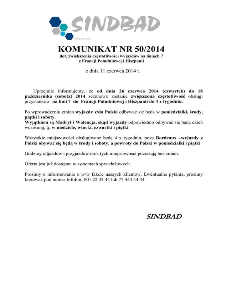 KOMUNIKAT NR 50/2014 dot. zwiększenia częstotliwości wyjazdów na liniach 7 z Francji Południowej i Hiszpanii z dnia 11 czerwca 2014 r. Uprzejmie informujemy, że od dnia 26 czerwca 2014 (czwartek) do 18 października (sobota) 2014 sezonowo zostanie zwiększona częstotliwość obsługi przystanków na linii 7 do Francji Południowej i Hiszpanii do 4 x tygodniu. Po wprowadzeniu zmian wyjazdy z/do Polski odbywać się będą w poniedziałki, środy, piątki i soboty. Wyjątkiem są Madryt i Walencja, skąd wyjazdy odpowiednio odbywać się będą dzień wcześniej, tj. w niedziele, wtorki, czwartki i piątki. Wszystkie miejscowości obsługiwane będą 4 x tygodniu, poza Bordeaux –wyjazdy z Polski obywać się będą w środy i soboty, a powroty do Polski w poniedziałki i piątki Godziny odjazdów i przyjazdów do/z tych miejscowości pozostają bez zmian. Oferta jest już dostępna w systemach sprzedażowych. Prosimy o informowanie o w/w fakcie naszych klientów. Ewentualne pytania, prosimy kierować pod numer Infolinii 801 22 33 44 lub 77 443 44 44. SINDBAD