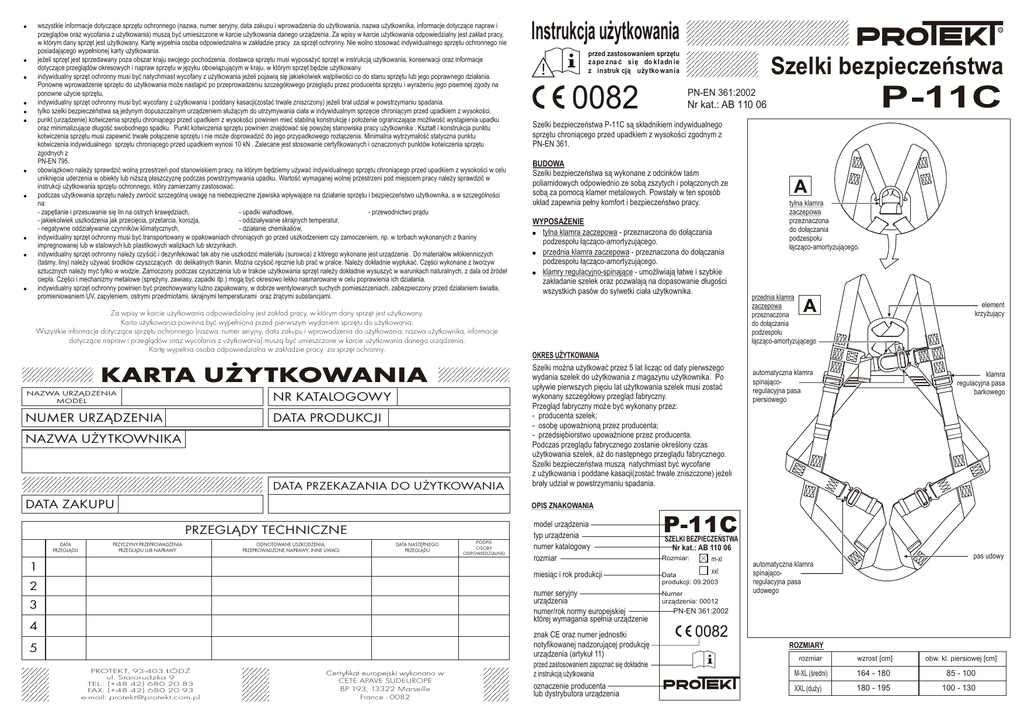 ! ! ! ! ! ! ! ! ! ! ! wszystkie informacje dotyczące sprzętu ochronnego (nazwa, numer seryjny, data zakupu i wprowadzenia do użytkowania, nazwa użytkownika, informacje dotyczące napraw i przeglądów oraz wycofania z użytkowania) muszą być umieszczone w karcie użytkowania danego urządzenia. Za wpisy w karcie użytkowania odpowiedzialny jest zakład pracy, w którym dany sprzęt jest użytkowany. Kartę wypełnia osoba odpowiedzialna w zakładzie pracy za sprzęt ochronny. Nie wolno stosować indywidualnego sprzętu ochronnego nie posiadającego wypełnionej karty użytkowania. jeżeli sprzęt jest sprzedawany poza obszar kraju swojego pochodzenia, dostawca sprzętu musi wyposażyć sprzęt w instrukcją użytkowania, konserwacji oraz informacje dotyczące przeglądów okresowych i napraw sprzętu w języku obowiązującym w kraju, w którym sprzęt będzie użytkowany. indywidualny sprzęt ochronny musi być natychmiast wycofany z użytkowania jeżeli pojawią się jakiekolwiek wątpliwości co do stanu sprzętu lub jego poprawnego działania. Ponowne wprowadzenie sprzętu do użytkowania może nastąpić po przeprowadzeniu szczegółowego przeglądu przez producenta sprzętu i wyrażeniu jego pisemnej zgody na ponowne użycie sprzętu. indywidualny sprzęt ochronny musi być wycofany z użytkowania i poddany kasacji(zostać trwale zniszczony) jeżeli brał udział w powstrzymaniu spadania. tylko szelki bezpieczeństwa są jedynym dopuszczalnym urządzeniem służącym do utrzymywania ciała w indywidualnym sprzęcie chroniącym przed upadkiem z wysokości. punkt (urządzenie) kotwiczenia sprzętu chroniącego przed upadkiem z wysokości powinien mieć stabilną konstrukcję i położenie ograniczające możliwość wystąpienia upadku oraz minimalizujące długość swobodnego spadku. Punkt kotwiczenia sprzętu powinien znajdować się powyżej stanowiska pracy użytkownika . Kształt i konstrukcja punktu kotwiczenia sprzętu musi zapewnić trwałe połączenie sprzętu i nie może doprowadzić do jego przypadkowego rozłączenia. Minimalna wytrzymałość statyczna punktu kotwiczenia indywidualnego sprzętu chroniącego przed upadkiem wynosi 10 kN . Zalecane jest stosowanie certyfikowanych i oznaczonych punktów kotwiczenia sprzętu zgodnych z PN-EN 795. obowiązkowo należy sprawdzić wolną przestrzeń pod stanowiskiem pracy, na którym będziemy używać indywidualnego sprzętu chroniącego przed upadkiem z wysokości w celu uniknięcia uderzenia w obiekty lub niższą płaszczyznę podczas powstrzymywania upadku. Wartość wymaganej wolnej przestrzeni pod miejscem pracy należy sprawdzić w instrukcji użytkowania sprzętu ochronnego, który zamierzamy zastosować. podczas użytkowania sprzętu należy zwrócić szczególną uwagę na niebezpieczne zjawiska wpływające na działanie sprzętu i bezpieczeństwo użytkownika, a w szczególności na: - zapętlanie i przesuwanie się lin na ostrych krawędziach, - upadki wahadłowe, - przewodnictwo prądu - jakiekolwiek uszkodzenia jak przecięcia, przetarcia, korozja, - oddziaływanie skrajnych temperatur, - negatywne oddziaływanie czynników klimatycznych, - działanie chemikaliów, indywidualny sprzęt ochronny musi być transportowany w opakowaniach chroniących go przed uszkodzeniem czy zamoczeniem, np. w torbach wykonanych z tkaniny impregnowanej lub w stalowych lub plastikowych walizkach lub skrzynkach. indywidualny sprzęt ochronny należy czyścić i dezynfekować tak aby nie uszkodzić materiału (surowca) z którego wykonane jest urządzenie . Do materiałów włókienniczych (taśmy, liny) należy używać środków czyszczących do delikatnych tkanin. Można czyścić ręcznie lub prać w pralce. Należy dokładnie wypłukać. Części wykonane z tworzyw sztucznych należy myć tylko w wodzie. Zamoczony podczas czyszczenia lub w trakcie użytkowania sprzęt należy dokładnie wysuszyć w warunkach naturalnych, z dala od źródeł ciepła. Części i mechanizmy metalowe (sprężyny, zawiasy, zapadki itp.) mogą być okresowo lekko nasmarowane w celu poprawienia ich działania. indywidualny sprzęt ochronny powinien być przechowywany luźno zapakowany, w dobrze wentylowanych suchych pomieszczeniach, zabezpieczony przed działaniem światła, promieniowaniem UV, zapyleniem, ostrymi przedmiotami, skrajnymi temperaturami oraz żrącymi substancjami. Za wpisy w karcie u¿ytkowania odpowiedzialny jest zak³ad pracy, w którym dany sprzêt jest u¿ytkowany. Karta u¿ytkowania powinna byæ wype³niona przed pierwszym wydaniem sprzêtu do u¿ytkowania. Wszystkie informacje dotycz¹ce sprzêtu ochronnego (nazwa, numer seryjny, data zakupu i wprowadzenia do u¿ytkowania, nazwa u¿ytkownika, informacje dotycz¹ce napraw i przegl¹dów oraz wycofania z u¿ytkowania) musz¹ byæ umieszczone w karcie u¿ytkowania danego urz¹dzenia. Kartê wype³nia osoba odpowiedzialna w zak³adzie pracy za sprzêt ochronny. KARTA U¯YTKOWANIA NAZWA URZ¥DZENIA MODEL NR KATALOGOWY NUMER URZ¥DZENIA DATA PRODUKCJI NAZWA U¯YTKOWNIKA DATA PRZEKAZANIA DO U¯YTKOWANIA DATA ZAKUPU przed zastosowaniem sprzętu zapo zna ć się do kładn ie z instruk cją uży tko wan ia Szelki bezpieczeństwa P-11C PN-EN 361:2002 Nr kat.: AB 110 06 Szelki bezpieczeństwa P-11C są składnikiem indywidualnego sprzętu chroniącego przed upadkiem z wysokości zgodnym z PN-EN 361. BUDOWA Szelki bezpieczeństwa są wykonane z odcinków taśm poliamidowych odpowiednio ze sobą zszytych i połączonych ze sobą za pomocą klamer metalowych. Powstały w ten sposób układ zapewnia pełny komfort i bezpieczeństwo pracy. WYPOSAŻENIE ! tylna klamra zaczepowa - przeznaczona do dołączania podzespołu łącząco-amortyzującego. ! przednia klamra zaczepowa - przeznaczona do dołączania podzespołu łącząco-amortyzującego. ! klamry regulacyjno-spinające - umożliwiają łatwe i szybkie zakładanie szelek oraz pozwalają na dopasowanie długości wszystkich pasów do syl