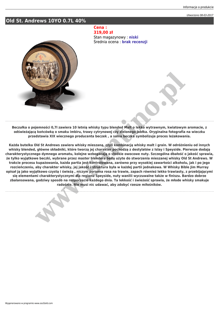 Informacje o produkcie Utworzono 08-03-2017 Old St. Andrews 10YO 0.7L 40% Cena : 319,00 zł in o. pl Stan magazynowy : niski Średnia ocena : brak recenzji an t Beczułka o pojemności 0,7l zawiera 10 letnią whisky typu blended Malt o lekko wytrawnym, kwiatowym aromacie, z odświeżającą końcówką o smaku imbiru, trawy cytrynowej czy zielonego jabłka. Oryginalna fotografia na wieczku przedstawia XIX wiecznego producenta beczek , a sama beczka symbolizuje proces leżakowania. w w w .s Każda butelka Old St Andrews zawiera whisky mieszaną, czyli kombinacją whisky malt i grain. W odróżnieniu od innych whisky blended, główne składniki, które tworzą jej charakter pochodzą z destylatów z Islay i Speyside. Pierwsze dodają charakterystycznego dymnego aromatu, kolejne wzbogacają o słodkie owocowe nuty. Szczególna dbałość o jakość sprawia, że tylko wyjątkowe beczki, wybrane przez master blendera będą użyte do stworzenia mieszanej whisky Old St Andrews. W trakcie procesu kupażowania, każda partia jest kontrolowana, zarówno przy wysokiej zawartości alkoholu, jak i po jego rozcieńczeniu, aby charakter whisky, jej jakość i struktura była w każdej partii jednakowa. W Whisky Bible Jim Murray opisał ją jako wyjątkowo czystą i świeżą , niczym poranna rosa na trawie, zapach również lekko trawiasty, z przebijającymi się elementami charakterystycznymi dla regionu Speyside, nuty wanilii wyczuwalne także w finiszu. Bardzo dobrze zbalansowana, godziwy sposób na rozpoczęcie każdego dnia. Ta lekkość i świeżość sprawia, że młode whisky smakuje radośnie. Nie musi nic udawać, aby zdobyć rzesze miłośników. Wygenerowano w programie www.oscGold.com