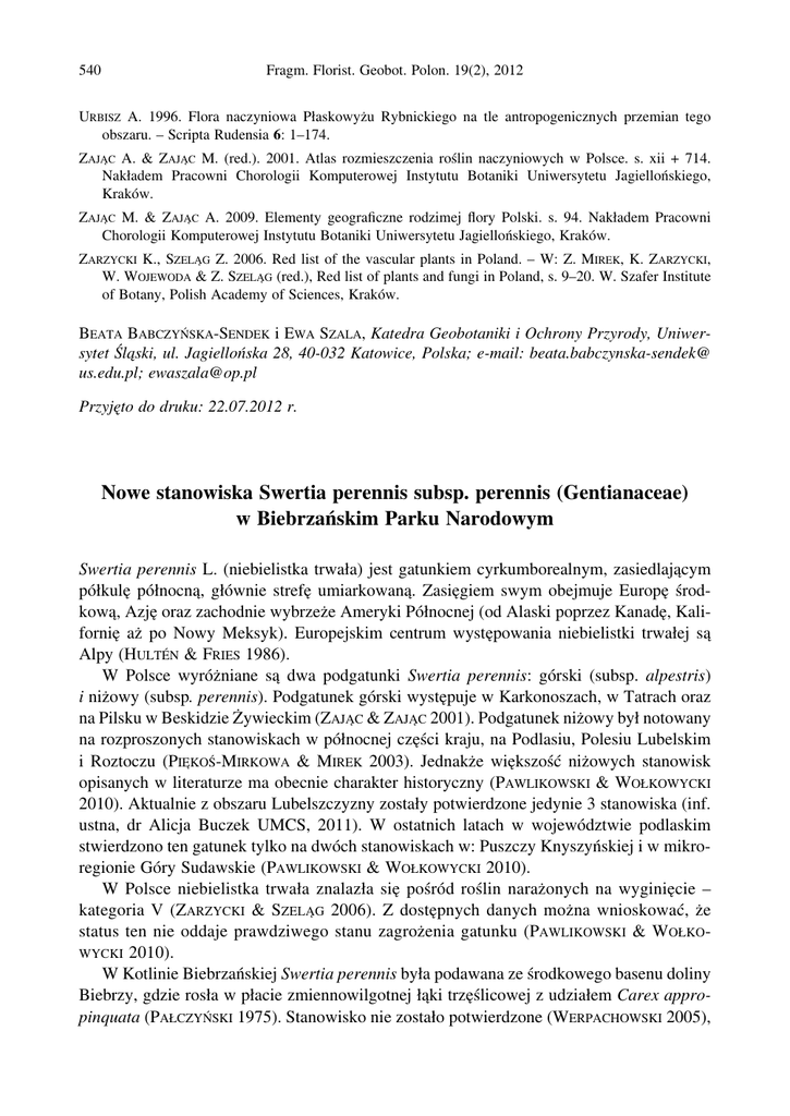 540 Fragm. Florist. Geobot. Polon. 19(2), 2012 URBISZ A. 1996. Flora naczyniowa Płaskowyżu Rybnickiego na tle antropogenicznych przemian tego obszaru. – Scripta Rudensia 6: 1–174. ZAJĄC A. & ZAJĄC M. (red.). 2001. Atlas rozmieszczenia roślin naczyniowych w Polsce. s. xii + 714. Nakładem Pracowni Chorologii Komputerowej Instytutu Botaniki Uniwersytetu Jagiellońskiego, Kraków. ZAJĄC M. & ZAJĄC A. 2009. Elementy geograficzne rodzimej flory Polski. s. 94. Nakładem Pracowni Chorologii Komputerowej Instytutu Botaniki Uniwersytetu Jagiellońskiego, Kraków. ZARZYCKI K., SZELĄG Z. 2006. Red list of the vascular plants in Poland. – W: Z. MIREK, K. ZARZYCKI, W. WOJEWODA & Z. SZELĄG (red.), Red list of plants and fungi in Poland, s. 9–20. W. Szafer Institute of Botany, Polish Academy of Sciences, Kraków. BEATA BABCZYŃSKA-SENDEK i EWA SZALA, Katedra Geobotaniki i Ochrony Przyrody, Uniwersytet Śląski, ul. Jagiellońska 28, 40-032 Katowice, Polska; e-mail: beata.babczynska-sendek@ us.edu.pl; [email protected] Przyjęto do druku: 22.07.2012 r. Nowe stanowiska Swertia perennis subsp. perennis (Gentianaceae) w Biebrzańskim Parku Narodowym Swertia perennis L. (niebielistka trwała) jest gatunkiem cyrkumborealnym, zasiedlającym półkulę północną, głównie strefę umiarkowaną. Zasięgiem swym obejmuje Europę środkową, Azję oraz zachodnie wybrzeże Ameryki Północnej (od Alaski poprzez Kanadę, Kalifornię aż po Nowy Meksyk). Europejskim centrum występowania niebielistki trwałej są Alpy (HULTÉN & FRIES 1986). W Polsce wyróżniane są dwa podgatunki Swertia perennis: górski (subsp. alpestris) i niżowy (subsp. perennis). Podgatunek górski występuje w Karkonoszach, w Tatrach oraz na Pilsku w Beskidzie Żywieckim (ZAJĄC & ZAJĄC 2001). Podgatunek niżowy był notowany na rozproszonych stanowiskach w północnej części kraju, na Podlasiu, Polesiu Lubelskim i Roztoczu (PIĘKOŚ-MIRKOWA & MIREK 2003). Jednakże większość niżowych stanowisk opisanych w literaturze ma obecnie charakter historyczny (PAWLIKOWSKI & WOŁKOWYCKI 2010). Aktualnie z obszaru Lubelszczyzny zostały potwierdzone jedynie 3 stanowiska (inf. ustna, dr Alicja Buczek UMCS, 2011). W ostatnich latach w województwie podlaskim stwierdzono ten gatunek tylko na dwóch stanowiskach w: Puszczy Knyszyńskiej i w mikroregionie Góry Sudawskie (PAWLIKOWSKI & WOŁKOWYCKI 2010). W Polsce niebielistka trwała znalazła się pośród roślin narażonych na wyginięcie – kategoria V (ZARZYCKI & SZELĄG 2006). Z dostępnych danych można wnioskować, że status ten nie oddaje prawdziwego stanu zagrożenia gatunku (PAWLIKOWSKI & WOŁKOWYCKI 2010). W Kotlinie Biebrzańskiej Swertia perennis była podawana ze środkowego basenu doliny Biebrzy, gdzie rosła w płacie zmiennowilgotnej łąki trzęślicowej z udziałem Carex appropinquata (PAŁCZYŃSKI 1975). Stanowisko nie zostało potwierdzone (WERPACHOWSKI 2005), 23°12'0"E 23°13'0"E 23°14'0"E 23°15'0"E 541 23°16'0"E 23°17'0"E 23°18'0"E 23°19'0"E 53°45'0"N Notatki botaniczne 53°44'0"N Jastrzębna Druga Jastrzębna Pierwsza 53°43'0"N Ostrowie Biebrz a Ka m ie nn a 53°42'0"N Kamienna Nowa 53°41'0"N Kamienna Stara Kuderewszczyzna 0 0,5 1 2 3 4 km 53°40'0"N Nowa Wieś Ryc. 1. Nowe stanowiska () niebielistki trwałej Swertia perennis w dolinie Biebrzy Fig. 1. The new locatities () of felwort Swertia perennis in the Biebrza valley toteż gatunek został uznany na tym obszarze za prawdopodobnie wymarły (PAWLIKOWSKI & WOŁKOWYCKI 2010). Nowe stanowisko niebielistki trwałej odnaleziono latem 2010 r. w górnym basenie doliny Biebrzy, w granicach Biebrzańskiego Parku Narodowego (Ryc. 1), w okolicy wsi Kamienna Stara w gm. Dąbrowa Białostocka (kwadrat ATPOL GB51). Po raz pierwszy podgatunek Swertia perennis subsp. perennis został zaobserwowany na tym stanowisku przez dr hab. Krzysztofa Oklejewicza w 2004 r. (inf. ustna). Niebielistka trwała występuje tutaj w płacie eutroficznej młaki niskoturzycowej Caricetum davallianae, na powierzchni około 1,2 ha, w obrębie zwartego kompleksu mechowisk. Miąższość torfu w miejscu wiercenia nieznacznie przekracza cztery metry. Na omawianym stanowisku naliczono 1390 pędów kwitnących. Warunki siedliskowe na torfowisku są częściowo zaburzone. Zaobserwowano procesy murszenia wierzchniej warstwy torfu. Prawdopodobnie, może być to skutkiem obecności rowów melioracyjnych w pobliżu stanowiska. Sytuacja ta sprzyja ekspansji gatunków drzewiastych, głównie brzozy i olszy. Skład florystyczny zbiorowiska z udziałem Swertia perennis subsp. perennis ilustruje poniższe zdjęcie fitosocjologiczne. Zdj. Data: 05.08.2010, pow. zdj. 50 m², pokrycie warstwy a – 5%, warstwy b – 10%, c – 80%, d – 90%, liczba gatunków – 51. ChAss. Caricetum davallianae: Swertia perennis 4.3; ChO., All. Caricetalia davallianae, Caricion davallianae: Carex flava 1.2, Epipactis palustris 1.1, Parnassia palustris +, 542 Fragm. Florist. Geobot. Polon. 19(2), 2012 Bryum pseudotriquetrum d +, Campylium stellatum d +, Limprichtia cossonii d +, Paludella squarosa d +; ChCl. Scheuchzerio-Caricetea nigrae: Carex nigra 2.1, Menyanthes trifoliata 2.1, Carex lasiocarpa 1.1, Eriophorum angustifolium 1.1, Juncus articulatus +; Triglochin palustre +, Viola palustris +, ChCl. Molinio-Arrhenatheretea: Molinia caerulea 2.2, Angelica sylvestris 1.1, Filipendula ulmaria 1.1, Lysimachia vulgaris 1.1, Achillea millefolium +, Cirsium palustre +, Galium uliginosum +, Lotus uliginosus +; Lythrum salicaria +, Polygonum bistorta +, Inne: Betula pendula a +, b 2.1, c 1.1; Salix cinerea b 1.2; Betula humilis b +; Frangula alnus b +, c +; Pinus sylvestris b +, c +; Potentilla erecta 2.1; Oxycoccus palustris 1.2; Geum rivale 1.2; Carex appropinquata 1.1; C. panicea 1.1; C. rostrata 1.1; Dactylorhiza sp. 1.1; Anthoxanthum odoratum +; Galium verum +; Briza media +; Drosera rotundifolia +; Epilobium palustre +; Eupatorium cannabinum +; Pyrola chlorantha +;