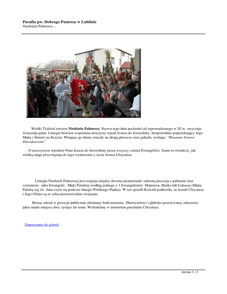 Parafia pw. Dobrego Pasterza w Lublinie Niedziela Palmowa ... Wielki Tydzień otwiera Niedziela Palmowa. Nazwa tego dnia pochodzi od wprowadzonego w XI w. zwyczaju święcenia palm. Liturgia bowiem wspomina uroczysty wjazd Jezusa do Jerozolimy, bezpośrednio poprzedzający Jego Mękę i Śmierć na Krzyżu. Witające go tłumy rzucały na drogę płaszcze oraz gałązki, wołając: "Hosanna Synowi Dawidowemu". O uroczystym wjeździe Pana Jezusa do Jerozolimy piszą wszyscy czterej Ewangeliści. Samo to świadczy, jak wielką rangę przywiązują do tego wydarzenia z życia Jezusa Chrystusa. Liturgia Niedzieli Palmowej jest rozpięta między dwoma momentami: radosną procesją z palmami oraz czytaniem - jako Ewangelii - Męki Pańskiej według jednego z 3 Ewangelistów: Mateusza, Marka lub Łukasza (Mękę Pańską wg św. Jana czyta się podczas liturgii Wielkiego Piątku). W ten sposób Kościół podkreśla, że triumf Chrystusa i Jego Ofiara są ze sobą nierozerwalnie związane. Biorąc udział w procesji publicznie składamy hołd naszemu Zbawicielowi i głęboko przeżywamy zdarzenie, jakie miało miejsce dwa tysiące lat temu. Wchodzimy w misterium paschalne Chrystusa. Zapraszamy do galerii strona 1 / 1