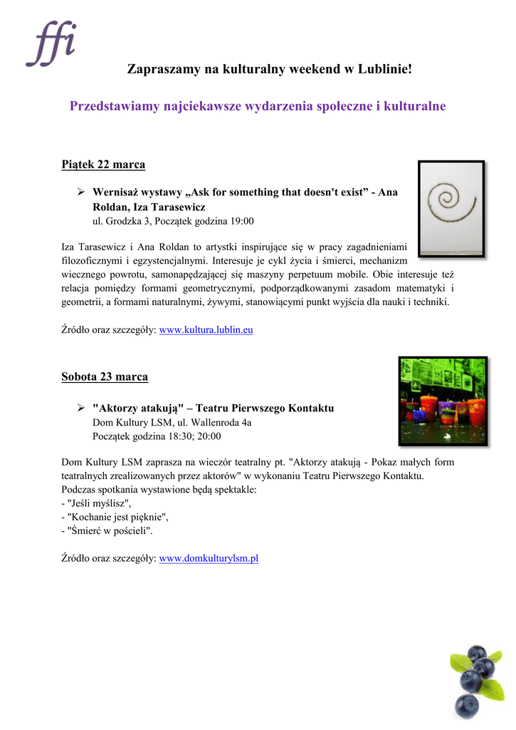 Zapraszamy na kulturalny weekend w Lublinie! Przedstawiamy najciekawsze wydarzenia społeczne i kulturalne Piątek 22 marca Wernisaż wystawy „Ask for something that doesn't exist” - Ana Roldan, Iza Tarasewicz ul. Grodzka 3, Początek godzina 19:00 Iza Tarasewicz i Ana Roldan to artystki inspirujące się w pracy zagadnieniami filozoficznymi i egzystencjalnymi. Interesuje je cykl życia i śmierci, mechanizm wiecznego powrotu, samonapędzającej się maszyny perpetuum mobile. Obie interesuje też relacja pomiędzy formami geometrycznymi, podporządkowanymi zasadom matematyki i geometrii, a formami naturalnymi, żywymi, stanowiącymi punkt wyjścia dla nauki i techniki. Źródło oraz szczegóły: www.kultura.lublin.eu Sobota 23 marca "Aktorzy atakują" – Teatru Pierwszego Kontaktu Dom Kultury LSM, ul. Wallenroda 4a Początek godzina 18:30; 20:00 Dom Kultury LSM zaprasza na wieczór teatralny pt. "Aktorzy atakują - Pokaz małych form teatralnych zrealizowanych przez aktorów" w wykonaniu Teatru Pierwszego Kontaktu. Podczas spotkania wystawione będą spektakle: - "Jeśli myślisz", - "Kochanie jest pięknie", - "Śmierć w pościeli". Źródło oraz szczegóły: www.domkulturylsm.pl Ogólnopolskie obchody Międzynarodowego Dnia Teatru w Lublinie Sala Widowiskowa, ul. Popiełuszki 5 Początek godz. 19:00 Centrum Kultury w Lublinie oraz Teatr Centralny włączyły się w obchody Międzynarodowego Dnia Teatru. Dotknij teatru to ogólnopolski projekt przygotowany z okazji Międzynarodowego Dnia Teatru, którego celem jest stworzenie możliwość twórczego spotkania artystów teatru i widzów. W dniach 18 – 28 marca widzowie 39 miejscowości w 16 województwach będą mogli wziąć udział w specjalnie z tej okazji przygotowanych wydarzeniach: spektaklach, próbach otwartych, warsztatach edukacyjnych, zwiedzaniu teatrów, spotkaniach z twórcami, wystawach, koncertach, czy happeningach. Sztuka „Zły” oparta na przeżyciach i doświadczeniach Dariusza Jeża, obecnie aktora Sceny Prapremier InVitro, który w przeszłości zajmował się działalnością przestępczą, za którą otrzymał i odsiedział kilkuletni wyrok. Podczas odbywania kary w Areszcie Śledczym w Lublinie spotkał reżysera teatralnego, Łukasza Witt-Michałowskiego, który w „Teatrze pod celą” realizował Lizystratę Arystofanesa. Wśród osadzonych-aktorów znalazł się także główny bohater. W ten sposób rozpoczyna się autentyczna opowieść o byłym przestępcy, który dzięki spotkaniu ze sztuką odmienił swoje życie. Źródło aktualności oraz szczegóły: www.dotknij-teatru.pl Niedziela 24 marca Czerwony Kapturek Teatr im. Christiana Andersena, ul. Dominikańska 1 Początek godzina 12:00 Teatr Andersena przygotował swoją wersję przygód dziewczynki w czerwonej czapeczce. Lubelski Czerwony Kapturek to prawdziwy rozrabiaka, a do tego całkiem rozśpiewany, tupiący nogą kiedy trzeba ale też biorący nogi za pas - kiedy sprawy wymykają się spod kontroli. Dla niegrzecznych dziewczynek i niesfornych chłopców, dla umęczonych rodziców i zamartwiających się dziadków i babć. Dla wszystkich tych, którzy wierzą, że edukacja nie musi być nudna a czasem można nauczyć się życia skręcając się ze śmiechu. Źródło oraz szczegóły: www.teatrandersena.pl Aga Zaryan - Love Songs Centrum Kongresowe AM, ul. Jaczewskiego 4 Początek godzina 19:00 “Aga Zaryan Love Songs” to nastrojowy program z repertuarem ponadczasowych tematów miłosnych według wyboru artystki, przygotowany na okazję występów o wyjątkowej, intymnej atmosferze. Aga Zaryan jest dziś rozpoznawalną w świecie wokalistką jazzową młodego pokolenia, która przybliża współczesnej publiczności to, co najlepsze w historii jazzu. Love Songs to uczta muzyczna i podróż poprzez nastrojowe ballady z okresu swingu, bossa nowy czy też jazzowe interpretacje popularnych piosenek. Wszystko łączy jeden mianownik: miłość, o której swoim ciepłym, matowym głosem śpiewa Aga Zaryan. Źródło oraz szczegóły: www.lublin.gdzieco.pl Wystawa "Przegląd wiosenny" 15 marca, piątek, godz. - 27 marca, środa Galeria "Przy Bramie" TPSP, ul. Grodzka 34/36 Wystawa zbiorowa członków lubelskiego Towarzystwa Przyjaciół Sztuk Pięknych pt. "Przegląd wiosenny". Na wystawie można podziwiać uroki upragnionej i wyczekiwanej wiosny, piękne krajobrazy i kwiaty. Wystawa charakteryzuje się dużą różnorodnością technik malarskich, prezentuje różnorodne spojrzenia artystyczne na wiosnę, zaskakuje intensywnością kolorów. Wystawa potrwa do 27 marca br. Źródło oraz szczegóły: www.kultura.lublin.eu