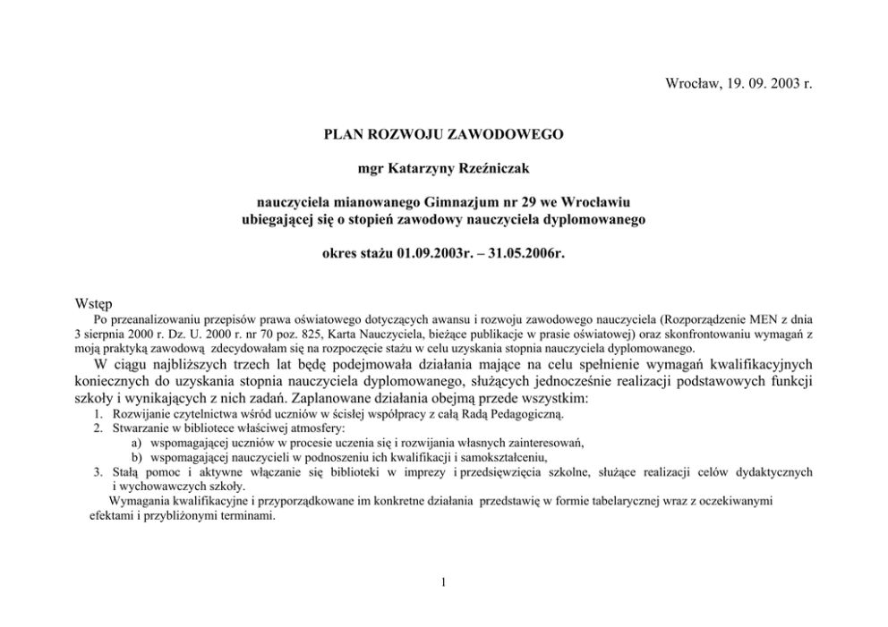 Wrocław, 19. 09. 2003 r. PLAN ROZWOJU ZAWODOWEGO mgr Katarzyny Rzeźniczak nauczyciela mianowanego Gimnazjum nr 29 we Wrocławiu ubiegającej się o stopień zawodowy nauczyciela dyplomowanego okres stażu 01.09.2003r. – 31.05.2006r. Wstęp Po przeanalizowaniu przepisów prawa oświatowego dotyczących awansu i rozwoju zawodowego nauczyciela (Rozporządzenie MEN z dnia 3 sierpnia 2000 r. Dz. U. 2000 r. nr 70 poz. 825, Karta Nauczyciela, bieżące publikacje w prasie oświatowej) oraz skonfrontowaniu wymagań z moją praktyką zawodową zdecydowałam się na rozpoczęcie stażu w celu uzyskania stopnia nauczyciela dyplomowanego. W ciągu najbliższych trzech lat będę podejmowała działania mające na celu spełnienie wymagań kwalifikacyjnych koniecznych do uzyskania stopnia nauczyciela dyplomowanego, służących jednocześnie realizacji podstawowych funkcji szkoły i wynikających z nich zadań. Zaplanowane działania obejmą przede wszystkim: 1. Rozwijanie czytelnictwa wśród uczniów w ścisłej współpracy z całą Radą Pedagogiczną. 2. Stwarzanie w bibliotece właściwej atmosfery: a) wspomagającej uczniów w procesie uczenia się i rozwijania własnych zainteresowań, b) wspomagającej nauczycieli w podnoszeniu ich kwalifikacji i samokształceniu, 3. Stałą pomoc i aktywne włączanie się biblioteki w imprezy i przedsięwzięcia szkolne, służące realizacji celów dydaktycznych i wychowawczych szkoły. Wymagania kwalifikacyjne i przyporządkowane im konkretne działania przedstawię w formie tabelarycznej wraz z oczekiwanymi efektami i przybliżonymi terminami. 1 FORMY REALIZACJI ZADANIA OCZEKIWANE EFEKTY TERMIN REALIZACJI § 5 ust. 2 pkt 1 Opracowywanie i wdrażanie przedsięwzięć i programów na rzecz doskonaleniu swojej pracy i podwyższania jakości pracy szkoły, w tym wykorzystywanie i doskonalenie umiejętności stosowania technologii komputerowej i informacyjnej. 1. Analiza i ocena własnej pracy, jako nauczyciela bibliotekarza: a) autorefleksja, b) określenie dalszej drogi rozwoju, c) zaplanowanie działań na okres trwania stażu, d) podsumowanie własnych osiągnięć i opracowanie dokumentacji. 1. Usystematyzowanie dotychczasowej wiedzy i określenie swoich słabych i mocnych stron. 2. Umiejętność autorefleksji oraz planowania swoich działań i ich dokumentowania. Okres stażu 2. Kontynuacja realizacji programu rozwoju czytelnictwa wśród uczniów Gimnazjum nr 29: a) ankietowanie uczniów na wejściu i wyjściu, b) analiza statystyki bibliotecznej, c) obserwacja, d) współpraca z nauczycielami, e) wnioski do dalszej pracy. 1. Podniesienie kultury czytelniczej uczniów. 2. Wykazywanie się przez uczniów postawą krytycznego odbiorcy mediów. Okres stażu 3. Kontynuacja programu komputeryzacji biblioteki. 1. Podniesienie jakości pracy biblioteki i szkoły. Okres stażu 4. Wykorzystywanie technologii komputerowej w realizowaniu różnych zadań szkoły i biblioteki: a) udostępnianie czytelnikom katalogu elektronicznego, b) udostępnianie czytelnikom programów multimedialnych (encyklopedia, słownik), c) poszukiwania informacji w Internecie do różnych opracowań, 1. Umiejętność wykorzystywania przez uczniów Okres stażu i nauczycieli technologii informacyjnej do: a) wykonywania zadań związanych z nauką i pracą, b) rozwijania swoich pasji i zainteresowań, 2 c) poszukiwania informacji na interesujący temat. 2. Podniesienie własnych umiejętności w posługiwaniu się technologią informacyjną. d) pomoc uczniom i nauczycielom w posługiwaniu się technologią informacyjną, e) opracowywanie pomocy dydaktycznych do lekcji i innych materiałów wykorzystywanych w codziennej pracy biblioteki i szkoły. 1. Podniesienie: a) umiejętności poszukiwania informacji i planowania swoich działań, b) wiedzy związanej z tematem projektu. 5. Udział w organizowanych projektach edukacyjnych szkolnych i pozaszkolnych lub ich koordynowanie (w zależności od potrzeb): a) „Cały Wrocław czyta dzieciom” Okres stażu Rok szkolny 2003/2004 6. Modyfikacja z zespołem nauczycieli ścieżek międzyprzedmiotowych po 1. Podniesienie jakości pracy szkoły. pierwszym cyklu kształcenia. Rok szkolny 2003/2004 7. Aktywny udział w pracach Komisji ds. mierzenia jakości pracy szkoły. 1. Podniesienie jakości pracy szkoły. Rok szkolny 2003/2004 i 2004/2005 8. Systematyczne podnoszenie swoich kwalifikacji zgodnie z własnymi potrzebami i potrzebami wynikającymi z planu pracy szkoły. 1. Podniesienie jakości pracy szkoły, biblioteki i własnych kompetencji zawodowych. Okres stażu § 5 ust. 2 pkt 2 Umiejętność dzielenia się swoją wiedzą i doświadczeniem z innymi pracownikami szkoły. 1. Gromadzenie, opracowanie i udostępnianie w bibliotece scenariuszy lekcji, imprez, diagnoz własnych oraz innych nauczycieli. 1. Wzajemna wymiana doświadczeń w pracy dydaktycznej i wychowawczej. 2. Wzbogacenie warsztatu pracy nauczyciela. Prowadzenie kartoteki zagadnieniowej na bazie dostępnej literatury pedagogicznej. 3 Okres stażu 2. Współprzygotowanie konferencji metodycznej dla nauczycieli języka 1. Wzajemna wymiana doświadczeń w pracy polskiego z naszego województwa w ramach Wszechnicy Nauczycielskiej dydaktycznej i wychowawczej. działającej przy Kolegium Nauczycielskim. Rok szkolny 2003/2004 3. Zapoznawanie wszystkich stażystów z dokumentami pracy szkoły, prawem oświatowym, procedurą awansu. 1. Swobodne poruszanie się nauczycieli w przepisach prawa oświatowego i dokumentach pracy szkoły. Okres stażu 4. Upowszechnianie ciekawych rozwiązań dydaktycznych na terenie szkoły. 1. Zainteresowanie nauczycieli twórczymi formami i metodami pracy z uczniem. 2. Podniesienie jakości nauczania i wychowania. Okres stażu 5 ust. 2 pkt 3 a Opracowanie i wdrożenie programu dotyczącego działań edukacyjnych, wychowawczych, opiekuńczych lub innych związanych odpowiednio z oświatą, pomocą społeczną lub postępowaniem w sprawach nieletnich. 1. Mod