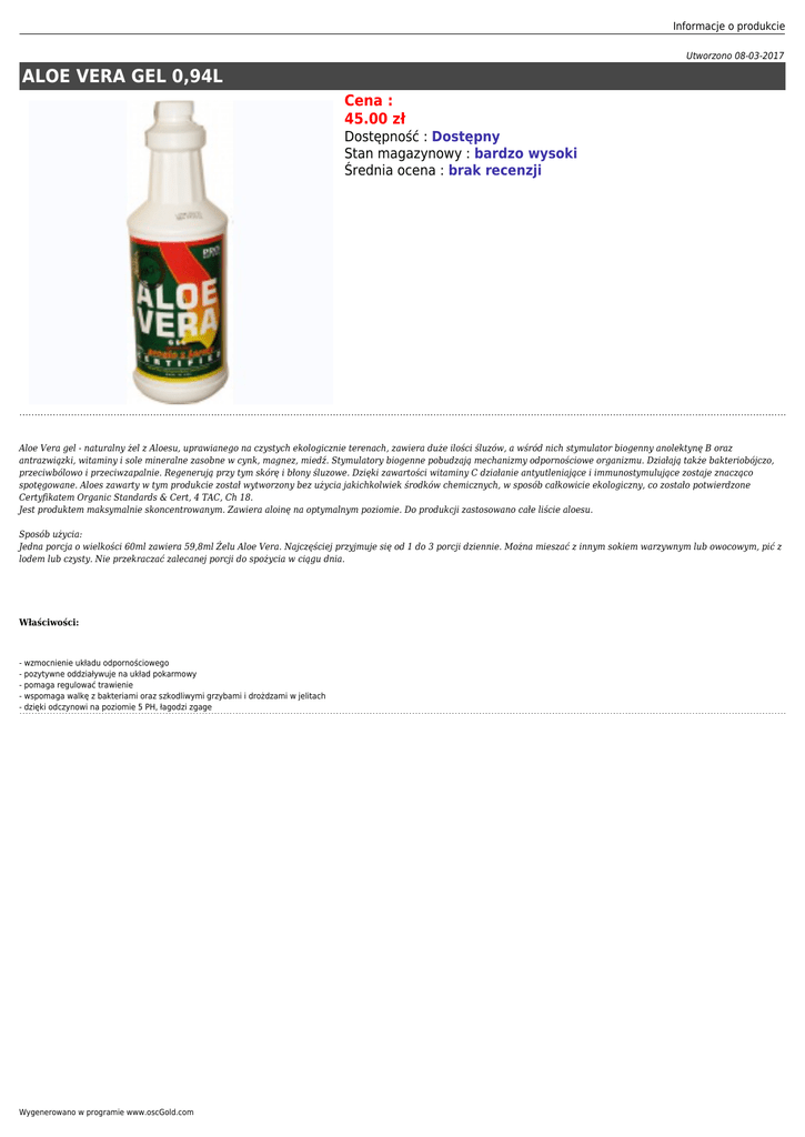 Informacje o produkcie Utworzono 08-03-2017 ALOE VERA GEL 0,94L Cena : 45.00 zł Dostępność : Dostępny Stan magazynowy : bardzo wysoki Średnia ocena : brak recenzji Aloe Vera gel - naturalny żel z Aloesu, uprawianego na czystych ekologicznie terenach, zawiera duże ilości śluzów, a wśród nich stymulator biogenny anolektynę B oraz antrazwiązki, witaminy i sole mineralne zasobne w cynk, magnez, miedź. Stymulatory biogenne pobudzają mechanizmy odpornościowe organizmu. Działają także bakteriobójczo, przeciwbólowo i przeciwzapalnie. Regenerują przy tym skórę i błony śluzowe. Dzięki zawartości witaminy C działanie antyutleniające i immunostymulujące zostaje znacząco spotęgowane. Aloes zawarty w tym produkcie został wytworzony bez użycia jakichkolwiek środków chemicznych, w sposób całkowicie ekologiczny, co zostało potwierdzone Certyfikatem Organic Standards & Cert, 4 TAC, Ch 18. Jest produktem maksymalnie skoncentrowanym. Zawiera aloinę na optymalnym poziomie. Do produkcji zastosowano całe liście aloesu. Sposób użycia: Jedna porcja o wielkości 60ml zawiera 59,8ml Żelu Aloe Vera. Najczęściej przyjmuje się od 1 do 3 porcji dziennie. Można mieszać z innym sokiem warzywnym lub owocowym, pić z lodem lub czysty. Nie przekraczać zalecanej porcji do spożycia w ciągu dnia. Właściwości: - wzmocnienie układu odpornościowego - pozytywne oddziaływuje na układ pokarmowy - pomaga regulować trawienie - wspomaga walkę z bakteriami oraz szkodliwymi grzybami i drożdzami w jelitach - dzięki odczynowi na poziomie 5 PH, łagodzi zgage Wygenerowano w programie www.oscGold.com
