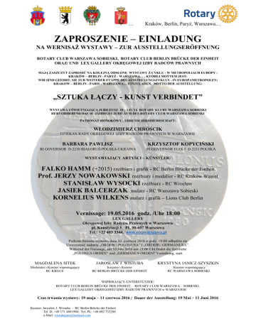 … Kraków, Berlin, Paryż, Warszawa… ZAPROSZENIE – EINLADUNG NA WERNISAŻ WYSTAWY – ZUR AUSSTELLUNGSERÖFFNUNG ROTARY CLUB WARSZAWA SOBIESKI, ROTARY CLUB BERLIN BRÜCKE DER EINHEIT ORAZ/ UND LEX GALLERY OKRĘGOWEJ IZBY RADCÓW PRAWNYCH MAJĄ ZASZCZYT ZAPROSIĆ NA KOLEJNĄ ODSŁONĘ WYSTAWY Z CYKLU - W METROPOLIACH EUROPY : KRAKÓW – BERLIN - PARYŻ - WARSZAWA… , KTÓREJ MOTTEM JEST: WIR SIND GEEHRT, SIE ZUR WEITERER ETAPPE DES AUSSTELLUNGSZYKLUS - IN EUROPAMETROPOLEN: KRAKOW – BERLIN - PARIS - WARSZAWA… EINZULADEN. MOTTO DER AUSSTELLUNG: „SZTUKA ŁĄCZY - KUNST VERBINDET” WYSTAWA UŚWIETNIAJĄCA JUBILEUSZ 10 – LECIA ROTARY KLUBU WARSZAWA SOBIESKI HERVORHEBEND DAS 10- JÄHRIGES JUBILÄUM DES ROTARY CLUB WARSZAWA SOBIESKI PATRONAT HONOROWY - EHRENSCHIRMHERRSCHAFT: WŁODZIMIERZ CHRÓŚCIK DZIEKAN RADY OKRĘGOWEJ IZBY RADCÓW PRAWNYCH W WARSZAWIE BARBARA PAWLISZ KRZYSZTOF KOPYCIŃSKI RI GOVERNOR D-2230 BIAŁORUŚ-POLSKA-UKRAINA RI GOVERNOR ELEKT D 2231 POLSKA WYSTAWIAJĄCY ARTYŚCI – KÜNSTLER: FALKO HAMM (+2015) rzeźbiarz i grafik - RC Berlin Brücke der Einheit Prof. JERZY NOWAKOWSKI rzeźbiarz i medalier - RC Kraków Wawel STANISŁAW WYSOCKI rzeźbiarz - RC Wrocław JASIEK BALCERZAK malarz - RC Warszawa Sobieski KORNELIUS WILKENS malarz i grafik – Lions Club Berlin Vernissage: 19.05.2016 godz. /Uhr 18:00 LEX GALLERY Okręgowej Izby Radców Prawnych w Warszawie pl. Konstytucji 5, PL 00-657 Warszawa Tel.: +22 403 3344, www.oirpwarszawa.pl Podczas finisażu wystawy dnia 10. czerwca 2016 o godz. 18:00 odbędzie się Uroczystość nadania „ORDERU POLONUSA” I „ORDERU GERMANUSA”. Während der Finissage, am 10 Juni 2016 um 18:00 Uhr findet die feierliche „POLONUS ORDEN“ und „GERMANUS ORDEN“ Verleihung, statt. MAGDALENA SITEK JAROSLAW J. WISTUBA KRYSTYNA JANICZ-SZYSZKIN Moderator i Kurator wspomagający RC KIELCE Inicjator i Kurator RC BERLIN BRÜCKE DER EINHEIT Kurator wspomagający RC WARSZAWA SOBIESKI WSPIERAJĄCY-UNTERSTÜTZER: ROTARY CLUB BERLIN BRÜCKE DER EINHEIT, ROTARY CLUB WARSZAWA – SOBIESKI, LEX GALLERY OKREGOWEJ IZBY RADCÓW PRAWNYCH w WARSZAWIE Czas trwania wystawy: 19 maja – 11 czerwca 2016 / Dauer der Ausstellung: 19 Mai – 11 Juni 2016 Kurator: Jaroslaw J. Wistuba - RC Berlin Brücke der Einheit Tel. D: +49 171 4881990; Tel. PL: +48 692 732280 e-Mail: [email protected]