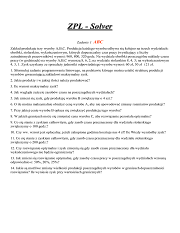ZPL - Solver Zadanie 1 ABC Zakład produkuje trzy wyroby A,B,C. Produkcja każdego wyrobu odbywa się kolejno na trzech wydziałach: obróbki, stolarskim, wykończeniowym, których dopuszczalny czas pracy (wynikający z liczby zatrudnionych pracowników) wynosi: 960, 800, 320 godz. Na wydziale obróbki poszczególne nakłady czasu pracy (w godzinach) na wyroby A,B,C wynoszą 8, 6, 2; na wydziale stolarskim 8, 4, 3; na wykończeniowym 4, 3, 1. Zysk uzyskany ze sprzedaży jednostki odpowiedniego wyrobu wynosi: 60 zł, 30 zł i 21 zł. 1. Sformułuj zadanie programowania liniowego, na podstawie którego można ustalić strukturę produkcji wyrobów gwarantującą zakładowi maksymalny zysk. 2. Jakie produkty i w jakiej ilości należy produkować? 3. Ile wynosi maksymalny zysk? 4. Jak wygląda zużycie zasobów czasu na poszczególnych wydziałach? 5. Jak zmieni się zysk, gdy produkcję wyrobu B zwiększymy o 4 szt.? 6. O ile można maksymalnie obniżyć cenę wyrobu A, aby nie spowodować zmiany rozmiarów produkcji? 7. Przy jakiej cenie wyrobu B opłaca się zwiększyć produkcję tego wyrobu? 8. W jakich granicach może się zmieniać cena wyrobu C, aby rozwiązanie pozostała optymalne? 9. Co się stanie z zyskiem całkowitym, gdy zasób czasu przeznaczony dla wydziału stolarskiego zwiększymy o 100 godz.? 10. Czy ww. wzrost jest opłacalny, jeżeli zakupiona godzina kosztuje nas 4 zł? Ile Wtedy wyniósłby zysk? 11. Co się stanie z zyskiem całkowitym, gdy zasób czasu przeznaczony dla wydziału stolarskiego zwiększymy o 200 godz.? 12. Czy rozwiązanie optymalne i zysk zmienią się gdy zasób czasu przeznaczony dla wydziału wykończeniowego nie będzie ograniczony? 13. Jak zmieni się rozwiązanie optymalne, gdy zasoby czasu pracy w poszczególnych wydziałach wzrosną odpowiednio o: 50%, 20%, 25%? 14. Jakie są możliwe zmiany wielkości produkcji poszczególnych wyrobów w granicach dopuszczalności rozwiązania? Ile wyniesie zysk przy wartościach granicznych? Microsoft Excel 8.0 Raport wyników Komórka celu (Maks) Komórka Nazwa $F$3 c f(x) Wartość początkowa Wartość końcowa 111 5760 Komórki decyzyjne Komórka Nazwa $B$2 xA $C$2 xB $D$2 xC Wartość początkowa Wartość końcowa 1 40 1 0 1 160 Warunki ograniczające Komórka Nazwa $F$5 Obróbka $F$6 Stolarski $F$7 Wykończeniowy $B$2 xA $C$2 xB $D$2 xC Wartość komórki 640 800 320 40 0 160 formuła $F$5<=$G$5 $F$6<=$G$6 $F$7<=$G$7 $B$2>=0 $C$2>=0 $D$2>=0 Status Nie wiążące Wiążące Wiążące Nie wiążące Wiążące Nie wiążące Luz 320 0 0 40 0 160 Microsoft Excel 8.0 Raport wrażliwości Komórki decyzyjne Komórka Nazwa $B$2 xA $C$2 xB $D$2 xC Wartość końcowa Przyrost krańcowy WspółczynnikDopuszczalny Dopuszczalny funkcji celu wzrost spadek 0 60 24 2,4 -3 30 3 1E+30 0 21 1,5 6 Cena dualna Prawa strona Dopuszczalny Dopuszczalny w. o. wzrost spadek 0 960 1E+30 320 6 800 160 160 3 320 80 53,33333333 40 0 160 Warunki ograniczające Komórka Nazwa $F$5 Obróbka $F$6 Stolarski $F$7 Wykończeniowy Wartość końcowa 640 800 320 Microsoft Excel 8.0 Raport granic Komórka $F$3 c f(x) Cel Nazwa Zmienne decyzyjne Komórka Nazwa $B$2 xA $C$2 xB $D$2 xC końcowa 5760 Dolna granica końcowa 40 0 160 0 0 0 Cel Wynik 3360 5760 2400 Górna granica 40 -2,4238E-10 160 Cel Wynik 5760 5760 5760 Zadanie 2 ROLNIK Rolnik posiada 60 t siana, 120 t kiszonki, 25 t zboża. Może on hodować owce i krowy oraz sprzedać nadwyżki zbóż po cenie 500 zł/t. Jedna krowa rocznie zjada 4 tony siana, 12 ton kiszonki i 2 tony zboża, a daje 3 tys. litrów mleka, za litr którego rolnik otrzymuje 0,75 zł. Jedna owca zjada 2 tony siana, 4 tony kiszonki, 2 tony zboża, a daje 6 kg wełny rocznie, którą można sprzedać za 150 zł/kg. 1. Sformułuj zadanie programowania liniowego, na podstawie którego można ustalić plan produkcji dla rolnika maksymalizujący jego przychód. 2. Co powinien robić rolnik, aby zmaksymalizować swój przychód? 3. Ile wynosi maksymalny przychód? 4. Jak wygląda wykorzystanie zapasów siana, kiszonki i zboża? 5. O ile spadnie oczekiwany przychód, jeżeli rolnik będzie hodował jedną owcę? 6. W jakich granicach może się zmieniać cena zboża, aby rozwiązanie pozostało optymalne? 7. Przy jakiej cenie zboża nie opłaca się jego sprzedawać? 8. Przy jakiej cenie opłacalna jest sprzedaż więcej niż 5 t zboża? 9. W jakich granicach może zmieniać się roczny przychód ze sprzedaży mleka od jednej krowy, aby rozwiązanie pozostało optymalne? 10. Przy jakim rocznym przychodzie ze sprzedaży mleka przestanie być opłacalna hodowla krów? Jaka jest minimalna cena mleka zapewniająca opłacalność hodowli krów? 11. Przy jakim rocznym przychodzie ze sprzedaży wełny z owcy zacznie być opłacalna ich hodowla? Jaki jest minimalna cena kg wełny zapewniająca opłacalność hodowli owiec? 12. Przy jakim zapasie siana pozostanie opłacalnym struktura produkcji polegająca na hodowli krów i sprzedaży nadwyżek zboża, przy zaniechaniu hodowli owiec? 13. Jak może się zmieniać zapas kiszonki, aby ogólna struktura produkcji pozostała optymalna? 14. Pojawia się możliwość sprzedaży kiszonki w cenie 150 zł/t. Czy w tych warunkach jest opłacalna dla rolnika sprzedaż posiadanych zapasów? 15. Cena kiszonki wynosi 94 zł/t. Czy opłaca się rolnikowi dokupić kiszonki? Ile tej kiszonki powinien dokupić? Ile na tym dodatkowo zarobi? 16. Rolnik ma możliwość dokupenia siana w cenie 50 zł/t. Czy to jest dla niego opłacalne? Rozwiązanie: x1 x2 x3 ilość hodo ilość hodo nadwyżka Rozwiązanie początkowe x1 x2 x3 x 1 1 c A 2 250 900 4 12 2 2 4 2 (1) (2) (3) Rozwiązanie końcowe x1 x2 T 500 f(x)=c x 3 650 6 <= 16 <= 5 = 1 60 120 25 x3 x 10 0 c A 2 250 900 4 12 2 2 4 2 (1) (2) (3) 1 5 T 500 f(x)=c x 1 25 000 40 <= 120 <= 25 = 60 120 25 Microsoft Excel 8.0a Raport wyników Komórka celu (Maks) Komórka Nazwa Wartość początkowa Wartość końcowa $O$25 f(x)=cTx 3 650 25 000 Komórki d