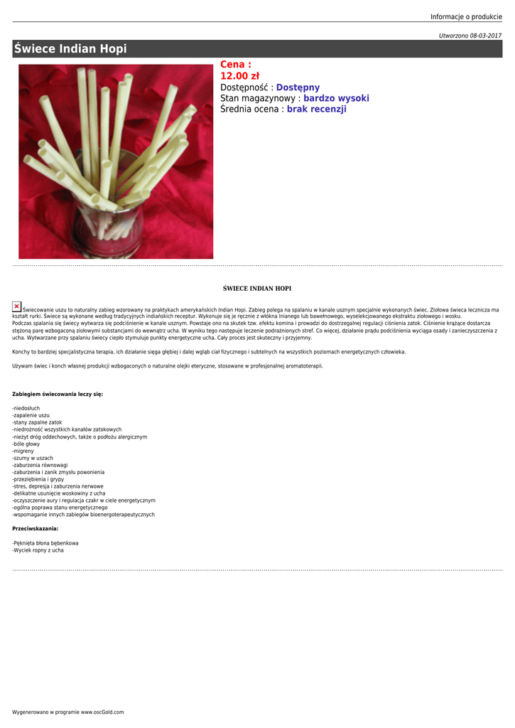 Informacje o produkcie Utworzono 08-03-2017 Świece Indian Hopi Cena : 12.00 zł Dostępność : Dostępny Stan magazynowy : bardzo wysoki Średnia ocena : brak recenzji ŚWIECE INDIAN HOPI Świecowanie uszu to naturalny zabieg wzorowany na praktykach amerykańskich Indian Hopi. Zabieg polega na spalaniu w kanale usznym specjalnie wykonanych świec. Ziołowa świeca lecznicza ma kształt rurki. Świece są wykonane według tradycyjnych indiańskich receptur. Wykonuje się je ręcznie z włókna lnianego lub bawełnowego, wyselekcjowanego ekstraktu ziołowego i wosku. Podczas spalania się świecy wytwarza się podciśnienie w kanale usznym. Powstaje ono na skutek tzw. efektu komina i prowadzi do dostrzegalnej regulacji ciśnienia zatok. Ciśnienie krążące dostarcza stężoną parę wzbogaconą ziołowymi substancjami do wewnątrz ucha. W wyniku tego następuje leczenie podrażnionych stref. Co więcej, działanie prądu podciśnienia wyciąga osady i zanieczyszczenia z ucha. Wytwarzane przy spalaniu świecy ciepło stymuluje punkty energetyczne ucha. Cały proces jest skuteczny i przyjemny. Konchy to bardziej specjalistyczna terapia, ich działanie sięga głębiej i dalej wgląb ciał fizycznego i subtelnych na wszystkich poziomach energetycznych człowieka. Używam świec i konch własnej produkcji wzbogaconych o naturalne olejki eteryczne, stosowane w profesjonalnej aromatoterapii. Zabiegiem świecowania leczy się: -niedosłuch -zapalenie uszu -stany zapalne zatok -niedrożność wszystkich kanałów zatokowych -nieżyt dróg oddechowych, także o podłożu alergicznym -bóle głowy -migreny -szumy w uszach -zaburzenia równowagi -zaburzenia i zanik zmysłu powonienia -przeziębienia i grypy -stres, depresja i zaburzenia nerwowe -delikatne usunięcie woskowiny z ucha -oczyszczenie aury i regulacja czakr w ciele energetycznym -ogólna poprawa stanu energetycznego -wspomaganie innych zabiegów bioenergoterapeutycznych Przeciwskazania: -Pęknięta błona bębenkowa -Wyciek ropny z ucha Wygenerowano w programie www.oscGold.com