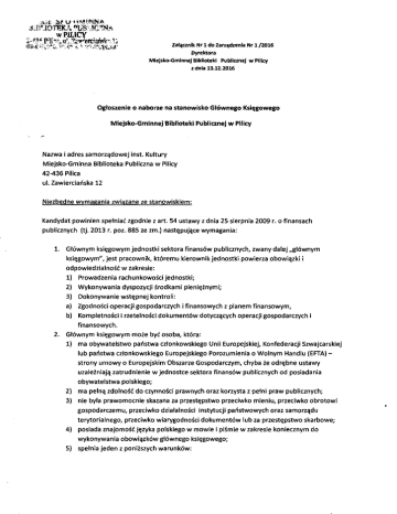 diBMOTBKA ^ m i C ^ A w PILICY " j' Załącznik Nr 1 do Zarządzenia Nr 1/2016 Dyrektora Miejsko-Gminnej Biblioteki Publicznej w Pilicy z dnia 13.12.2016 Ogłoszenie o naborze na stanowisko Głównego Księgowego Miejsko-Gminnej Biblioteki Publicznej w Pilicy Nazwa i adres samorządowej inst. Kultury Miejsko-Gminna Biblioteka Publiczna w Pilicy 42-436 Pilica ul. Zawierciańska 12 Niezbędne wymagania związane ze stanowiskiem: Kandydat powinien spełniać zgodnie z art. 54 ustawy z dnia 25 sierpnia 2009 r. o finansach publicznych (tj. 2013 r. poz. 885 ze zm.) następujące wymagania: 1. Głównym księgowym jednostki sektora finansów publicznych, zwany dalej „głównym księgowym", jest pracownik, któremu kierownik jednostki powierza obowiązki i odpowiedzialność w zakresie: 1) Prowadzenia rachunkowości jednostki; 2) Wykonywania dyspozycji środkami pieniężnymi; 3) Dokonywanie wstępnej kontroli: a) Zgodności operacji gospodarczych i finansowych z planem finansowym, b) Kompletności i rzetelności dokumentów dotyczących operacji gospodarczych i finansowych. 2. Głównym księgowym może być osoba, która: 1) ma obywatelstwo państwa członkowskiego Unii Europejskiej, Konfederacji Szwajcarskiej lub państwa członkowskiego Europejskiego Porozumienia o Wolnym Handlu (EFTA) strony umowy o Europejskim Obszarze Gospodarczym, chyba że odrębne ustawy uzależniają zatrudnienie w jednostce sektora finansów publicznych od posiadania obywatelstwa polskiego; 2) ma pełną zdolność do czynności prawnych oraz korzysta z pełni praw publicznych; 3) nie była prawomocnie skazana za przestępstwo przeciwko mieniu, przeciwko obrotowi gospodarczemu, przeciwko działalności instytucji państwowych oraz samorządu terytorialnego, przeciwko wiarygodności dokumentów lub za przestępstwo skarbowe; 4) posiada znajomość języka polskiego w mowie i piśmie w zakresie koniecznym do wykonywania obowiązków głównego księgowego; 5) spełnia jeden z poniższych warunków: a) ukończyła ekonomiczne jednolite studia magisterskie, ekonomiczne wyższe studia zawodowe, uzupełniające ekonomiczne studia magisterskie lub ekonomiczne studia podyplomowe i posiada co najmniej 5-letnią praktykę w księgowości, b) ukończyła średnią, policealną pub pomaturalną szkołę ekonomiczną i posiada co najmniej 6-letnią praktykę w księgowości, c) jest wpisana do rejestru biegłych rewidentów na podstawie odrębnych przepisów, d) posiada certyfikat księgowy uprawniający do usługowego prowadzenia ksiąg rachunkowych albo świadectwo kwalifikacyjne. Wymagania dodatkowe związane z zatrudnieniem na stanowisko, na które przeprowadzany iest -nabór: 1. Umiejętność obsługi komputera (Word, Exel, Internet) programów księgowych oraz sprzętu biurowego, 2. Znajomość gospodarki finansowej instytucji kultury, dyscypliny finansów publicznych, planu 3. Znajomość przepisów z zakresu ubezpieczeń społecznych i prawa podatkowego, 4. Umiejętność pracy w zespole, odpowiedzialność, sumienność i rzetelność, dobra organizacja kont, księgowości i klasyfikacji budżetowej, czasu pracy, 5. Umiejętność organizacji pracy, 6. Dyspozycyjność, komunikatywność, kreatywność i odporność na stres, Zakres obowiązków wykonywanych na stanowisku głównego księgowego: 1. Prowadzenie rachunkowości Miejsko-Gminnej Biblioteki Publicznej zgodnie z obowiązującymi przepisami, 2. Wykonywanie dyspozycji środkami pieniężnymi z rachunku instytucji kultury, 3. Sporządzanie niezbędnych dla bieżącego zarządzania przez Dyrektora instytucji kultury sprawozdań kwartalnych o realizacji planu finansowego, 4. Przygotowanie projektów budżetu instytucji kultury oraz harmonogramu wydatków oraz współpraca z Dyrektorem przy ustalaniu planu finansowego instytucji kultury, 5. Naliczania wynagrodzeń pracowniczych, zaliczek podatkowych, składek na ubezpieczenie społeczne i zdrowotne, potrąceń oraz terminowości ich przekazywania, 6. Nadzorowanie, przygotowanie i realizacja umów o pracę i umów cywilnoprawnych i prowadzenia obsługi księgowej, 7. Dokonywanie wstępnej kontroli zgodności operacji gospodarczych i finansowych z planem finansowym instytucji kultury, kompletności i rzetelności dokumentów dotyczących operacji gospodarczych i finansowych, 8. Prowadzenie ewidencji księgowej wyposażenia, sprzętu oraz innych wartości rzeczowych, środków trwałych ich umorzenia zgodnie z obowiązującymi przepisami, 9. Opracowanie dokumentów regulujących organizację rachunkowości w instytucjach kultury, 10. Znajomość planu kont, instrukcji obiegu dokumentów, instrukcji kasowej, instrukcji inwentaryzacji i innych zarządzeń wewnętrznych regulujących funkcjonowanie gospodarki finansowej instytucji kultury, 11. Obliczenie podatku dochodowego od osób prawnych oraz sporządzanie deklaracji tego podatku, 12. Obliczanie podatku dochodowego od osób fizycznych oraz sporządzanie deklaracji tego podatku, 13. Obsługa programu przeznaczonego do sporządzania, rozliczenia i przesłania drogą elektroniczną dokumentacji do ZUS i Urzędu Skarbowego, 14. Rozliczanie pozyskanych środków finansowych (w tym unijnych) na cele statutowe MiejskoGminnej Biblioteki Publicznej w Pilicy. 15. Wykonywanie innych nie wymienionych wyżej zadań, które z mocy prawa lub przepisów wewnętrznych wydanych przez Dyrektora jednostki należą do obowiązków Głównego Księgowego. Wymagane dokumenty: 1. 2. 3. 4. 5. CV, Kopia dokumentu potwierdzającego obywatelstwo polskie (dowód osobisty), List motywacyjny, Kserokopie świadectw pracy, Potwierdzenie za zgodność z oryginałem kserokopie dyplomów potwierdzających wykształcenie i kwalifikacje, 6. Kwestionariusz osobowy dla osoby ubiegającej się o zatrudnienie, 7. Aktualne oświadczenie kandydata o korzystaniu z pełni praw publicznych, 8. Aktualne zaświadczenie o niekaralności z Krajowego Rejestru Karnego lub oświadczenie o braku skazania prawomocnym wyr