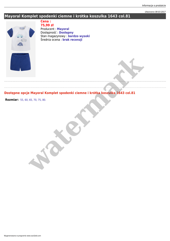 Informacje o produkcie Utworzono 08-03-2017 Mayoral Komplet spodenki ciemne i krótka koszulka 1643 col.81 Cena : 75,99 zł er m ar k Producent : Mayoral Dostępność : Dostępny Stan magazynowy : bardzo wysoki Średnia ocena : brak recenzji Dostępne opcje Mayoral Komplet spodenki ciemne i krótka koszulka 1643 col.81 w at Rozmiar: 55, 60, 65, 70, 75, 80. Wygenerowano w programie www.oscGold.com