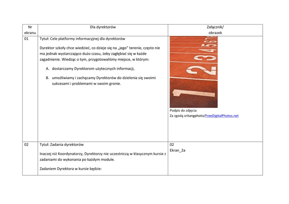 Nr Dla dyrektorów ekranu 01 Tytuł: Cele platformy informacyjnej dla dyrektorów Załącznik/ obrazek Dyrektor szkoły chce wiedzieć, co dzieje się na „jego” terenie, często nie ma jednak wystarczająco dużo czasu, żeby zagłębiać się w każde zagadnienie. Wiedząc o tym, przygotowaliśmy miejsce, w którym: A. dostarczamy Dyrektorom użytecznych informacji, B. umożliwiamy i zachęcamy Dyrektorów do dzielenia się swoimi sukcesami i problemami w swoim gronie. Podpis do zdjęcia: Za zgodą sritangphoto/FreeDigitalPhotos.net 02 Tytuł: Zadania dyrektorów Inaczej niż Koordynatorzy, Dyrektorzy nie uczestniczą w klasycznym kursie z zadaniami do wykonania po każdym module. Zadaniem Dyrektora w kursie będzie: 02 Ekran_2a korzystanie z zamieszczanych w kursie informacji (zakładka „Mój kurs”), zgłaszanie problemów i udzielanie rad – w korespondencji z moderatorem i na forum kursu. Taka formuła kursu różni się od tych stosowanych do tej pory w CEO. Chcemy, żeby kurs rozwijał się razem z nami, będziemy go dostosowywać do potrzeb użytkowników. Ekran_2b 03 Tytuł: Kurs jako źródło informacji W zakresie dostarczania potrzebnych informacji i materiałów planujemy przekazywanie: informacji – na czym polega kurs dla koordynatorów przedmiotowych i szkolnych, jakie mają oni zadania (zakładka „Koordynatorzy”), samouczków do nauki programów i aplikacji (zakładka „Samouczki”), przykładów dobrych praktyk organizacyjnych powstałych w ramach pilotażowego programu „Cyfrowa Szkoła” (zakładka dobre praktyki 2012/2013), Podpis do ilustracji: Schemat obiegu dokumentów 03 05 przykładów dobrych praktyk wykorzystywania TIK w pracy szkoły zebranych w edycji 2013/2014. Tytuł: Wymiana dobrych praktyk z moderatorem 05 Wymianę doświadczeń i porad między dyrektorami planujemy zorganizować na stronach kursu. Będziecie Państwo podzieleni na grupy, którą będzie kierował moderator. Zachęcamy do zgłaszania mu wątpliwości i problemów pojawiających się w związku z realizacją programu Aktywna edukacja oraz zmianami zachodzącą w szkole w wyniku wprowadzenia TIK. Liczymy na to, że inni dyrektorzy, którzy mieli podobne doświadczenia i już poradzili sobie z daną trudnością, będą służyć pomocą i radą. Podpis do zdjęcia: Za zgodą africa/FreeDigitalPhotos.net 06 Tytuł: Rola moderatora Moderator będzie zachęcał Państwa do dzielenia się doświadczeniami, które mogą być pomocne w rozwiązywaniu problemów pojawiających się w innych szkołach. Postara się również zamieszczać pytania pochodzące z kursów dla koordynatorów. Dyrektorzy będzie wspomagać nie tylko innych dyrektorów, lecz także koordynatorów i pozostałych nauczycieli. 06 07 Zakładka: Forum Wypowiadanie się na forum stanowi drugą, obok korespondencji z moderatorem, formę aktywności dyrektora w kursie. Daje ono możliwość bezpośredniego dzielenia się problemami i wymiany porad. Aktywność na forum jest rejestrowana w dziale „Moje statystyki” -> „Liczba wypowiedzi na forum”. 08 Tytuł: Pierwsze materiały w zakładkach 08 Na następnych ekranach zamieszczamy informację o tym, co zamieściliśmy w poszczególnych zakładkach. O nowościach będziemy informować na stronie głównej kursu oraz w newsletterach wysyłanych na Państwa adresy mailowe. 09 Tytuł: Zakładka koordynatorzy 08 Za zgodą Michal Marcol/FreeDigitalPhotos.net W zakładce „Koordynatorzy” będziemy sukcesywnie zamieszczać materiały z kursu dla koordynatorów. Zachęcamy do przeglądania ich w wolnej chwili. Wychodząc z założenia, że nic dobrego nie zadzieje się w szkole bez opieki i wsparcia dyrektora, apelujemy, abyście Państwo pomagali koordynatorom w swojej szkole. 10 Zakładka: Dobre praktyki 2012/2013 09 W zakładce dobre praktyki załączamy materiał zebrany podczas pilotażowej edycji programu rządowego „Cyfrowa Szkoła”. Będą mogli Państwo zapoznać się z problemami, z jakimi borykali się dyrektorzy szkół, którzy dostali pieniądze na sprzęt. Dobre praktyki mogą być dla Państwa zarówno inspiracją przy tworzeniu własnych, jak i informacją na temat tego, co działo się w zeszłym roku. Polecamy również zakładkę „Dobre praktyki” na stronie internetowej programu Aktywna edukacja – zarówno organizacyjne, jak i przedmiotowe. Liczymy, że Państwo jako główni nauczyciele nauczycieli w szkole zachęcicie ich do wypróbowania przedstawionych pomysłów w ich pracy z uczniami oraz do wypracowywania nowych pomysłów efektywnego wykorzystywania TiK. 11 Zakładka: Samouczki 10 W zakładce samouczki zamieściliśmy instrukcje obsługi kilkunastu najbardziej popularnych programów i aplikacji. Samouczki problemowe, w których użytkownik poznaje nowe zagadnienia zgodnie z cyklem Kolba są dostępne na stronie internetowej programu. 12 Tytuł: Co dalej? Następnych informacji szukajcie Państwo na stronie głównej kursu. Wszelkie uwagi i potrzeby prosimy zgłaszać do moderatora w kursie lub kierownika kursu. 12