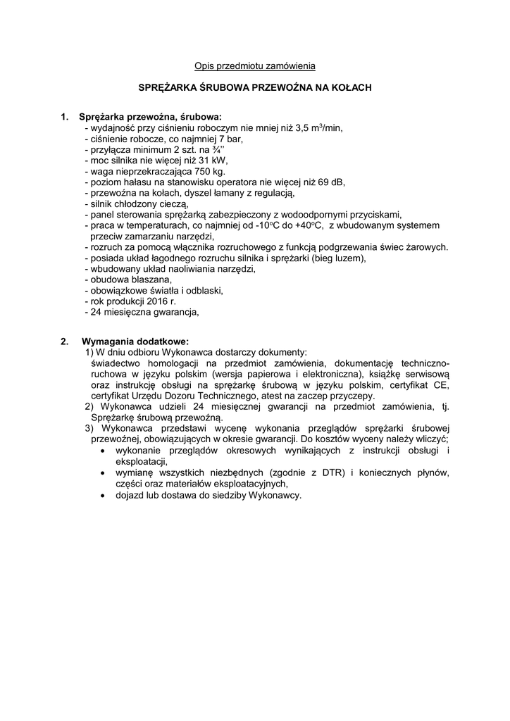 Opis przedmiotu zamówienia SPRĘŻARKA ŚRUBOWA PRZEWOŹNA NA KOŁACH 1. Sprężarka przewoźna, śrubowa: - wydajność przy ciśnieniu roboczym nie mniej niż 3,5 m3/min, - ciśnienie robocze, co najmniej 7 bar, - przyłącza minimum 2 szt. na ¾’’ - moc silnika nie więcej niż 31 kW, - waga nieprzekraczająca 750 kg. - poziom hałasu na stanowisku operatora nie więcej niż 69 dB, - przewoźna na kołach, dyszel łamany z regulacją, - silnik chłodzony cieczą, - panel sterowania sprężarką zabezpieczony z wodoodpornymi przyciskami, - praca w temperaturach, co najmniej od -10oC do +40oC, z wbudowanym systemem przeciw zamarzaniu narzędzi, - rozruch za pomocą włącznika rozruchowego z funkcją podgrzewania świec żarowych. - posiada układ łagodnego rozruchu silnika i sprężarki (bieg luzem), - wbudowany układ naoliwiania narzędzi, - obudowa blaszana, - obowiązkowe światła i odblaski, - rok produkcji 2016 r. - 24 miesięczna gwarancja, 2. Wymagania dodatkowe: 1) W dniu odbioru Wykonawca dostarczy dokumenty: świadectwo homologacji na przedmiot zamówienia, dokumentację technicznoruchowa w języku polskim (wersja papierowa i elektroniczna), książkę serwisową oraz instrukcję obsługi na sprężarkę śrubową w języku polskim, certyfikat CE, certyfikat Urzędu Dozoru Technicznego, atest na zaczep przyczepy. 2) Wykonawca udzieli 24 miesięcznej gwarancji na przedmiot zamówienia, tj. Sprężarkę śrubową przewoźną. 3) Wykonawca przedstawi wycenę wykonania przeglądów sprężarki śrubowej przewoźnej, obowiązujących w okresie gwarancji. Do kosztów wyceny należy wliczyć; wykonanie przeglądów okresowych wynikających z instrukcji obsługi i eksploatacji, wymianę wszystkich niezbędnych (zgodnie z DTR) i koniecznych płynów, części oraz materiałów eksploatacyjnych, dojazd lub dostawa do siedziby Wykonawcy.