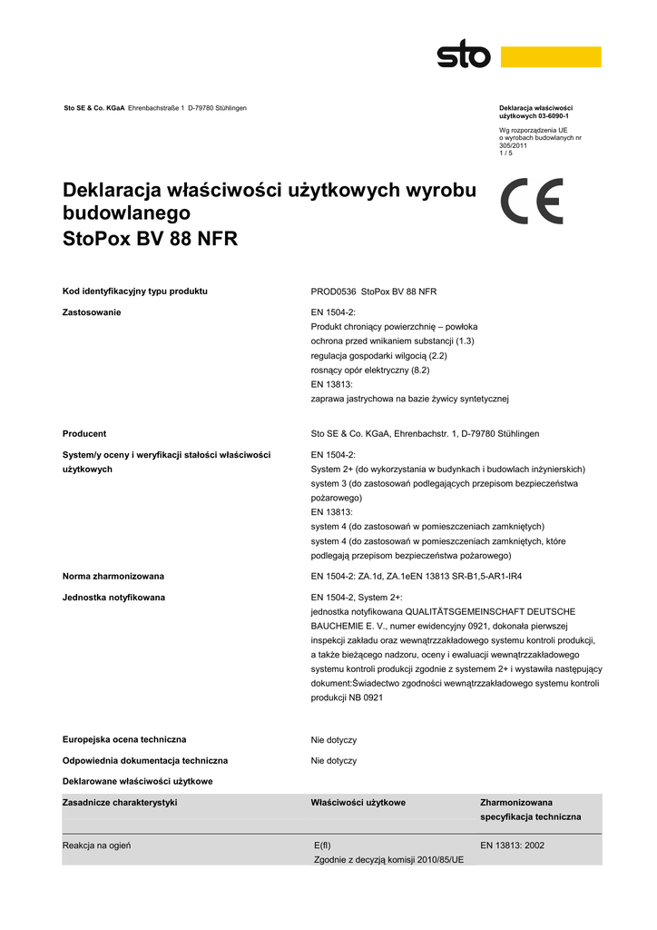 Sto SE & Co. KGaA Ehrenbachstraße 1 D-79780 Stühlingen Deklaracja właściwości użytkowych 03-6090-1 Wg rozporządzenia UE o wyrobach budowlanych nr 305/2011 1/5 Deklaracja właściwości użytkowych wyrobu budowlanego StoPox BV 88 NFR Kod identyfikacyjny typu produktu Zastosowanie PROD0536 StoPox BV 88 NFR EN 1504-2: Produkt chroniący powierzchnię – powłoka ochrona przed wnikaniem substancji (1.3) regulacja gospodarki wilgocią (2.2) rosnący opór elektryczny (8.2) EN 13813: zaprawa jastrychowa na bazie żywicy syntetycznej Producent Sto SE & Co. KGaA, Ehrenbachstr. 1, D-79780 Stühlingen System/y oceny i weryfikacji stałości właściwości EN 1504-2: użytkowych System 2+ (do wykorzystania w budynkach i budowlach inżynierskich) system 3 (do zastosowań podlegających przepisom bezpieczeństwa pożarowego) EN 13813: system 4 (do zastosowań w pomieszczeniach zamkniętych) system 4 (do zastosowań w pomieszczeniach zamkniętych, które podlegają przepisom bezpieczeństwa pożarowego) Norma zharmonizowana EN 1504-2: ZA.1d, ZA.1eEN 13813 SR-B1,5-AR1-IR4 Jednostka notyfikowana EN 1504-2, System 2+: jednostka notyfikowana QUALITÄTSGEMEINSCHAFT DEUTSCHE BAUCHEMIE E. V., numer ewidencyjny 0921, dokonała pierwszej inspekcji zakładu oraz wewnątrzzakładowego systemu kontroli produkcji, a także bieżącego nadzoru, oceny i ewaluacji wewnątrzzakładowego systemu kontroli produkcji zgodnie z systemem 2+ i wystawiła następujący dokument:Świadectwo zgodności wewnątrzzakładowego systemu kontroli produkcji NB 0921 Europejska ocena techniczna Nie dotyczy Odpowiednia dokumentacja techniczna Nie dotyczy Deklarowane właściwości użytkowe Zasadnicze charakterystyki Właściwości użytkowe Zharmonizowana specyfikacja techniczna Reakcja na ogień E(fl) Zgodnie z decyzją komisji 2010/85/UE EN 13813: 2002 Sto SE & Co. KGaA Ehrenbachstraße 1 D-79780 Stühlingen Deklaracja właściwości użytkowych 03-6090-1 Wg rozporządzenia UE o wyrobach budowlanych nr 305/2011 2/5 z dnia 09.02.2010 r. produkt posiada klasę odporności na działanie ognia E(fl), bez konieczności przeprowadzania badania. Reakcja na ogień E(fl) EN 1504-2:2004 Opór dyfuzyjny względny warstwy wierzchniej Klasa III EN 1504-2:2004 Przyczepność ≥B 1,5 EN 13813:2002 Pochłanianie dźwięku NPD EN 13813:2002 Przepuszczalność wody NPD EN 13813:2002 Odporność na ścieranie ≤AR1.. EN 13813:2002 Przyczepność przy odrywaniu ≥2,0 (1,5) N/mm² EN 1504-2:2004 Właściwości antystatyczne NPD EN 1504-2:2004 Odporność chemiczna NPD EN 13813:2002 Uwalnianie substancji powodujących korozję SR EN 13813:2002 Nacinanie NPD EN 1504-2:2004 Odporność na poślizg NPD EN 1504-2:2004 Sztuczne starzenie NPD EN 1504-2:2004 Skurcz liniowy NPD EN 1504-2:2004 Izolacja akustyczna NPD EN 13813:2002 Izolacja cieplna NPD EN 13813:2002 Odporność na szok termiczny NPD EN 1504-2:2004 0,5 Absorpcja kapilarna i przepuszczalność wody w < 0,1 kg/(m²*h ) EN 1504-2:2004 Odporność na uderzenia ≥IR4 EN 13813:2002 Współczynnik rozszerzalności cieplnej NPD EN 1504-2:2004 Odporność chemiczna NPD EN 1504-2:2004 Substancje niebezpieczne NPD EN 1504-2:2004 Przyczepność do wilgotnego betonu NPD EN 1504-2:2004 Kompatybilność cieplna NPD EN 1504-2:2004 Przepuszczalność dwutlenku węgla Sd > 50 m EN 1504-2:2004 Zdolność do mostkowania rys NPD EN 1504-2:2004 Sto SE & Co. KGaA Ehrenbachstraße 1 D-79780 Stühlingen Deklaracja właściwości użytkowych 03-6090-1 Wg rozporządzenia UE o wyrobach budowlanych nr 305/2011 3/5 Właściwości użytkowe wyrobu odpowiadają deklarowanym właściwościom użytkowym. Niniejsza deklaracja właściwości użytkowych wydana zostaje na wyłączną odpowiedzialność producenta. W imieniu producenta podpisał: 09.06.2015 Sto SE & Co. KGaA D-79780 Stühlingen Załącznik: Karta charakterystyki Z up. dr Hans Klein/Kierownik Działu Aprobat i Badań Sto SE & Co. KGaA Ehrenbachstraße 1 D-79780 Stühlingen Deklaracja właściwości użytkowych 03-6090-1 Wg rozporządzenia UE o wyrobach budowlanych nr 305/2011 4/5 Sto SE & Co. KGaA Ehrenbachstraße 1 D-79780 Stühlingen 03-6090-1 14 NB 0921 PROD0536 StoPox BV 88 NFR EN 1504-2: ZA.1d, ZA.1e EN 13813 SR-B1,5-AR1-IR4 EN 1504-2: Produkt chroniący powierzchnię – powłoka ochrona przed wnikaniem substancji (1.3) regulacja gospodarki wilgocią (2.2) rosnący opór elektryczny (8.2) EN 13813: zaprawa jastrychowa na bazie żywicy syntetycznej Reakcja na ogień E(fl) Zgodnie z decyzją komisji 2010/85/UE z dnia 09.02.2010 r. produkt posiada klasę odporności na działanie ognia E(fl), bez konieczności przeprowadzania badania. Reakcja na ogień E(fl) Przyczepność ≥B 1,5 Opór dyfuzyjny względny warstwy wierzchniej Klasa III Pochłanianie dźwięku NPD Przepuszczalność wody NPD Odporność na ścieranie ≤AR1 Przyczepność przy odrywaniu ≥2,0 (1,5) N/mm² Właściwości antystatyczne NPD Odporność chemiczna NPD Uwalnianie substancji powodujących korozję SR Nacinanie NPD Odporność na poślizg NPD Sztuczne starzenie NPD Skurcz liniowy NPD Izolacja akustyczna NPD Izolacja cieplna NPD Odporność na szok termiczny NPD Sto SE & Co. KGaA Ehrenbachstraße 1 D-79780 Stühlingen Deklaracja właściwości użytkowych 03-6090-1 Wg rozporządzenia UE o wyrobach budowlanych nr 305/2011 5/5 Absorpcja kapilarna i przepuszczalność wody w < 0,1 kg/(m²*h0,5) Odporność na uderzenia ≥IR4 Współczynnik rozszerzalności cieplnej NPD Odporność chemiczna NPD Substancje niebezpieczne NPD Przyczepność do wilgotnego betonu NPD Kompatybilność cieplna NPD Przepuszczalność dwutlenku węgla Sd > 50 m Zdolność do mostkowania rys NPD