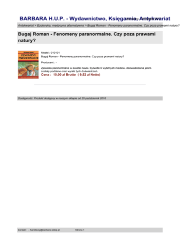 Utworzono Antykwariat : 08 marzec 2017 BARBARA H.U.P. - Wydawnictwo, Księgarnia, Antykwariat > Ezoteryka, medycyna alternatywna > Bugaj Roman - Fenomeny paranormalne. Czy poza prawami natury? Bugaj Roman - Fenomeny paranormalne. Czy poza prawami natury? Model : 010101 Bugaj Roman - Fenomeny paranormalne. Czy poza prawami natury? Producent : Zjawiska paranormalne w świetle nauki. Sylwetki 6 wybitnych mediów, doświadczenia jakim zostały poddane oraz wyniki tych doświadczeń. Cena : 10,00 zł Brutto ( 9,52 zł Netto) Dostępność: Produkt dostępny w naszym sklepie od 20 październik 2016 kontakt : - [email protected] Strona 1