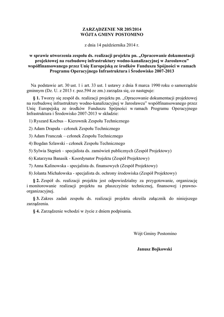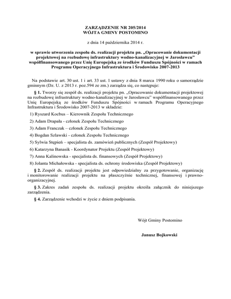 ZARZĄDZENIE NR 205/2014 WÓJTA GMINY POSTOMINO z dnia 14 października 2014 r. w sprawie utworzenia zespołu ds. realizacji projektu pn. „Opracowanie dokumentacji projektowej na rozbudowę infrastruktury wodno-kanalizacyjnej w Jarosławcu” współfinansowanego przez Unię Europejską ze środków Funduszu Spójności w ramach Programu Operacyjnego Infrastruktura i Środowisko 2007-2013 Na podstawie art. 30 ust. 1 i art. 33 ust. 1 ustawy z dnia 8 marca 1990 roku o samorządzie gminnym (Dz. U. z 2013 r. poz.594 ze zm.) zarządza się, co następuje: § 1. Tworzy się zespół ds. realizacji projektu pn. „Opracowanie dokumentacji projektowej na rozbudowę infrastruktury wodno-kanalizacyjnej w Jarosławcu” współfinansowanego przez Unię Europejską ze środków Funduszu Spójności w ramach Programu Operacyjnego Infrastruktura i Środowisko 2007-2013 w składzie: 1) Ryszard Kocbus – Kierownik Zespołu Technicznego 2) Adam Drapała - członek Zespołu Technicznego 3) Adam Franczak – członek Zespołu Technicznego 4) Bogdan Szlawski - członek Zespołu Technicznego 5) Sylwia Stępień – specjalista ds. zamówień publicznych (Zespół Projektowy) 6) Katarzyna Banasik - Koordynator Projektu (Zespół Projektowy) 7) Anna Kalinowska - specjalista ds. finansowych (Zespół Projektowy) 8) Jolanta Michałowska - specjalista ds. ochrony środowiska (Zespół Projektowy) § 2. Zespół ds. realizacji projektu jest odpowiedzialny za przygotowanie, organizację i monitorowanie realizacji projektu na płaszczyźnie technicznej, finansowej i prawnoorganizacyjnej. § 3. Zakres zadań zespołu ds. realizacji projektu określa załącznik do niniejszego zarządzenia. § 4. Zarządzenie wchodzi w życie z dniem podpisania. Wójt Gminy Postomino Janusz Bojkowski Załącznik Nr 1 do Zarządzenia Nr 205/2014 Wójta Gminy Postomino z dnia 14 października 2014 r. Zadania zespołu ds. realizacji projektu pn. „Opracowanie dokumentacji projektowej na rozbudowę infrastruktury wodno-kanalizacyjnej w Jarosławcu” współfinansowanego przez Unię Europejską ze środków Funduszu Spójności w ramach Programu Operacyjnego Infrastruktura i Środowisko 2007-2013 Zespół Techniczny: - odpowiada za przygotowanie SIWZ oraz za współpracę z wykonawcą usługi - koordynuje realizację zamówienia - weryfikuje zgodność przedmiotu zamówienia z zapisami umowy - dokonuje odbioru przedmiotu zamówienia - zatwierdza dokumenty finansowe związane z realizacją umowy na wykonanie dokumentacji projektowej w formie pieczątki „Sprawdzono pod względem merytorycznym” Zespół Projektowy: Specjalista ds. zamówień publicznych: - odpowiada za przygotowanie i koordynację przetargu Koordynator Projektu: - odpowiada za monitoring realizacji projektu - koordynuje pracą Zespołu Projektowego i Zespołu Technicznego - potwierdza kwalifikowalność wydatków zgodnie z „Wytycznymi w zakresie kwalifikowania wydatków w ramach POIiŚ” oraz zgodność wydatków z wnioskiem o dofinansowanie projektu dokonując opisu dokumentu finansowego - przygotowuje wnioski o płatność - odpowiada za promocję projektu - odpowiada za kontakty z IW Specjalista ds. finansowych: - odpowiada za obsługę finansową zadania, w tym prowadzenie prawidłowej księgowości projektu - sprawdza dokumenty finansowe pod względem formalno-rachunkowym oraz sporządza dekretację księgową, a następnie przekazuje do ostatecznego zatwierdzenia - odpowiada za przygotowanie raportów finansowych - odpowiada za dokonanie płatności dla wykonawców Specjalista ds. ochrony środowiska: - odpowiada za przygotowanie niezbędnych dokumentów środowiskowych
