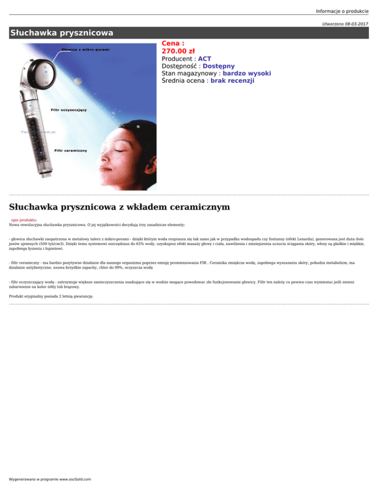 Informacje o produkcie Utworzono 08-03-2017 Słuchawka prysznicowa Cena : 270.00 zł Producent : ACT Dostępność : Dostępny Stan magazynowy : bardzo wysoki Średnia ocena : brak recenzji Słuchawka prysznicowa z wkładem ceramicznym opis produktu: Nowa rewolucyjna słuchawka prysznicowa. O jej wyjątkowości decydują trzy zasadnicze elementy: - głowica słuchawki zaopatrzona w metalowy talerz z mikro-porami - dzięki którym woda rozprasza się tak samo jak w przypadku wodospadu czy fontanny (efekt Lenarda), generowana jest duża ilośc jonów ujemnych (500 tyś/cm3). Dzięki temu systemowi oszczędzasz do 65% wody, uzyskujesz efekt masaży głowy i ciała, nawilżenia i zmniejszenia uczucia ściągania skóry, włosy są gładkie i miękkie, zapobiega łysieniu i łupieżowi. - filtr ceramiczny - ma bardzo pozytywne działanie dla naszego organizmu poprzez emisję promieniowania FIR . Ceramika zmiękcza wodę, zapobiega wysuszaniu skóry, pobudza metabolizm, ma działanie antybiotyczne, usuwa brzydkie zapachy, chlor do 99%, oczyszcza wodę - filtr oczyszczający wodę - zatrzymuje większe zanieczyszczenia osadzające się w wodzie mogące powodowac złe funkcjonowanie głowicy. Filtr ten należy co pewien czas wymieniac jeśli zmieni zabarwienie na kolor żółty lub brązowy. Produkt oryginalny posiada 2 letnią gwarancję. Wygenerowano w programie www.oscGold.com