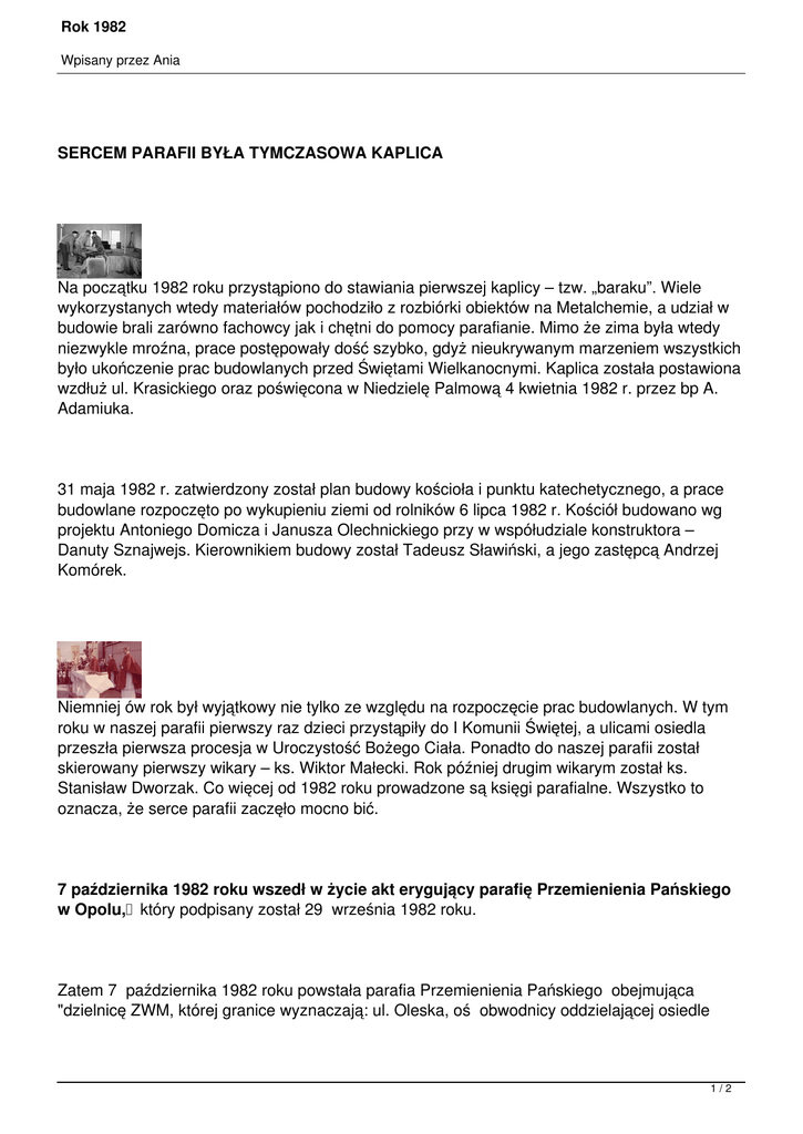 Rok 1982 Wpisany przez Ania SERCEM PARAFII BYŁA TYMCZASOWA KAPLICA Na początku 1982 roku przystąpiono do stawiania pierwszej kaplicy – tzw. „baraku”. Wiele wykorzystanych wtedy materiałów pochodziło z rozbiórki obiektów na Metalchemie, a udział w budowie brali zarówno fachowcy jak i chętni do pomocy parafianie. Mimo że zima była wtedy niezwykle mroźna, prace postępowały dość szybko, gdyż nieukrywanym marzeniem wszystkich było ukończenie prac budowlanych przed Świętami Wielkanocnymi. Kaplica została postawiona wzdłuż ul. Krasickiego oraz poświęcona w Niedzielę Palmową 4 kwietnia 1982 r. przez bp A. Adamiuka. 31 maja 1982 r. zatwierdzony został plan budowy kościoła i punktu katechetycznego, a prace budowlane rozpoczęto po wykupieniu ziemi od rolników 6 lipca 1982 r. Kościół budowano wg projektu Antoniego Domicza i Janusza Olechnickiego przy w współudziale konstruktora – Danuty Sznajwejs. Kierownikiem budowy został Tadeusz Sławiński, a jego zastępcą Andrzej Komórek. Niemniej ów rok był wyjątkowy nie tylko ze względu na rozpoczęcie prac budowlanych. W tym roku w naszej parafii pierwszy raz dzieci przystąpiły do I Komunii Świętej, a ulicami osiedla przeszła pierwsza procesja w Uroczystość Bożego Ciała. Ponadto do naszej parafii został skierowany pierwszy wikary – ks. Wiktor Małecki. Rok później drugim wikarym został ks. Stanisław Dworzak. Co więcej od 1982 roku prowadzone są księgi parafialne. Wszystko to oznacza, że serce parafii zaczęło mocno bić. 7 października 1982 roku wszedł w życie akt erygujący parafię Przemienienia Pańskiego w Opolu, który podpisany został 29 września 1982 roku. Zatem 7 października 1982 roku powstała parafia Przemienienia Pańskiego obejmująca "dzielnicę ZWM, której granice wyznaczają: ul. Oleska, oś obwodnicy oddzielającej osiedle 1/2 Rok 1982 Wpisany przez Ania ZWM od Opola-Gosławic, pole między osiedlem ZWM II i Opolem (za ulicą Ozimską), oraz tory kolejowe aż do Dworca Wschodniego, wyłączone z dot. parafii Opole-Gosławice". Jej proboszczem tego samego dnia mianowano ks. Antoniego Grycana, który już od drugiej połowy 1981 roku duszpasterzował mieszkańcom. Na zdjęciach: Budowa kaplicy oraz jej poświęcenie - Msza Św. celebrowana 4 kwietnia 1982 r. przez bp. A. Adamiuka 2/2