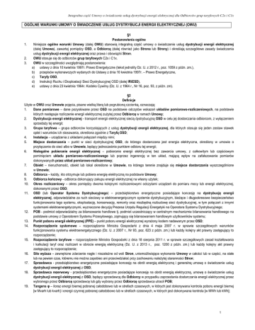 Integralna część Umowy o świadczenie usług dystrybucji energii elektrycznej dla Odbiorców grup taryfowych C2x i C1x OGÓLNE WARUNKI UMOWY O ŚWIADCZENIE USŁUG DYSTRYBUCJI ENERGII ELEKTRYCZNEJ (OWU) 1. 2. 3. §1 Postanowienia ogólne Niniejsze ogólne warunki Umowy (dalej OWU) stanowią integralną część umowy o świadczenie usług dystrybucji energii elektrycznej (dalej Umowa), zawartej pomiędzy OSD, a Odbiorcą (dalej również jako Strona lub Strony) i określają szczegółowe zasady świadczenia usług dystrybucji energii elektrycznej oraz prawa i obowiązki Stron. OWU stosuje się do odbiorców grup taryfowych C2x i C1x. OWU w szczególności uwzględniają postanowienia: a) ustawy z dnia 10 kwietnia 1997r. Prawo Energetyczne (tekst jednolity Dz. U. z 2012 r., poz. 1059 z późn. zm.), b) przepisów wykonawczych wydanych do Ustawy z dnia 10 kwietnia 1997r. – Prawo Energetyczne, c) Taryfy OSD, d) Instrukcji Ruchu i Eksploatacji Sieci Dystrybucyjnej OSD (dalej IRiESD), e) ustawy z dnia 23 kwietnia 1964r. Kodeks Cywilny (Dz. U. z 1964 r., Nr 16, poz. 93, z późn. zm). §2 Definicje Użyte w OWU oraz Umowie pojęcia, pisane wielką literą lub pogrubioną czcionką, oznaczają: 1. Dane pomiarowe – dane pozyskiwane przez OSD na podstawie odczytów wskazań układów pomiarowo-rozliczeniowych, na podstawie których następuje rozliczenie energii elektrycznej zużytej przez Odbiorcę w ramach Umowy; 2. Dystrybucja energii elektrycznej - transport energii elektrycznej siecią dystrybucyjną OSD w celu jej dostarczania odbiorcom, z wyłączeniem sprzedaży tej energii; 3. Grupa taryfowa – grupa odbiorców korzystających z usług dystrybucji energii elektrycznej, dla których stosuje się jeden zestaw stawek opłat i warunków ich stosowania, określona zgodnie z Taryfą OSD; 4. Instalacja – urządzenia z układami połączeń między nimi; 5. Miejsce dostarczania – punkt w sieci dystrybucyjnej OSD, do którego dostarczana jest energia elektryczna, określony w umowie o przyłączenie do sieci albo w Umowie, będący jednocześnie punktem odbioru tej energii; 6. Nielegalne pobieranie energii elektrycznej – pobieranie energii elektrycznej bez zawarcia umowy, z całkowitym lub częściowym pominięciem układu pomiarowo-rozliczeniowego lub poprzez ingerencję w ten układ, mającą wpływ na zafałszowanie pomiarów dokonywanych przez układ pomiarowo-rozliczeniowy; 7. Obiekt – nieruchomość, obiekt lub lokal określone w Umowie, na którego terenie znajduje się miejsce dostarczania wyszczególnione w Umowie; 8. Odbiorca – każdy, kto otrzymuje lub pobiera energię elektryczną na podstawie Umowy; 9. Odbiorca końcowy - odbiorca dokonujący zakupu energii elektrycznej na własny użytek; 10. Okres rozliczeniowy – okres pomiędzy dwoma kolejnymi rozliczeniowymi odczytami urządzeń do pomiaru mocy lub energii elektrycznej, dokonanymi przez OSD; 11. OSD (lub Operator Systemu Dystrybucyjnego) – przedsiębiorstwo energetyczne posiadające koncesję na dystrybucję energii elektrycznej, odpowiedzialne za ruch sieciowy w elektroenergetycznym systemie dystrybucyjnym, bieżące i długookresowe bezpieczeństwo funkcjonowania tego systemu, eksploatację, konserwację, remonty oraz niezbędną rozbudowę sieci dystrybucyjnej, w tym połączeń z innymi systemami elektroenergetycznymi, wyznaczone decyzją Prezesa Urzędu Regulacji Energetyki na Operatora Systemu Dystrybucyjnego; 12. POB - podmiot odpowiedzialny za bilansowanie handlowe tj. podmiot uczestniczący w centralnym mechanizmie bilansowania handlowego na podstawie umowy z Operatorem Systemu Przesyłowego, zajmujący się bilansowaniem handlowym użytkowników systemu; 13. Punkt poboru energii elektrycznej (PPE) – punkt poboru energii elektrycznej wyrażony kodem nadawanym przez OSD; 14. Rozporządzenie systemowe – rozporządzenie Ministra Gospodarki z dnia 4 maja 2007 r. w sprawie szczegółowych warunków funkcjonowania systemu elektroenergetycznego (Dz. U. z 2007 r., Nr 93, poz. 623 z późn. zm.) lub każdy kolejny akt prawny zastępujący to rozporządzenie; 15. Rozporządzenie taryfowe – rozporządzenie Ministra Gospodarki z dnia 18 sierpnia 2011 r. w sprawie szczegółowych zasad kształtowania i kalkulacji taryf oraz rozliczeń w obrocie energią elektryczną (Dz. U. z 2013 r., poz. 1200 z późn. zm.) lub każdy kolejny akt prawny zastępujący to rozporządzenie; 16. Siła wyższa – zewnętrzne zdarzenie nagłe i niezależne od woli Stron, uniemożliwiające wykonanie Umowy w całości lub w części, na stałe lub na pewien czas, któremu nie można zapobiec ani przeciwdziałać przy zachowaniu należytej staranności Stron; 17. Sprzedawca - przedsiębiorstwo energetyczne posiadające koncesję na obrót energią elektryczną i generalną umowę o świadczenie usług dystrybucji energii elektrycznej z OSD; 18. Sprzedawca rezerwowy - przedsiębiorstwo energetyczne posiadające koncesję na obrót energią elektryczną, umowę o świadczenie usług dystrybucji energii elektrycznej z OSD, będący sprzedawcą dla Odbiorcy w przypadku zaprzestania dostarczania energii elektrycznej przez wybranego przez Odbiorcę sprzedawcę lub gdy wybrany przez Odbiorcę sprzedawca utracił POB; 19. Tangens φ – iloraz energii biernej pobranej całodobowo lub w strefach czasowych, w których jest dokonywana kontrola poboru energii biernej [w Mvarh lub kvarh] i energii czynnej pobranej całodobowo lub w strefach czasowych, w których jest dokonywana kontrola [w MWh lub kWh]; 1 Integralna część Umowy o świadczenie usług dystrybucji energii elektrycznej dla Odbiorców grup taryfowych C2x i C1x 20. Taryfa OSD – aktualny zbiór stawek opłat z tytułu dystrybucji energii elektrycznej oraz warunków ich stosowania opracowany przez OSD i wprowadzony do stosowania, jako obowiązujący dla określonych w nim Odbiorców, w trybie określonym Ustawą, po zatwierdzeniu go decyzją Prezesa Urzędu Regulacji Energetyki