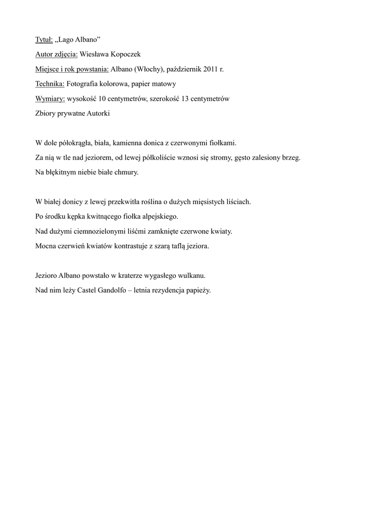 Tytuł: „Lago Albano” Autor zdjęcia: Wiesława Kopoczek Miejsce i rok powstania: Albano (Włochy), październik 2011 r. Technika: Fotografia kolorowa, papier matowy Wymiary: wysokość 10 centymetrów, szerokość 13 centymetrów Zbiory prywatne Autorki W dole półokrągła, biała, kamienna donica z czerwonymi fiołkami. Za nią w tle nad jeziorem, od lewej półkoliście wznosi się stromy, gęsto zalesiony brzeg. Na błękitnym niebie białe chmury. W białej donicy z lewej przekwitła roślina o dużych mięsistych liściach. Po środku kępka kwitnącego fiołka alpejskiego. Nad dużymi ciemnozielonymi liśćmi zamknięte czerwone kwiaty. Mocna czerwień kwiatów kontrastuje z szarą taflą jeziora. Jezioro Albano powstało w kraterze wygasłego wulkanu. Nad nim leży Castel Gandolfo – letnia rezydencja papieży.