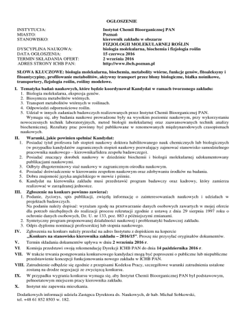 OGŁOSZENIE INSTYTUCJA: MIASTO: STANOWISKO: DYSCYPLINA NAUKOWA: DATA OGŁOSZENIA: TERMIN SKŁADANIA OFERT: ADRES STRONY ICHB PAN: Instytut Chemii Bioorganicznej PAN Poznań kierownik zakładu w obszarze FIZJOLOGII MOLEKULARNEJ ROŚLIN biologia molekularna, biochemia i fizjologia roślin 15 czerwca 2016 2 września 2016 http://www.ibch.poznan.pl SŁOWA KLUCZOWE: biologia molekularna, biochemia, metabolity wtórne, funkcje genów, fitoaleksyny i fitoantycypiny, profilowanie metabolitów, aktywny transport przez błony biologiczne, białka nośnikowe, transportery, fizjologia roślin, rośliny modelowe. I. Tematyka badań naukowych, które będzie koordynował Kandydat w ramach tworzonego zakładu: 1. Biologia molekularna, ekspresja genów. 2. Biosynteza metabolitów wtórnych. 3. Transport metabolitów wtórnych w roślinach. 4. Odpowiedzi odpornościowe roślin. 5. Udział w innych zadaniach badawczych realizowanych przez Instytut Chemii Bioorganicznej PAN. Wymaga się, aby badania naukowe prowadzone były na wysokim poziomie naukowym, przy wykorzystaniu nowoczesnych technik laboratoryjnych, metod biologii molekularnej oraz zaawansowanych technik analizy biochemicznej. Rezultaty prac powinny być publikowane w renomowanych międzynarodowych czasopismach naukowych. II. Warunki, jakie powinien spełniać Kandydat: 1. Posiadać tytuł profesora lub stopień naukowy doktora habilitowanego nauk chemicznych lub biologicznych (w przypadku kandydatów zagranicznych stopień naukowy pozwalający zajmować stanowisko samodzielnego pracownika naukowego – kierownika/lidera zespołu badawczego). 2. Posiadać znaczący dorobek naukowy w dziedzinie biochemii i biologii molekularnej udokumentowany publikacjami naukowymi. 3. Odbyty długoterminowy staż naukowy w zagranicznym ośrodku naukowym. 4. Posiadać doświadczenie w kierowaniu zespołem naukowym oraz zdobywaniu środków na badania. 5. Dobra znajomość języka angielskiego w mowie i piśmie. 6. Kandydat na kierownika zakładu musi przedstawić program badawczy oraz kadrowy, który zamierza realizować w zarządzanej jednostce. III. Zgłoszenie na konkurs powinno zawierać: 1. Podanie, życiorys, spis publikacji, zwięzłą informację o zainteresowaniach naukowych i udziałach w projektach badawczych. Na podaniu należy dopisać: wyrażam zgodę na przetwarzanie danych osobowych zawartych w mojej ofercie dla potrzeb niezbędnych do realizacji procesu rekrutacji zgodnie z ustawą z dnia 29 sierpnia 1997 roku o ochronie danych osobowych, Dz. U. nr 133, poz. 883 z późniejszymi zmianami. 2. Syntetyczny program proponowanej działalności naukowej i problematyki badawczej zakładu. 3. Odpis dyplomu nominacji profesorskiej lub stopnia naukowego. IV. Zgłoszenia na konkurs należy przesłać na adres Instytutu z dopiskiem na kopercie „Konkurs na stanowisko kierownika zakładu – 2016/15”. Proszę nie przysyłać oryginałów dokumentów. V. Termin składania dokumentów upływa w dniu 2 września 2016 r. VI. Komisja przedstawi swoją rekomendację Dyrekcji ICHB PAN do dnia 14 października 2016 r. VII. W trakcie trwania postępowania konkursowego kandydaci mogą być poproszeni o publiczne lub niepubliczne przedstawienie koncepcji funkcjonowania nowego zakładu w ICHB PAN. VIII. Zatrudnienie odbędzie się zgodnie z przepisami Kodeksu Pracy, szczegółowe warunki zatrudnienia ustalone zostaną na drodze negocjacji ze zwycięzcą konkursu. IX. W przypadku wygrania konkursu wymaga się, aby Instytut Chemii Bioorganicznej PAN był podstawowym, pełnoetatowym miejscem pracy kierownika zakładu. X. Instytut nie zapewnia mieszkania. Dodatkowych informacji udziela Zastępca Dyrektora ds. Naukowych, dr hab. Michał Sobkowski, tel. +48 61 852 8503 w. 182.