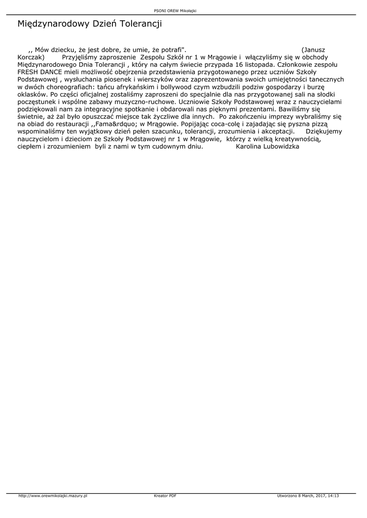 PSONI OREW Mikołajki Międzynarodowy Dzień Tolerancji ,, Mów dziecku, że jest dobre, że umie, że potrafi". (Janusz Korczak) Przyjęliśmy zaproszenie Zespołu Szkół nr 1 w Mrągowie i włączyliśmy się w obchody Międzynarodowego Dnia Tolerancji , który na całym świecie przypada 16 listopada. Członkowie zespołu FRESH DANCE mieli możliwość obejrzenia przedstawienia przygotowanego przez uczniów Szkoły Podstawowej , wysłuchania piosenek i wierszyków oraz zaprezentowania swoich umiejętności tanecznych w dwóch choreografiach: tańcu afrykańskim i bollywood czym wzbudzili podziw gospodarzy i burzę oklasków. Po części oficjalnej zostaliśmy zaproszeni do specjalnie dla nas przygotowanej sali na słodki poczęstunek i wspólne zabawy muzyczno-ruchowe. Uczniowie Szkoły Podstawowej wraz z nauczycielami podziękowali nam za integracyjne spotkanie i obdarowali nas pięknymi prezentami. Bawiliśmy się świetnie, aż żal było opuszczać miejsce tak życzliwe dla innych. Po zakończeniu imprezy wybraliśmy się na obiad do restauracji ,,Fama” w Mrągowie. Popijając coca-colę i zajadając się pyszna pizzą wspominaliśmy ten wyjątkowy dzień pełen szacunku, tolerancji, zrozumienia i akceptacji. Dziękujemy nauczycielom i dzieciom ze Szkoły Podstawowej nr 1 w Mrągowie, którzy z wielką kreatywnością, ciepłem i zrozumieniem byli z nami w tym cudownym dniu. Karolina Lubowidzka http://www.orewmikolajki.mazury.pl Kreator PDF Utworzono 8 March, 2017, 14:13