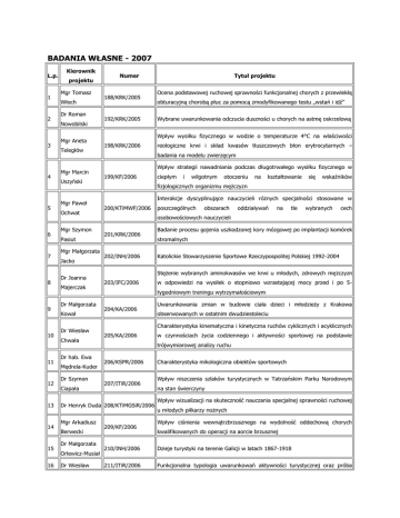 BADANIA WŁASNE - 2007 L.p. 1 2 3 4 5 6 7 8 9 10 11 12 13 14 15 16 Kierownik projektu Mgr Tomasz Włoch Dr Roman Nowobilski Mgr Aneta Teległów Mgr Marcin Uszyński Mgr Paweł Ochwat Mgr Szymon Pasiut Mgr Małgorzata Jacko Dr Joanna Majerczak Dr Małgorzata Kowal Dr Wiesław Chwała Dr hab. Ewa Mędrela-Kuder Dr Szymon Ciapała Numer 188/KRK/2005 192/KRK/2005 Berwecki Dr Małgorzata Orlewicz-Musiał Dr Wiesław Ocena podstawowej ruchowej sprawności funkcjonalnej chorych z przewlekłą obturacyjną chorobą płuc za pomocą zmodyfikowanego testu „wstań i idź” Wybrane uwarunkowania odczucia duszności u chorych na astmę oskrzelową Wpływ wysiłku fizycznego w wodzie o temperaturze 4°C na właściwości 198/KRK/2006 reologiczne krwi i skład kwasów tłuszczowych błon erytrocytarnych – badania na modelu zwierzęcym Wpływ strategii nawadniania podczas długotrwałego wysiłku fizycznego w 199/KF/2006 ciepłym i wilgotnym otoczeniu na kształtowanie się wskaźników fizjologicznych organizmu mężczyzn Interakcje dyscyplinujące nauczycieli różnych specjalności stosowane w 200/KTiMWF/2006 poszczególnych obszarach oddziaływań na tle wybranych cech osobowościowych nauczycieli 201/KRK/2006 202/INH/2006 Badanie procesu gojenia uszkodzonej kory mózgowej po implantacji komórek stromalnych Katolickie Stowarzyszenie Sportowe Rzeczypospolitej Polskiej 1992-2004 Stężenie wybranych aminokwasów we krwi u młodych, zdrowych mężczyzn 203/IFC/2006 w odpowiedzi na wysiłek o stopniowo wzrastającej mocy przed i po 5tygodniowym treningu wytrzymałościowym 204/KA/2006 Uwarunkowania zmian w budowie ciała dzieci i młodzieży z Krakowa obserwowanych w ostatnim dwudziestoleciu Charakterystyka kinematyczna i kinetyczna ruchów cyklicznych i acyklicznych 205/KA/2006 w czynnościach życia codziennego i aktywności sportowej na podstawie trójwymiarowej analizy ruchu 206/KSPR/2006 207/ITiR/2006 Dr Henryk Duda 208/KTiMGSiR/2006 Mgr Arkadiusz Tytuł projektu 209/KF/2006 Charakterystyka mikologiczna obiektów sportowych Wpływ niszczenia szlaków turystycznych w Tatrzańskim Parku Narodowym na stan świerczyny Wpływ wizualizacji na skuteczność nauczania specjalnej sprawności ruchowej u młodych piłkarzy nożnych Wpływ ciśnienia wewnątrzbrzusznego na wydolność oddechową chorych kwalifikowanych do operacji na aorcie brzusznej 210/INH/2006 Dzieje turystyki na terenie Galicji w latach 1867-1918 211/ITiR/2006 Funkcjonalna typologia uwarunkowań aktywności turystycznej oraz próba Alejziak 17 18 Mgr Karolina Korbiel Mgr Piotr Cybula stworzenia modelu wyjaśniającego jej fenomen 212/ITiR/2006 213/ITiR/2006 Dr Agnieszka 19 Suder Dr Małgorzata 214/KF/2006 22 23 24 Mgr Katarzyna Gmyrek-Gołąb Dr Krzysztof Borkowski Dr Janusz Jaworski Dr Renata Woźniacka Konkurencji i Konsumentów przedpokwitaniowym a dystrybucja tkanki tłuszczowej w aspekcie Badania in vitro wpływu resorbowalnych podłoży polimerowych: PGLA, 215/KF/2007 Czarnecka 21 praktyce orzeczniczej Sądu zróżnicowanej aktywności fizycznej (badania longitudinalne) Dr Anna Ścisłowska- Niedozwolone postanowienia umowne w Stężenie ghreliny, leptyny i hormonu wzrostu (GH) u dziewcząt w okresie Płonka 20 Naśladownictwo społeczne a zachowania konsumentów w turystyce PLTMC, PGLCap, PGCap, na morfologię i aktywność osteoblastów MG63, fibroblastów L929 oraz makrofagów RAW 264.7 216/ITiR/2007 217/ITiR/2007 218/KA/2007 219/KF/2007 Zagospodarowanie uzdrowisk polskich Karpat w kontekście zmieniających się ich funkcji „Bramki ewidencyjne” jako metoda szacowania wielkości ruchu turystycznego na podstawie badań ankietowych Zmienność oraz genetyczne i środowiskowe uwarunkowania wybranych koordynacyjnych zdolności motorycznych – longitudinalne badania rodzinne Knemometryczna ocena zmian wzrastania kości długich u chłopców w ostrym stadium choroby Perthes’a Wpływ wysiłku fizycznego oraz deprywacji sennej na stężenie prostacykliny 25 Prof. Jerzy A. Żołądź 220/KFiB/2007 (PGI2), czynnika neurotropowego pochodzenia mózgowego (BDNF), interleukiny-15 9IL-15) oraz białka-4 wiążącego retinol (RBP4) w osoczu krwi u młodych zdrowych mężczyzn