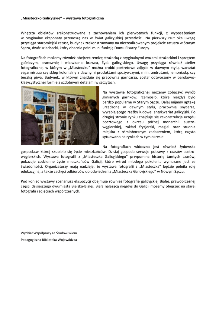 „Miasteczko Galicyjskie” – wystawa fotograficzna Wnętrza obiektów zrekonstruowane z zachowaniem ich pierwotnych funkcji, z wyposażeniem w oryginalne eksponaty przenoszą nas w świat galicyjskiej przeszłości. Na pierwszy rzut oka uwagę przyciąga staromiejski ratusz, budynek zrekonstruowany na niezrealizowanym projekcie ratusza w Starym Sączu, dwór szlachecki, który obecnie pełni m.in. funkcję Domu Pisarzy Europy. Na fotografiach możemy również obejrzeć remizę strażacką z oryginalnymi wozami strażackimi i sprzętem gaśniczym, pracownię i mieszkanie krawca, Żyda galicyjskiego. Uwagę przyciąga również atelier fotograficzne, w którym w „Miasteczku” można zrobić portretowe zdjęcie w dawnym stylu, warsztat zegarmistrza czy sklep kolonialny z dawnymi produktami spożywczymi, m.in. andrutami, lemoniadą, czy beczką piwa. Budynek, w którym znajduje się pracownia garncarza, został odtworzony w barokowoklasycystycznej formie z ozdobnymi detalami w szczytach. Na wystawie fotograficznej możemy zobaczyć wyrób glinianych garnków, rzemiosło, które niegdyś było bardzo popularne w Starym Sączu. Dalej mijamy aptekę urządzoną w dawnym stylu, pracownię snycerza, wyrabiającego rzeźby ludowei antykwariat galicyjski. Po drugiej stronie rynku znajduje się rekonstrukcja urzędu pocztowego z okresu późnej monarchii austrowęgierskiej, zakład fryzjerski, magiel oraz studnia miejska z ośmiobocznym zadaszeniem, którą często sytuowano na rynkach w tym okresie. Na fotografiach widoczna jest również żydowska gospoda,w której skupiało się życie mieszkańców. Dzisiaj gospoda serwuje potrawy z czasów austrowęgierskich. Wystawa fotografii z „Miasteczka Galicyjskiego” przypomina historię tamtych czasów, pokazuje codzienne życie mieszkańców Galicji, które wśród młodego pokolenia wymazane jest ze świadomości. Organizatorzy mają nadzieję, że wystawa fotografii z „Miasteczka” będzie pełniła rolę edukacyjną, a także zachęci odbiorców do odwiedzenia „Miasteczka Galicyjskiego” w Nowym Sączu. Pod koniec wystawy scenariusz ekspozycji obejmuje również fotografie galicyjskiej Białej, prawobrzeżnej części dzisiejszego dwumiasta Bielska-Białej. Białą należącą niegdyś do Galicji możemy obejrzeć na starej fotografii i zdjęciach współczesnych. Wydział Współpracy ze Środowiskiem Pedagogiczna Biblioteka Wojewódzka