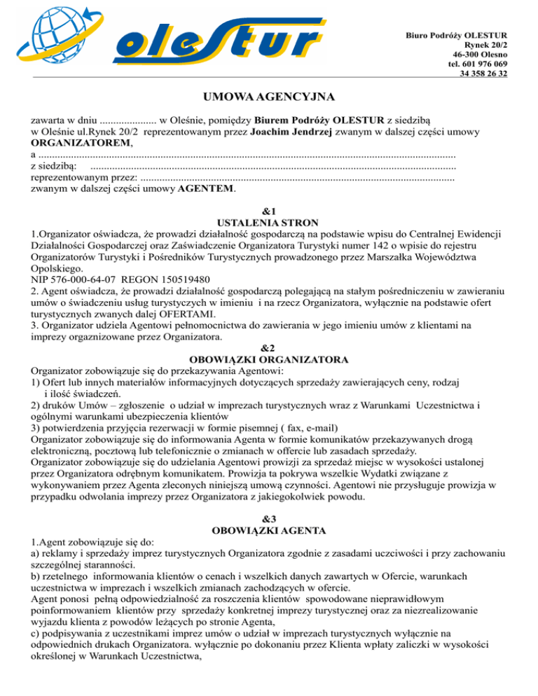 Biuro Podróży OLESTUR Rynek 20/2 46-300 Olesno tel. 601 976 069 34 358 26 32 UMOWA AGENCYJNA zawarta w dniu ..................... w Oleśnie, pomiędzy Biurem Podróży OLESTUR z siedzibą w Oleśnie ul.Rynek 20/2 reprezentowanym przez Joachim Jendrzej zwanym w dalszej części umowy ORGANIZATOREM, a .......................................................................................................................................................... z siedzibą: ....................................................................................................................................... reprezentowanym przez: .................................................................................................................... zwanym w dalszej części umowy AGENTEM. &1 USTALENIA STRON 1.Organizator oświadcza, że prowadzi działalność gospodarczą na podstawie wpisu do Centralnej Ewidencji Działalności Gospodarczej oraz Zaświadczenie Organizatora Turystyki numer 142 o wpisie do rejestru Organizatorów Turystyki i Pośredników Turystycznych prowadzonego przez Marszałka Województwa Opolskiego. NIP 576-000-64-07 REGON 150519480 2. Agent oświadcza, że prowadzi działalność gospodarczą polegającą na stałym pośredniczeniu w zawieraniu umów o świadczeniu usług turystyczych w imieniu i na rzecz Organizatora, wyłącznie na podstawie ofert turystycznych zwanych dalej OFERTAMI. 3. Organizator udziela Agentowi pełnomocnictwa do zawierania w jego imieniu umów z klientami na imprezy orgaznizowane przez Organizatora. &2 OBOWIĄZKI ORGANIZATORA Organizator zobowiązuje się do przekazywania Agentowi: 1) Ofert lub innych materiałów informacyjnych dotyczących sprzedaży zawierających ceny, rodzaj i ilość świadczeń. 2) druków Umów – zgłoszenie o udział w imprezach turystycznych wraz z Warunkami Uczestnictwa i ogólnymi warunkami ubezpieczenia klientów 3) potwierdzenia przyjęcia rezerwacji w formie pisemnej ( fax, e-mail) Organizator zobowiązuje się do informowania Agenta w formie komunikatów przekazywanych drogą elektroniczną, pocztową lub telefonicznie o zmianach w offercie lub zasadach sprzedaży. Organizator zobowiązuje się do udzielania Agentowi prowizji za sprzedaż miejsc w wysokości ustalonej przez Organizatora odrębnym komunikatem. Prowizja ta pokrywa wszelkie Wydatki związane z wykonywaniem przez Agenta zleconych niniejszą umową czynności. Agentowi nie przysługuje prowizja w przypadku odwolania imprezy przez Organizatora z jakiegokolwiek powodu. &3 OBOWIĄZKI AGENTA 1.Agent zobowiązuje się do: a) reklamy i sprzedaży imprez turystycznych Organizatora zgodnie z zasadami uczciwości i przy zachowaniu szczególnej staranności. b) rzetelnego informowania klientów o cenach i wszelkich danych zawartych w Ofercie, warunkach uczestnictwa w imprezach i wszelkich zmianach zachodzących w ofercie. Agent ponosi pełną odpowiedzialność za roszczenia klientów spowodowane nieprawidłowym poinformowaniem klientów przy sprzedaży konkretnej imprezy turystycznej oraz za niezrealizowanie wyjazdu klienta z powodów leżących po stronie Agenta, c) podpisywania z uczestnikami imprez umów o udział w imprezach turystycznych wyłącznie na odpowiednich drukach Organizatora. wyłącznie po dokonaniu przez Klienta wpłaty zaliczki w wysokości określonej w Warunkach Uczestnictwa, d) sprzedawania imprez turystycznych w cenie podanej w Ofercie. e) dokonywania u Organizatora wszelkich rezerwacji w formie pisemnej, f) niezwłocznego przekazywania Organizatorowi wszelkich reklamacji Klientów 2. Agent zobowiązuje się do niezwłocznego informowania Organizatora. o wszelkich zmianach prawnych w jego firmie oraz do wskazania oddziałów, w których będzie prowadził sprzedaż. 3. Agent będzie wystawiał Organizatorowi faktury VAT na kwote prowizji nie później niż 10 dni przed datą rozpoczęcia imprezy. W przypadku rezygnacji uczestnika z imprezy, Agent potrąca uczestnikowi koszty rezygnacji określone w warunkach uczestnictwa. Agentowi przysługuje ,tytułem poniesionych kosztów, 10 % potrąconej kwoty jednak nie więcej niż ustalona kwota prowizji. 4. Agent ponosi całkowitą odpowiedzialność finansową w stosunku do Organizatora za nadużycia uprawnień i niedopełnienia obowiązków wynikających z niniejszej umowy. &4 WARUNKI PŁATNOŚCI 1.Agent zobowiązuje się do pobierania od uczestników przedpłat w wysokości określonej w warunkach uczestnictwa . Pobranie niższej kwoty od Klienta niż okreslają warunki uczestnictwa odbywać się może tylko na ryzyko i koszt Agenta. 2. Agent zobowiązuje się do przekazywania wszelkich należności dokonywanych przez uczestników , pomniejszonych o kwotę prowizji w terminie do 3 dni od ich pobrania na konto Organizatora w : Bank Spółdzielczy w Zawadzkim O/Olesno 69 89090006 0040 0411 0588 0001 3. Potwierdzenie wpłaty za rezerwację dokonaną w terminie krótszym niż 14 dni przed rozpoczęciem imprezy winno być niezwłocznie przekazane Organizatorowi faxem. 4. Organizator zastrzega sobie prawo wykreślenia klienta z listy uczestników imprezy w przypadku nie dokonania przez Agenta wpłat w okreslonych terminach. Za wynikłe z tego tytułu ewntualne roszczenia klientów zostanie obciążony Agent. 5. Organizator może powiadomić Klienta o opóźnieniach płatności dokonywanych przez Agenta i konsekwencjach z tego tytułu wynikających. 6. Agent w przypadku opoźnienia w przekazaniu należności będzie obciązony przez Organizatora ustawowymi odsetkami naliczonymi do dnia wymagalności. &5 FAKTURY 1. Organizator oświadcza że jest płatnikem podatku VAT od towarów i usług oraz posiada numer identyfikacyjny NIP 576-000-64-07 2. Faktury VAT dla Klientów wystawia wyłącznie Organizator. Faktury dla Klienta są przesyłane na żądanie Klienta zgłoszone do 7 dni po zakończeniu imprezy. &6 POSTANOWIENIA KOŃCOWE 1. Niniejsza umowa została zawarta na czas nieokreślony. 2. Rozwiązanie