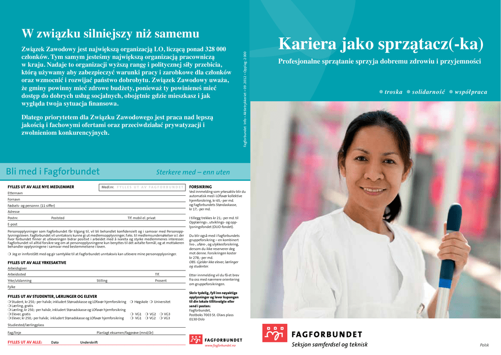 Związek Zawodowy jest największą organizacją LO, liczącą ponad 328 000 członków. Tym samym jesteśmy największą organizacją pracowniczą w kraju. Nadaje to organizacji wyższą rangę i politycznej siły przebicia, którą używamy aby zabezpieczyć warunki pracy i zarobkowe dla członków oraz wzmocnić i rozwijać państwo dobrobytu. Związek Zawodowy uważa, że gminy powinny mieć zdrowe budżety, ponieważ ty powinieneś mieć dostęp do dobrych usług socjalnych, obojętnie gdzie mieszkasz i jak wygląda twoja sytuacja finansowa. Dlatego priorytetem dla Związku Zawodowego jest praca nad lepszą jakością i fachowymi ofertami oraz przeciwdziałać prywatyzacji i zwolnieniom konkurencyjnych. Bli med i Fagforbundet FYLLES UT AV ALLE NYE MEDLEMMER Kariera jako sprzątacz(-ka) Profesjonalne sprzątanie sprzyja dobremu zdrowiu i przyjemności troska solidarność współpraca Sterkere med – enn uten Medl.nr. F Y L L E S U T A V F A G F O R B U N D E T FORSIKRING Vedinnmeldingsomyrkesaktivblirdu automatiskmediLOfavørkollektive hjemforsikring,kr65,-permd. ogFagforbundetsStøndaskasse, kr17,-permd. Etternavn Fornavn Fødsels-ogpersonnr.(11siffer) Adresse Postnr. Fagforbundet Info • Aktietrykkeriet • 09 .2012 • Opplag: 2 000 W związku silniejszy niż samemu Poststed Tlf.mobilel.privat E-post Personopplysninger som Fagforbundet får tilgang til, vil bli behandlet konfidensielt og i samsvar med Personopplysningsloven.Fagforbundetvilunntaksviskunnegiutmedlemsopplysninger,f.eks.tilmedlemsundersøkelsero.l.der hvor forbundet finner at utleveringen bidrar positivt i arbeidet med å ivareta og styrke medlemmenes interesser. Fagforbundetvilalltidforsikresegomatpersonopplysningenekunbenyttestildetavtalteformål,ogatmottakeren behandleropplysningeneisamsvarmedbestemmelseneiloven. ❍JegerinnforståttmedoggirsamtykketilatFagforbundetunntaksviskanutlevereminepersonopplysninger. FYLLES UT AV ALLE YRKESAKTIVE Arbeidsgiver Arbeidssted Tlf. Yrke/utdanning Stilling Prosent Fylke FYLLES UT AV STUDENTER, LÆRLINGER OG ELEVER ❍Student,kr250,-perhalvår,inkludertStønadskasseogLOfavørhjemforsikring❍Høgskole❍Universitet ❍Lærling,gratis ❍Lærling,kr250,-perhalvår,inkludertStønadskasseogLOfavørhjemforsikring ❍Elever,gratis ❍ VG1❍ VG2❍VG3 ❍Elever,kr250,-perhalvår,inkludertStønadskasseogLOfavørhjemforsikring ❍ VG1❍VG2❍VG3 Itilleggtrekkeskr21,-permd.til Opplærings-,utviklings-ogopp- lysningsfondet(OUO-fondet). DublirogsåmediFagforbundets gruppeforsikring–enkombinert livs-,uføre-,ogulykkesforsikring, dersomduikkereservererdeg motdenne.Forsikringenkoster kr278,-permd. OBS: Gjelder ikke elever, lærlinger og studenter. Etterinnmeldingvildufåetbrev fraossmednærmereorientering omgruppeforsikringen. Skriv tydelig, fyll inn nøyaktige opplysninger og lever kupongen til din lokale tillitsvalgte eller send i posten: Fagforbundet, Postboks7003St.Olavsplass 0130Oslo Studiested/lærlingplass Fag/linje FYLLES UT AV ALLE: Planlagteksamen/fagprøve(mnd/år) Dato Underskrift Polsk Sprzątacz(-ka) – Od dyplomu zawodowego po stopień mistrza Dyplom zawodowy Szkoły zawodowe Szkoła wyższa Szkoła średnia, techniki budowlanej i elektryki, hydrauliki techniki prac nawierzchniowych, kontynuowana stażem. Szkoła kształcąca kierowników usług Zawody wewnętrzne Budownictwo i konstrukcja Klimatyzacja, energia i środowisko BHP budowlany Konsulent ds. majątkowych Czyszczenie specjalne w szpitalach Finanse domowe i kierownictwo usług Inżynier budowy maszyn, energii i środowiska Szkoła średnia 1 technik budowlany Szkoła średnia 2 technik prac nawierzchni Praktykant w zakładzie - trwanie 2 lata Ewentualnie w praca na pełnym etacie połączone z teorią – trwanie 5 lat. Zazwyczaj żąda się dyplomu zawodowego lub podobnego dyplomu z danego przedmiotu/ zawodu. Trwanie od pół do dwóch lat. Ogólne warunki przyjęcia na studia lub ewentualnie wykonywana praca w danym zawodzie. Studia 2-3 letnie. (licencjat/licencjat/magister) Sprzątanie jest zawodem Czy zdajesz sobie sprawę, że zdrowie i samopoczucie Twoje oraz innych osób zależy od pracy, jaką wykonuje sprzątaczka? Dokładne sprzątanie i dobra higiena może zadecydować nawet o życiu lub śmierci. Członkowie Związku Zawodowego w dziale sprzątania mają wpływ na twoją codzienność w: • przedszkolach • szkołach • halach sportowych: salach gimnastycznych i basenach • na miejscu pracy • miejscach rozrywkowych: kinach, teatrach, hotelach i restauracjach • u lekarza, dentysty, aptekach • sklepach, w których robisz zakupy • środkach transportu • szpitalach, w domach spokojnej starości, opieki starczej itd. Wyciąg z planu nauki: • Wiedza o chemikaliach i zanieczyszczeniu środowiska, ich działanie na system ekologiczny. • Ocena materiałów i rozwiązania, które nadają się do wejść i holów. • Tworzenie planów utrzymywania czystości, gdzie głównym elementem jest ekonomiczny i ergonomiczny sposób pracy. • Sprzątanie po różnego rodzaju szkodach, (np. szkody pożarowe lub zalanie, czyszczenie mieszkania po śmierci itd.)