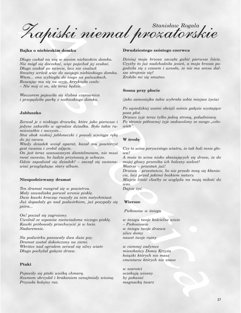 Zapiski niemal prozatorskie Stanisław Rogala sP Ar Bajka o niebieskim domku Dwudziestego szóstego czerwca Długo czekał na nią w swoim niebieskim domku. Nie mógł się doczekać, więc pojechał jej szukać. Długo szukał po świecie, lecz nie znalazł. Smutny wrócił więc do swojego niebieskiego domku. Wtem... ona wybiegła do niego na paluszkach. Rzucając mu się na szyję, krzyknęła czule: – Nie mój ci on, ale teraz będzie. Dzisiaj moja brzoza zaczęła gubić pierwsze liście. Czyżby to już nadchodziła jesień, a moja brzoza po− godziła się z czasem i uznała, że nie ma sensu dal− sze strojenie się? Zrobiło mi się smutno. Sosna przy płocie Wieczorem pojawiła się ślubna czarownica i przepędziła parkę z niebieskiego domku. Jabłuszko Niespodziewany dramat Po sąsiedzkiej waśni obcięli sośnie gałęzie wystające poza płot. Drzewo żyje teraz tylko jedną stroną, południową. Po stronie północnej żyje zadowolony ze swego „czło− wiek”. W środę Czy to wina porywistego wiatru, że tak boli mnie gło− wa? A może to wina nisko słaniających się drzew, że do mojej głowy przenika ich bolesny szelest? Wietrze – przestań już! Drzewa – przestańcie, bo nie przede mną się kłania− cie, lecz przed jakimś bożkiem natury. Miejcie litość choćby ze względu na moją miłość do was. Dajcie żyć. oet Zerwał je z niskiego drzewka, które jako pierwsze i jedyne zakwitło w ogrodzie dziadka. Było takie ru− mieniutkie i soczyste... Stoi obok niskiej jabłoneczki i powoli wyciąga rękę do jej owocu. Wtedy dziadek wziął aparat, kazał mu powtórzyć gest rwania i zrobił zdjęcie. On jest teraz szanowanym dżentelmenem, nie musi rwać owoców, bo ludzie przynoszą je ochoczo. Gdzie zapodział się dziadek? – zaczął się zastana− wiać przeglądając stary album. (jako samosiejka takie wybrała sobie miejsce życia) Ten dramat rozegrał się w powietrzu. Mały zawadiaka porwał wronie pisklę. Dwie kawki kracząc ruszyły za nim natychmiast. Już dopadały go nad podwórkiem, już posypały się pióra... Wiersze Piekoszów w śniegu On! poczuł się zagrożony. Uwolnił ze szponów nieświadome niczego pisklę. Kawki próbowały przechwycić je w locie. Nadaremnie. Ptaki Pojawiły się ptaki wielką chmarą. Szumem skrzydeł i krakaniem oznajmiały wiosnę. Przyszła kolejny raz. ica Na podwórku panowały dwa duże psy. Dramat został dokończony na ziemi. Wkrótce nad ogrodem zerwał się silny wiatr. Długo pochylał gałęzie drzew. w śniegu twoje kościelne wieże – Piekoszowie w śniegu twoje drzewa ulice domy nawet twoje ruiny w ciemnej zadymce mieszkańcy Domu Krzyża książki których nie masz cmentarze których nie znasz w szarości oczekują wiosny by pokazać magnacką twarz 27 Noc w Piekoszowie sP Ar STANFORYZMY pusty stół w ogrodzie, niski krzak przy płocie ognie wygaszone, ni gwiazdy na niebie na straży pozostał rudy pies sąsiada posnęliśmy wszyscy znużeni dniem długim gdy się obudzimy, czy świat się coś zmieni czy odejdą duchy z latarni za oknem deszcz po dachu stuka, coś w liściach szeleści nocna sowa znowu wrogą przyszłość wieszczy Powitanie Patrycji Witaj – Patrycjo, która jeszcze nie wiesz, że człowiek bywa dobry i zły bywa radosny i smutny lotnym ptakiem bywa kładką nad przepaścią i pułapką na ścieżce Witamy Cię szlachetną twarzą człowieka (drugą jej stronę zasłonimy) rozpoznasz go po oczach i gestach po tym jak wstaje do pracy i jak kładzie się do spoczynku jak podnosi z krzesła albo... Odważyłaś się wejść w kłębowisko idei – Witaj więc luty−kwiecień 2007 28 ica i jak dziękuje matce Kiedy milczenie trafia w sedno, od niedomilczeñ zaczyna siê gadulstwo. ×× Dziedziczymy po przodkach bodaj dobra umys³owe. ×× Ile¿ k³amstw wyrasta pomiêdzy blogiem a prawd¹! ×× Na nic siedmiomilowe buty, kiedy przepaœæ oœmiomilowa. ×× Zdrowy rozs¹dek bytuje poza zasiêgiem chorych umys³ów. ×× Kiedy nauka udowodni istnienie Boga, nabo¿eñstwa przeistocz¹ siê w sesje popularnonaukowe. ×× Odpowiedzialne stanowiska nie by³yby a¿ w takiej cenie, gdyby nie zwalnia³y od wszelkiej odpowiedzialnoœci. ×× Ludzie zaradni daj¹ ¿yciu po pu³apkach. ×× Œwiête przekonanie nie pokona ordynarnej wymowy faktów. ×× Dobre ma³¿eñstwo ¿yje pe³n¹ par¹. ×× Feministki gotowe dowieœæ, ¿e koñ trojañski by³a koby³¹. ×× Marni ustawodawcy zmuszaj¹ nas do obchodzenia praw, bez których moglibyœmy siê obejœæ. ×× Panowie, nie róbta, co chceta – róbta, co panie chc¹! ×× Religie wabi¹ wyznawców instrukcjami u¿ycia po ¿yciu. ×× Nim za¿¹dasz dowodu mi³oœci, daj do niej powód. ×× Spirytus dodaje ducha, ale ujmuje rozumu. ×× Koncesjonowani satyrycy u¿ywaj¹ uciêtego jêzyka. ×× Cnotliwiec – jak siê patrzy, grzesznik – kiedy nikt nie widzi. ×× Aforysto, nie pozwól nikomu czytaæ w twoich myœlach, bo znajdziesz je w druku – podpisane cudzym nazwiskiem. ×× Denny polityk m¹ci toñ nad sob¹. oet i kamieniem na drodze drugiego – Aforyzmy S. Fornal