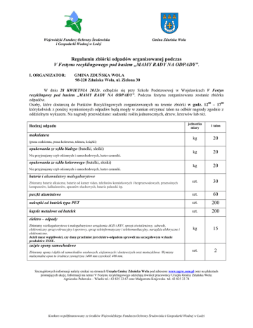 Wojewódzki Fundusz Ochrony Środowiska i Gospodarki Wodnej w Łodzi Gmina Zduńska Wola Regulamin zbiórki odpadów organizowanej podczas V Festynu recyklingowego pod hasłem „MAMY RADY NA ODPADY”. I. ORGANIZATOR: GMINA ZDUŃSKA WOLA 98-220 Zduńska Wola, ul. Zielona 30 W dniu 28 KWIETNIA 2012r. odbędzie się przy Szkole Podstawowej w Wojsławicach V Festyn recyklingowy pod hasłem „MAMY RADY NA ODPADY”. Podczas festynu zorganizowana zostanie zbiórka odpadów. Osoby, które dostarczą do Punktów Recyklingowych zorganizowanych na terenie zbiórki w godz. 1200 – 1700 którykolwiek z poniżej wymienionych odpadów będą mogły w zamian otrzymać talon na odbiór nagrody zgodnie z oddzielnym wykazem. Na nagrody przewidziano: sadzonki roślin jednorocznych, drzew, krzewów lub róż. jednostka miary 1 talon kg 20 kg 20 kg 20 Zbieramy baterie alkaiczne, baterie od kamer video, telefonów komórkowych i bezprzewodowych, przenośnych komputerów, kalkulatorów, aparatów słuchowych, baterie paluszki itp. szt. 30 puszki aluminiowe szt. 60 nakrętki od butelek typu PET szt. 200 kapsle metalowe od butelek szt. 200 kg 15 szt. 2 Rodzaj odpadu makulatura (prasa codzienna, prasa kolorowa, tektura, książki) opakowania ze szkła białego (butelki, słoiki) Nie przyjmujemy szyb okiennych i samochodowych, luster ceramiki. opakowania ze szkła kolorowego (butelki, słoiki) Nie przyjmujemy szyb okiennych i samochodowych, luster ceramiki. baterie i akumulatory małogabarytowe elektro – odpady Zbieramy wielkogabarytowe i małogabarytowe urządzenia AGD i RTV, sprzęt oświetleniowy, zabawki, elektroniczny sprzęt rekreacyjny i sportowy, sprzęt teleinformatyczny i telekomunikacyjny, narzędzia elektryczne i elektroniczne. Jeżeli masz wątpliwości, czy dany przedmiot jest elektro-odpadem sprawdź na szczegółowym wykazie produktów ZSSE. zużyte opony samochodowe Zbieramy opony i dętki od samochodów osobowych, ciężarowych i dostawczych oraz motocyklowe. Wymiary maksymalne opon to średnica zewnętrzna 1400 mm szerokość 400 mm. Szczegółowych informacji należy szukać na stronach Urzędu Gminy Zduńska Wola pod adresem: www.ugzw.com.pl oraz na plakatach promujących akcję. Informacji na temat V Festynu recyklingowego udzielają również pracownicy Urzędu Gminy Zduńska Wola: Agnieszka Puławska – Wlazło tel.: 43 825 33 67 oraz Małgorzata Krajewska tel. 43 825 33 74 Konkurs współfinansowany ze środków Wojewódzkiego Funduszu Ochrony Środowiska i Gospodarki Wodnej w Łodzi