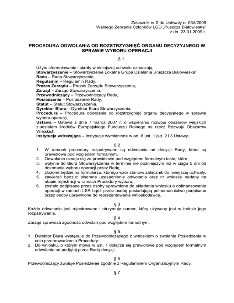Załacznik nr 2 do Uchwały nr 03/I/2009 Walnego Zebrania Członków LGD „Puszcza Białowieska” z dn. 23.01.2009 r. PROCEDURA ODWOŁANIA OD ROZSTRZYGNIĘĆ ORGANU DECYZYJNEGO W SPRAWIE WYBORU OPERACJI §1 UŜyte sformułowania i skróty w niniejszej uchwale oznaczają: Stowarzyszenie – Stowarzyszenie Lokalna Grupa Działania „Puszcza Białowieska” Rada – Rada Stowarzyszenia, Regulamin – Regulamin Rady, Prezes Zarządu – Prezes Zarządu Stowarzyszenia, Zarząd – Zarząd Stowarzyszenia, Przewodniczący – Przewodniczący Rady, Posiedzenie – Posiedzenie Rady, Statut – Statut Stowarzyszenia, Dyrektor Biura – Dyrektor Biura Stowarzyszenia, Procedura – Procedura odwołania od rozstrzygnięć organu decyzyjnego w sprawie wyboru operacji, Ustawa – Ustawa z dnia 7 marca 2007 r. o wspieraniu rozwoju obszarów wiejskich z udziałem środków Europejskiego Funduszu Rolnego na rzecz Rozwoju Obszarów Wiejskich Instytucja wdraŜająca – Instytucje wymienione w art. 6 ust. 1 pkt. 2 i 3 Ustawy. 1. 2. 3. 4. 5. 6. §2 W ramach procedury rozpatrywane są odwołania od decyzji Rady, które są prawidłowe pod względem formalnym. Odwołanie uznaje się za prawidłowe pod względem formalnym takie, które wpłynie do Biura Stowarzyszenia w terminie nie późniejszym niŜ w ciągu 5 dni od dokonania wyboru operacji przez Radę, złoŜone będzie na formularzu, którego wzór stanowi załącznik do niniejszej uchwały, zawierać będzie: pisemne uzasadnienie odwołania oraz nr wniosku nadany na etapie rejestracji w ramach Procedury wyboru, zostało podpisane przez osoby uprawnione do składania wniosku o dofinansowanie operacji w ramach LSR bądź przez osobę posiadającą pełnomocnictwo podpisane przez osoby uprawnione do reprezentowania wnioskodawcę. §3 KaŜde odwołanie jest rejestrowane i otrzymuje numer, który uŜywany jest w trakcie jego rozpatrywania. §4 Zarząd sprawdza zgodność odwołań pod względem formalnym. §5 1. Dyrektor Biura występuje do Przewodniczącego z wnioskiem o zwołanie Posiedzenia w celu przeprowadzenia Procedury. 2. Do wniosku, o którym mowa w ust. 1 dołącza się prawidłowe pod względem formalnym odwołania od podjętej przez Radę decyzji. §6 Przewodniczący zwołuje Posiedzenie zgodnie z Regulaminem Organizacyjnym Rady. §7 1. Dyrektor Biura informuje pisemnie odwołującego się o przyjęciu jego odwołania do rozpatrzenia, bądź o odrzuceniu z powodów formalnych. 2. Pismo o przyjęciu odwołania do rozparzenie winno zawierać następujące informacje: 1) numer pod jakim odwołanie zostało zarejestrowane, 2) prawie do uczestniczenia w Posiedzeniu przeprowadzanym w ramach procedury w roli obserwatora, to jest bez prawa do zabierania głosu w dyskusji, 3) prawie do złoŜenia dodatkowych wyjaśnień na Posiedzeniu przeprowadzanym w ramach procedury, 4) miejsce, termin i godzinę Posiedzenia. 3. Pismo o odrzuceniu odwołania z powodów formalnych winno zawierać następujące informacje: 1) numer pod jakim odwołanie zostało zarejestrowane, 2) podstawę odrzucenia odwołania. 4. W szczególnych wypadkach informacje, o których mowa w ust. 2 i 3, mogą zostać wnioskodawcy telefonicznie lub e-mailem lub faxem. §8 1. Posiedzenie przeprowadzane w ramach Procedury prowadzone jest zgodnie Regulamine Organizacyjnym Rady, z tym Ŝe w roli obserwatora mogą uczestniczyć jedynie osoby mające prawo reprezentować wnioskodawcę, którego odwołanie jest rozpatrywane lub pełnomocnik wnioskodawcy posiadający oryginalne pełnomocnictwo podpisane przez osoby, o których mowa powyŜej. 2. W razie wątpliwości do pisemnego uzasadnienia odwołania, Przewodniczący na wniosek Rady moŜe poprosić osobę reprezentującą stronę odwołania o dodatkowe wyjaśnienia. §9 1. Od decyzji podjętej w ramach Procedury nie ma odwołania. 2. Przewodniczący pisemnie informuje wnioskodawców o podjętej decyzji przekazując informacje wymagane Rozporządzeniem Ministra Rolnictwa i Rozwoju Wsi z dnia 8 lipca 2008 roku w sprawie szczegółowych warunków i trybu przyznawania oraz wypłaty pomocy finansowej w ramach działania „WdraŜanie lokalnych strategii rozwoju” objętego Programem Rozwoju Obszarów Wiejskich na lata 2007 – 2013 o braku prawa do kolejnego odwołania. 3. Na stronie Internetowej publikowane są listy odwołań rozpatrzonych pozytywnie, negatywnie i odrzuconych z powodów formalnych. § 10 1. Na podstawie Listy odwołań rozpatrzonych pozytywnie tworzona jest ostateczna lista rankingowa, o której mowa w Procedurze wyboru. 2. Dalsze postępowanie jest zgodne z Procedurą wyboru. § 11 Na potrzeby Procedury wprowadza się wzory formularzy i pism stanowiące załączniki do niniejszej uchwały: Załącznik 1 – Wniosek o zwołanie Rady w ramach procedury odwołania od rozstrzygnięć organu decyzyjnego. Załącznik 2 – Pismo o niepoprawnym odwołaniu pod względem formalnym. Załącznik 3 – Powiadomienie o przyjęciu odwołania do rozpatrzenia. Załącznik 4 – Zaproszenie na Posiedzenie Rady. Załącznik 5 – Pismo o odrzuceniu odwołania. Załącznik 6 – Pismo z informacją o pozytywnym rozpatrzeniu. Załącznik nr 7 – Formularz odwołania ODR-1 Załącznik 1 Wniosek o zwołanie Rady w ramach procedury odwołania od rozstrzygnięć organu Decyzyjnego WZÓR Znak sprawy: Miejsce, data Przewodniczący Rady Lokalnej Grupy Działania „Puszcza Białowieska” W związku z wpłynięciem do dn. (dd.mm.rrrrr) do Biura Stowarzyszenia ………………………. prawidłowych pod względem formalnym odwołań od decyzji podjętej przez Radę na Posiedzeniu odbytym w dniach (dd.mm.rrrr – dd.mm.rrrr) oraz na podstawie Regulaminu Organizacyjnego Rady wnioskuję o zwołania Rady w celu przeprowadzenia Procedury odwołania od rozstrzygnięć organu decyzyjnego. W załączeniu do wniosku przekazuję prawidłowe pod względem formalnym odwołania, które naleŜy rozpatrzeć na najbliŜszym Posiedzeniu Rady. Załącznik 2 Pismo o niepopr