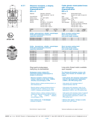 4. 5.1 Dławnice mosięŜne, z obejmą zaciskaną śrubami Cable glands nickel-plated brass with clampings EEx e II EEx e II Materiał: Uszczelnienie: Zakres temp.: Stopień ochrony: Wersja: Norma: Mosiądz, niklowany Śruby zaciskowe - stal A2 TPE od -20°/+100°C IP 68 EEx e II EN 50014 / EN 50019 Certyfikat badania EC PTB 02 ATEX 1125 PTB 02 ATEX 1126 X1) AGRO Nr Nickel-plated brass Screws are made of steel A2 Seal: TPE Temp. range: -20°/+100°C Protection class: IP 68 Version: EEx e II Test standard: EN 50014 / EN 50019 EC-type examination certificate PTB 02 ATEX 1125 PTB 02 ATEX 1126 X1) Material: mm Krótka, jednoczęściowa wkładka uszczelniająca Krótki gwint przyłączający metryczny (częściowo izolowana) ATEX 95 EX1803.12.03.0651) EX1803.12.03.0801) M12x1,5 M12x1,5 5,0- 6,5 6,5- 8,0 Krótka, dwuczęściowa wkładka uszczelniająca Krótki gwint przyłączający metryczny (częściowo izolowana) mm H mm L mm Short, one-piece sealing insert Short entry thread metric (not overall length insulated) 15/16 15/16 26 26 5 5 50 50 Short, two-piece sealing insert Short entry thread metric (not overall length insulated) EX1803.17 EX1803.20 M16x1,5 M20x1,5 6,0-10,5 8,0-15,0 18/19 24 30 31 5 6 50 50 EX1803.25 EX1803.32 M25x1,5 M32x1,5 12,5-20,5 17,0-25,5 30 36 35 40 7 8 25 25 EX1803.40 EX1803.50 M40x1,5 M50x1,5 24,0-33,0 33,0-42,0 46 55 44 49 8 9 10 10 EX1803.63 M63x1,5 40,0-52,0 70 55 10 5 Długi gwint przyłączający metryczny na zamówienie! Long entry thread metric available upon request! Następujące wersje z obejmą EX z metrycznym gwintem przyłączającym są dostępne na zamówienie: The following EX-clamping versions with metric entry threads are available upon request: - Dławnice mosięŜne z obejmą zaciskaną śrubami i odporną na wys. temp. (+200°C) wkładką uszczelniającą z FPM. - Cable glands with clampings nickel-plated brass for high temperature applications (+200°C) with FPM sealing insert. - Dławnice stalowe z obejmą zaciskaną śrubami, ze stali nierdzewnej A2. - Cable glands with clampings made of rustproof-stainless steel A2. - Dławnice stalowe z obejmą zaciskaną śrubami, z nierdzewnej stali A2 i odporną na wys. temp. (+200°C) wkładką uszczelniającą z FPM. - Cable glands with clampings, made of rustproof-stainless steel A2 for high temperature applications (+200°C) with FPM sealing insert. - Dławnice stalowe z obejmą zaciskaną śrubami, z nierdzewnej, odpornej na kwas stali A4 i odporną na wys. temp. (+200°C) wkładk ą uszczelniającą z FPM. - Cable glands with clampings made of rustproof and acid-resistant stainless steel A4 and for high temperature applications (+200°C) with FPM sealing insert. • Czas realizacji zam. 14 dni roboczych • Dostawa na Ŝądanie • delivery time approx. 14 days ex works • delivery time upon request Dane techniczne mogą ulec zmianie! Technical modifications are subject to change! ASTAT, sp. z o.o., 60-451 Poznań, ul. Dąbrowskiego 441, tel. (061) 848 88 71, faks (061) 848 82 76, www.astat.com.pl, [email protected] 4.16 4. 5.2 Dławnice mosięŜne, z obejmą zaciskaną śrubami Cable glands nickel-plated brass with clampings EEx e II EEx e II Mosiądz, niklowany Śruby zaciskowe – stal A2 Uszczelnienie: TPE Zakres temp.: od -20°/+100°C Stopień ochrony: IP 68 Wersja: EEx e II Norma: EN 50014 / EN 50019 Certyfikat badania EC PTB 02 ATEX 1125 PTB 02 ATEX 1126 X1) Nickel-plated brass Screws are made of steel A2 Seal: TPE Temp. range: -20°/+100°C Protection class: IP 68 Version: EEx e II Test standard: EN 50014 / EN 50019 EC-type examination certificate PTB 02 ATEX 1125 PTB 02 ATEX 1126 X1) Materiał: AGRO Nr Material: mm Pg Krótka, jednoczęściowa wkładka uszczelniająca Krótki gwint przyłączający Pg (częściowo izolowana) ATEX 95 EX1803.07.03.0651) EX1803.07.03.0801) Pg 7 Pg 7 5,0- 6,5 6,5- 8,0 Krótka, dwuczęściowa wkładka uszczelniająca Krótki gwint przyłączający Pg (częściowo izolowana) mm H mm L mm Short, one-piece sealing insert Short entry thread Pg (not overall length insulated) 15/16 15/16 26 26 6,0 6,0 50 50 Short, two-piece sealing insert Short entry thread Pg (not overall length insulated) EX1803.09 EX1803.11 Pg 9 Pg 11 6,0-10,5 5,5-12,0 18/19 21 30 31 6,0 6,0 50 50 EX1803.13 EX1803.16 Pg 13 Pg 16 8,0-15,0 8,0-15,0 24 24 31 31 6,0 6,0 50 50 EX1803.21 EX1803.29 Pg 21 Pg 29 12,5-20,5 19,0-27,5 30 38 35 40 7,5 8,0 25 25 EX1803.36 EX1803.42 Pg 36 Pg 42 26,0-35,0 33,0-42,0 50 55 47 49 8,0 10,0 10 10 EX1803.48 Pg 48 37,0-49,0 65 51 11,0 5 Długi gwint przyłączający Pg na zamówienie! Long entry thread Pg available upon request! Następujące wersje z obejmą EX z metrycznym gwintem przyłączającym są dostępne na zamówienie: The following EX-clamping versions with metric entry threads are available upon request: - Dławnice mosięŜne z obejmą zaciskaną śrubami i odporną na wys. temp. (+200°C) wkładką uszczelniającą z FPM. - Cable glands with clampings nickel-plated brass for high temperature applications (+200°C) with FPM sealing insert. - Dławnice stalowe z obejmą zaciskaną śrubami, ze stali nierdzewnej A2. - Cable glands with clampings made of rustproof-stainless steel A2. - Dławnice stalowe z obejmą zaciskaną śrubami, z nierdzewnej stali A2 i odporną na wys. temp. (+200°C) wkładką uszczelniającą z FPM. - Cable glands with clampings, made of rustproof-stainless steel A2 for high temperature applications (+200°C) with FPM sealing insert. - Dławnice stalowe z obejmą zaciskaną śrubami, z nierdzewnej, odpornej na kwas stali A4 i odporną na wys. temp. (+200°C) wkładk ą uszczelniającą z FPM. - Cable glands with clampings made of rustproof and acid-resistant stainless steel A4 and for high temperature applications (+200°C) with FPM sealing insert. • Czas realizacji zam. 14 dni roboczych • Czas realizacji na Ŝądanie • delivery time approx. 14 days ex works • delivery time upon request Dane techniczne mogą ulec zmianie! Te