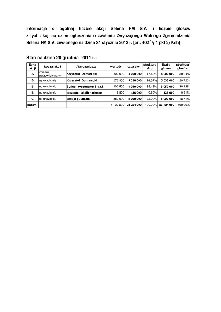 Informacja o ogólnej liczbie akcji Selena FM S.A. i liczbie głosów z tych akcji na dzień ogłoszenia o zwołaniu Zwyczajnego Walnego Zgromadzenia Selena FM S.A. zwołanego na dzień 31 stycznia 2012 r. [art. 402 3 § 1 pkt 2) Ksh] Stan na dzień 28 grudnia 2011 r.: Seria akcji liczba głosów struktura głosów liczba akcji struktura akcji 200 000 4 000 000 17,60% 8 000 000 29,94% Krzysztof Domarecki 276 900 5 538 000 24,37% 5 538 000 20,72% na okaziciela Syrius Investments S.a.r.l. 402 500 8 050 000 35,43% 8 050 000 30,12% B na okaziciela pozostali akcjionariusze 6 800 136 000 0,60% 136 000 0,51% C na okaziciela emisja publiczna 250 000 5 000 000 22,00% 5 000 000 18,71% 100,00% 26 724 000 100,00% Rodzaj akcji Akcjonariusze A imienne uprzywilejowane Krzysztof Domarecki B na okaziciela B Razem wartość 1 136 200 22 724 000