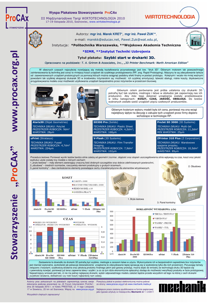 Wyspa Plakatowa Stowarzyszenia ProCAx III Międzynarodowe Targi WIRTOTECHNOLOGIA 2010 17-19 listopada 2010, Sosnowiec, www.wirtotechnologia.pl Autorzy: mgr inż. Marek KRET*, mgr inż. Paweł ŻUK**, e-mail: [email protected], [email protected], *SIMR, **Instytut Techniki Uzbrojenia Tytuł plakatu: Szybki start w drukarki 3D. Opracowano na podstawie: T. A. Grimm & Associates, Inc., „3D Printer Benchmark: North American Edition” W obecnych czasach najszybciej rozwijającą się metodą kształtowania przyrostowego jest tzw. "druk 3D”. Głównym motorem tak powszechnego zainteresowania tą techniką jest coraz to mniejszy koszt urządzeń do szybkiego prototypowania (RP, ang. Rapid Prototyping). Maszyny te są zdecydowanie tańsze od zaawansowanych urządzeń produkcyjnych za pomocą których można osiągnąć podobny efekt finalny w postaci prototypu. Kolejnymi i wcale nie mniej ważnymi powodami tak szybkiej ekspansji drukarek 3D w środowisku inżynierskim są: możliwość ich szybkiej amortyzacji, łatwość obsługi, niskie koszty, błyskawiczne przygotowywania modelu oraz możliwość użytkowania urządzeń bezpośrednio przez inżynierów w przestrzeni biurowej. Głównym celem porównania jest próba ustalenia czy drukarki 3D potrafią być tak szybkie, niedrogie i łatwe w obsłudze jak zapewniają nas ich producenci. Aby móc tego dokonać urządzania zostały przetestowane w kilku kategoriach: KOSZT, CZAS, JAKOŚĆ, OBSŁUGA. Do testów wybranych zostało sześć urządzeń pięciu czołowych producentów. Głównym kryterium wyboru modeli była ich cena, ponieważ ma ona wciąż największy wpływ na decyzję o zakupie tych urządzeń przez firmy dopiero wchodzące w technologie RP. Alaris30 (Objet Geometries) SD300 Pro (Solido) ProJet SD 3000 (3D Systems) TECHNIKA DRUKU: PolyJet PRZESTRZEŃ ROBOCZA: 9dm3 WARSTWA: 28µm TECHNIKA DRUKU: Plastic Sheet PRZESTRZEŃ ROBOCZA: 4,5dm3; WARSTWA: 168µm TECHNIKA DRUKU: Multi-Jet PRZESTRZEŃ ROBOCZA: 11,2dm3 MIN WARSTWA: 25µm uPrint (Stratasys) V-Flash (3D Systems) ZPrinter 310 Plus (Z Corporation) TECHNIKA DRUKU: Fused PRZESTRZEŃ ROBOCZA: 4,7dm3 WARSTWA: 254µm TECHNIKA DRUKU: Film Transfer Imaging. PRZESTRZEŃ ROBOCZA: 7,9dm3 WARSTWA: 102µm TECHNIKA DRUKU: Warstwowe spajanie proszku. PRZESTRZEŃ ROBOCZA: 10,5dm3 WARSTWA: 89µm Procedura testowa: Ponieważ wyniki testów bardzo silnie zależą od geometrii (rozmiar, objętość oraz stopień uszczegółowienia silnie wpływają na czas, koszt oraz jakość wydruku) użyte zostały trzy modele o różnych cechach: 1.„bryła testowa” – mały element zawierający znaczną ilość drobnych szczegółów oraz dobrze zdefiniowanych powierzchni, 2.„obudowa” – średnich rozmiarów, rzeczywisty element produkcyjny o grubych ściankach, 2. Obudowa 3.„panel kontrolny” – dwa cienkościenne elementy posiadające cechy charakterystyczne dla elementów wtryskiwanych. Stowarzyszenie ProCAx www.procax.org.pl Instytucja: *Politechnika Warszawska, **Wojskowa Akademia Techniczna 1. Bryła testowa 3. Panel kontrolny Zestawienie to dowiodło że drukarki 3D potrafią być szybkie, niedrogie a zarazem łatwe w użyciu. Wykorzystanie ich w bezpośrednim sąsiedztwie biur inżynierów jest również wykonalne, aczkolwiek jak pokazuje doświadczenie urządzenia te zdecydowanie lepiej sprawują się w wydzielonej tylko dla nich przestrzeni. Poruszając tematy związane z kosztami, szybkością działania oraz jakością produktu finalnego jakim jest gotowy prototyp, można dojść do wniosku że technologia druku 3D będzie się z pewnością rozwijać, ponieważ już teraz zapewnia łatwy i szybki ( a co za tym idzie ekonomicznie opłacalny) dostęp do możliwości weryfikacji produktu w fazie prototypowej. Najważniejszy wniosek jest taki, iż nie ma jednej najlepszej drukarki, wybór odpowiedniego modelu zależeć będzie przede wszystkim od tego na której z cech drukarki (szybkość działania, dokładność czy niski koszt) najbardziej nam zależy. Autorzy prac pokazanych na plakatach zaprezentują szerzej swoje dokonania podczas prezentacji na „IX Forum Inżynierskim ProCAx”, dnia 20 listopada 2010 r. w hotelu PRESTIGE, ul. 11-ego Listopada 17 w Siewierzu, 25 km od Sosnowca. Więcej na www.procax.org.pl Wszystkich chętnych zapraszamy! Powyższy plakat w postaci elektronicznej można pobrać ze strony: www.procax.org.pl lub www.mechanik.media.pl Najlepsze prace zostaną opublikowane w formie papierowej jako typowe artykuły w miesięczniku Mechanik nr 1 i 2/2011