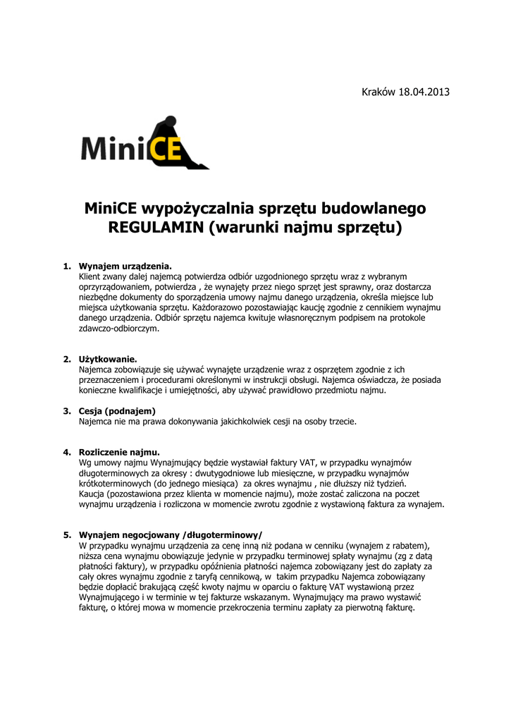 MiniCE wypożyczalnia sprzętu budowlanego REGULAMIN (warunki