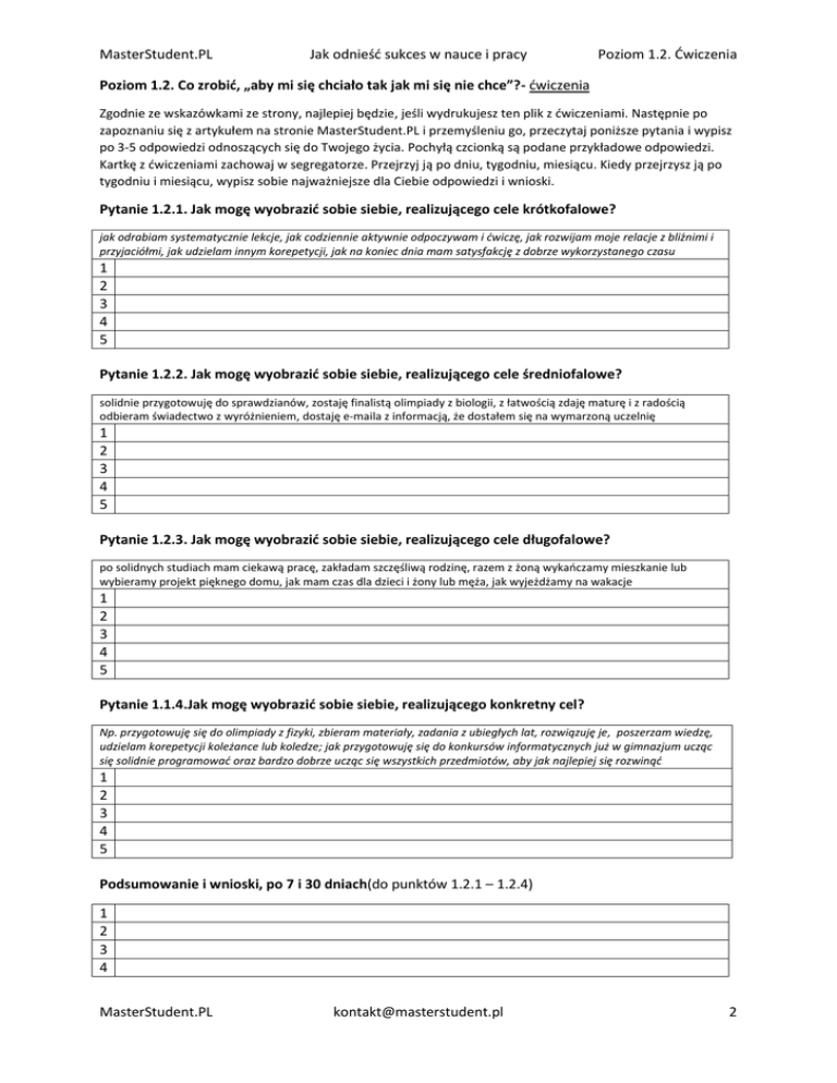 MasterStudent.PL Jak odnieść sukces w nauce i pracy Poziom 1.2. Ćwiczenia Poziom 1.2. Co zrobić, „aby mi się chciało tak jak mi się nie chce”?- ćwiczenia Zgodnie ze wskazówkami ze strony, najlepiej będzie, jeśli wydrukujesz ten plik z ćwiczeniami. Następnie po zapoznaniu się z artykułem na stronie MasterStudent.PL i przemyśleniu go, przeczytaj poniższe pytania i wypisz po 3-5 odpowiedzi odnoszących się do Twojego życia. Pochyłą czcionką są podane przykładowe odpowiedzi. Kartkę z ćwiczeniami zachowaj w segregatorze. Przejrzyj ją po dniu, tygodniu, miesiącu. Kiedy przejrzysz ją po tygodniu i miesiącu, wypisz sobie najważniejsze dla Ciebie odpowiedzi i wnioski. Pytanie 1.2.1. Jak mogę wyobrazić sobie siebie, realizującego cele krótkofalowe? jak odrabiam systematycznie lekcje, jak codziennie aktywnie odpoczywam i ćwiczę, jak rozwijam moje relacje z bliźnimi i przyjaciółmi, jak udzielam innym korepetycji, jak na koniec dnia mam satysfakcję z dobrze wykorzystanego czasu 1 2 3 4 5 Pytanie 1.2.2. Jak mogę wyobrazić sobie siebie, realizującego cele średniofalowe? solidnie przygotowuję do sprawdzianów, zostaję finalistą olimpiady z biologii, z łatwością zdaję maturę i z radością odbieram świadectwo z wyróżnieniem, dostaję e-maila z informacją, że dostałem się na wymarzoną uczelnię 1 2 3 4 5 Pytanie 1.2.3. Jak mogę wyobrazić sobie siebie, realizującego cele długofalowe? po solidnych studiach mam ciekawą pracę, zakładam szczęśliwą rodzinę, razem z żoną wykańczamy mieszkanie lub wybieramy projekt pięknego domu, jak mam czas dla dzieci i żony lub męża, jak wyjeżdżamy na wakacje 1 2 3 4 5 Pytanie 1.1.4.Jak mogę wyobrazić sobie siebie, realizującego konkretny cel? Np. przygotowuję się do olimpiady z fizyki, zbieram materiały, zadania z ubiegłych lat, rozwiązuję je, poszerzam wiedzę, udzielam korepetycji koleżance lub koledze; jak przygotowuję się do konkursów informatycznych już w gimnazjum ucząc się solidnie programować oraz bardzo dobrze ucząc się wszystkich przedmiotów, aby jak najlepiej się rozwinąć 1 2 3 4 5 Podsumowanie i wnioski, po 7 i 30 dniach(do punktów 1.2.1 – 1.2.4) 1 2 3 4 MasterStudent.PL [email protected] 2
