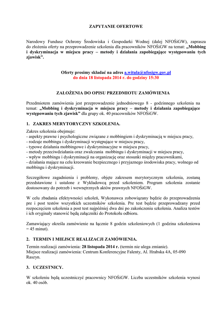 ZAPYTANIE OFERTOWE Narodowy Fundusz Ochrony Środowiska i Gospodarki Wodnej (dalej NFOŚiGW), zaprasza do złoŜenia oferty na przeprowadzenie szkolenia dla pracowników NFOŚiGW na temat: „Mobbing i dyskryminacja w miejscu pracy – metody i działania zapobiegające występowaniu tych zjawisk”. Oferty prosimy składać na adres [email protected] do dnia 18 listopada 2014 r. do godziny 15:30 ZAŁOśENIA DO OPISU PRZEDMIOTU ZAMÓWIENIA Przedmiotem zamówienia jest przeprowadzenie jednodniowego 8 - godzinnego szkolenia na temat: „Mobbing i dyskryminacja w miejscu pracy – metody i działania zapobiegające występowaniu tych zjawisk” dla grupy ok. 40 pracowników NFOŚiGW. 1. ZAKRES MERYTORYCZNY SZKOLENIA. Zakres szkolenia obejmuje: - aspekty prawne i psychologiczne związane z mobbingiem i dyskryminacją w miejscu pracy, - rodzaje mobbingu i dyskryminacji występujące w miejscu pracy, - typowe działania mobbingowe i dyskryminacyjne w miejscu pracy, - metody przeciwdziałania oraz zwalczania mobbingu i dyskryminacji w miejscu pracy, - wpływ mobbingu i dyskryminacji na organizację oraz stosunki między pracownikami, - działania mające na celu kreowanie bezpiecznego i przyjaznego środowiska pracy, wolnego od mobbingu i dyskryminacji. Szczegółowe zagadnienia i problemy, objęte zakresem merytorycznym szkolenia, zostaną przedstawione i ustalone z Wykładowcą przed szkoleniem. Program szkolenia zostanie dostosowany do potrzeb i wewnętrznych aktów prawnych NFOŚiGW. W celu zbadania efektywności szkoleń, Wykonawca zobowiązany będzie do przeprowadzenia pre i post testów wszystkich uczestników szkolenia. Pre test będzie przeprowadzany przed rozpoczęciem szkolenia a post test najpóźniej dwa dni po zakończeniu szkolenia. Analiza testów i ich oryginały stanowić będą załączniki do Protokołu odbioru. Zamawiający określa zamówienie na łącznie 8 godzin szkoleniowych (1 godzina szkoleniowa = 45 minut). 2. TERMIN I MIEJSCE REALIZACJI ZAMÓWIENIA. Termin realizacji zamówienia: 28 listopada 2014 r. (termin nie ulega zmianie). Miejsce realizacji zamówienia: Centrum Konferencyjne Falenty, Al. Hrabska 4A, 05-090 Raszyn. 3. UCZESTNICY. W szkoleniu będą uczestniczyć pracownicy NFOŚiGW. Liczba uczestników szkolenia wynosi ok. 40 osób. 4. TRENER / WYKŁADOWCA. 4.1. Warunkiem przystąpienia do postępowania o udzielenie zamówienia na przeprowadzenie szkolenia nt. „Mobbing i dyskryminacja w miejscu pracy – metody i działania zapobiegające występowaniu tych zjawisk” dla pracowników NFOŚiGW jest wskazanie przez Wykonawcę Wykładowcy posiadającego doświadczenie w prowadzeniu szkoleń w zakresie tematyki szkolenia, tj. przeprowadzenie przez niego co najmniej 3 szkoleń z zakresu szkolenia w ciągu ostatnich 12 miesięcy od dnia otrzymania/publikacji zapytania ofertowego. 4.2. W przypadku uzasadnionej konieczności zmiany Wykładowcy, Wykonawca zapewnia zastępstwo osoby o kwalifikacjach i doświadczeniu zawodowym nie gorszych, niŜ Wykładowcy zastępowanego, przedstawiając Zamawiającemu potwierdzenie jego kwalifikacji i doświadczenia. 4.3. Zamawiający dopuszcza moŜliwość prowadzenia szkolenia przez więcej niŜ jednego Wykładowcę pod warunkiem, Ŝe osoby te zostały zgłoszone do prowadzenia szkolenia w ofercie i spełniają warunki udziału w postępowaniu (bez dodatkowych kosztów – cena za 1 h szkolenia bez względu na liczbę Wykładowców). 5. PROGRAM SZKOLENIA. Zamawiający oczekuje od Wykonawcy, przed rozpoczęciem szkolenia, przedstawienia propozycji programu szkolenia opartego o wymienione w pkt. 1, zagadnienia wraz z propozycją czasu na poszczególne zagadnienia. Wykonawca powinien kierować się swoim doświadczeniem w doborze metod szkolenia. 6. MATERIAŁY SZKOLENIOWE. 6.1. Wykonawca przygotuje i przekaŜe Zamawiającemu najpóźniej na 1 dzień roboczy przed rozpoczęciem szkolenia jeden egzemplarz materiałów merytorycznych i reminderów (przypominaczy – specjalnie przygotowanych arkuszy zawierających najwaŜniejsze elementy szkolenia w formie skondensowanej, w celu łatwiejszego wykorzystania ich w codziennej pracy) w formie elektronicznej do zatwierdzenia przez Zamawiającego. 6.2. Wykonawca zapewni kaŜdemu uczestnikowi szkolenia papierową wersję merytorycznych materiałów szkoleniowych i reminderów. 6.3. Wykonawca przekaŜe jeden egzemplarz materiałów szkoleniowych, reminderów oraz pre i post testów w formie papierowej i elektronicznej (płyta CD) dla Zamawiającego, jako załącznik do protokołu odbioru szkolenia, które zostaną załączone do dokumentacji szkolenia. 6.4. Wykonawca poniesie pełny koszt przygotowania dokumentów określonych w ppkt. 1, 2 i 3 bez dodatkowych roszczeń w stosunku do Zamawiającego związanych ze zwrotem kosztów zakupu, czy ich przygotowania. 7. ORGANIZACJA SZKOLENIA. 7.1. Zamawiający dostarczy Wykonawcy imienną listę uczestników szkolenia na co najmniej 1 dzień przed rozpoczęciem szkolenia, z zastrzeŜeniem moŜliwości jej zmiany/modyfikacji w celu zapewnienia pełnego wykorzystania miejsc na szkoleniu. Wykonawca jest zobowiązany do ścisłej współpracy z Zamawiającym w zakresie maksymalnego wykorzystania miejsc zaplanowanych na szkoleniu. 7.2. Zamawiający zapewnia salę szkoleniową z wyposaŜeniem i wyŜywieniem dla uczestników szkolenia i Wykładowcy. 7.3. Wykonawca opracuje i przedłoŜy Zamawiającemu protokół odbioru po zakończeniu szkolenia. Płatność faktury za realizację szkolenia nastąpi po podpisaniu przez Zamawiającego 2 protokołu odbioru potwierdzającego prawidłowe wykonanie przedmiotu umowy. Protokół odbioru szkolenia winien zawierać w szczególności: a) imiona i nazwiska pracowników, którzy ukończyli szkolenie, b) imię i nazwisko Wykładowcy, który prowadził szkolenie, c) temat i termin szkolenia, d) informację o przebiegu szkolenia (opis nabytych przez uczestników kwalifikacji, liczba godzin zajęć wraz z opisem realizowane