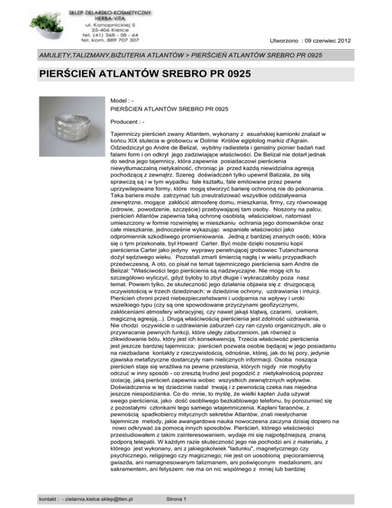 Utworzono : 09 czerwiec 2012 AMULETY,TALIZMANY,BIŻUTERIA ATLANTÓW > PIERŚCIEŃ ATLANTÓW SREBRO PR 0925 PIERŚCIEŃ ATLANTÓW SREBRO PR 0925 Model : PIERŚCIEŃ ATLANTÓW SREBRO PR 0925 Producent : Tajemniczy pierścień zwany Atlantem, wykonany z asuańskiej kamionki znalazł w końcu XIX stulecia w grobowcu w Dolinie Królów egiptolog markiz d'Agrain. Odziedziczył go Andre de Belizal, wybitny radiesteta i genialny pionier badań nad falami form i on odkrył jego zadziwiające właściwości. De Belizal nie dotarł jednak do sedna jego tajemnicy, która zapewnia posiadaczowi pierścienia niewytłumaczalną nietykalność, chroniąc ja przed każdą niewidzialna agresją pochodzącą z zewnątrz. Szereg doświadczeń tylko upewnił Balizala, że siłą sprawczą są i w tym wypadku fale kształtu, fale emitowane przez pewne uprzywilejowane formy, które mogą stworzyć barierę ochronną nie do pokonania. Taka bariera może zatrzymać lub zneutralizować wszystkie oddziaływania zewnętrzne, mogące zakłócić atmosferę domu, mieszkania, firmy, czy równowagę (zdrowie, powodzenie, szczęście) przebywającej tam osoby. Noszony na palcu, pierścień Atlantów zapewnia taką ochronę osobistą właścicielowi, natomiast umieszczony w formie rozwiniętej w mieszkaniu ochrania jego domowników oraz całe mieszkanie, jednocześnie wykazując wspaniałe właściwości jako odpromiennik szkodliwego promieniowania. Jedną z bardziej znanych osób, która się o tym przekonała, był Howard Carter. Być może dzięki noszeniu kopii pierścienia Carter jako jedyny wyprawy penetrującej grobowiec Tutanchamona dożył sędziwego wieku. Pozostali zmarli śmiercią nagłą i w wielu przypadkach przedwczesną. A oto, co pisał na temat tajemniczego pierścienia sam Andre de Belizal: "Właściwości tego pierścienia są nadzwyczajne. Nie mogę ich tu szczegółowo wyliczyć, gdyż byłoby to zbyt długie i wykraczałoby poza nasz temat. Powiem tylko, że skuteczność jego działania objawia się z druzgocącą oczywistością w trzech dziedzinach: w dziedzinie ochrony, uzdrawiania i intuicji. Pierścień chroni przed niebezpieczeństwami i uodparnia na wpływy i uroki wszelkiego typu (czy są one spowodowane przyczynami geofizycznymi, zakłóceniami atmosfery wibracyjnej, czy nawet jakąś klątwą, czarami, urokiem, magiczną agresją...). Drugą właściwością pierścienia jest zdolność uzdrawiania. Nie chodzi oczywiście o uzdrawianie zaburzeń czy ran czysto organicznych, ale o przywracanie pewnych funkcji, które uległy zaburzeniom, jak również o zlikwidowanie bólu, który jest ich konsekwencją. Trzecia właściwość pierścienia jest jeszcze bardziej tajemnicza; pierścień pozwala osobie będącej w jego posiadaniu na niezbadane kontakty z rzeczywistością, odnośnie, której, jak do tej pory, jedynie zjawiska metafizyczne dostarczyły nam nielicznych informacji. Osoba nosząca pierścień staje się wrażliwa na pewne przesłania, których nigdy nie mogłyby odczuć w inny sposób - co zresztą trudno jest pogodzić z nietykalnością poprzez izolację, jaką pierścień zapewnia wobec wszystkich zewnętrznych wpływów. Doświadczenia w tej dziedzinie nadal trwają i z pewnością czeka nas niejedna jeszcze niespodzianka. Co do mnie, to myślę, że wielki kapłan Juda używał swego pierścienia, jako dość osobliwego bezkablowego telefonu, by porozumieć się z pozostałymi członkami tego samego wtajemniczenia. Kapłani faraonów, z pewnością spadkobiercy mitycznych sekretów Atlantów, znali niesłychanie tajemnicze metody, jakie awangardowa nauka nowoczesna zaczyna dzisiaj dopiero na nowo odkrywać za pomocą innych sposobów. Pierścień, którego właściwości przestudiowałem z takim zainteresowaniem, wydaje mi się najpotężniejszą znaną podporą telepatii. W każdym razie skuteczność jego nie pochodzi ani z materiału, z którego jest wykonany, ani z jakiegokolwiek "ładunku", magnetycznego czy psychicznego, religijnego czy magicznego; nie jest on uosobioną pięcioramienną gwiazda, ani namagnesowanym talizmanem, ani poświęconym medalionem, ani sakramentem, ani fetyszem: nie ma on nic wspólnego z mniej lub bardziej kontakt : - [email protected] Strona 1 Utworzono : 09 czerwiec 2012 AMULETY,TALIZMANY,BIŻUTERIA ATLANTÓW > PIERŚCIEŃ ATLANTÓW SREBRO PR 0925 PIERŚCIEŃ ATLANTÓW SREBRO PR 0925 obiecującymi "wynalazkami", z amuletami wymyślonymi przez ludowe zabobony lub ezoteryzm snobów....Pierścień ten jest miejscem i formułą, (czego bezskutecznie poszukiwał Artur Rimbaud) jednego z najbardziej zadziwiających cudów fizyki mikrowibracji: cudem, którego "fale kształtu" są niewidzialnymi agentami." Szersze opracowanie działania pierścienia zostało zawarte w książce Leszka Mateli "Sekrety pierścienia Atlantów". INSTRUKCJA STOSOWANIA PIERŚCIENIA ATLANTÓW Pierścień Atlantów zapewnia jego posiadaczowi trudną do wytłumaczenia nietykalność i chroni go przed każda niewidzialną agresją pochodzącą z zewnątrz. To właśnie fale kształtu emitowane przez pierścień tworzą taką barierę ochronną, która może zatrzymać lub zneutralizować wszystkie oddziaływania zewnętrzne, mogące zakłócić także atmosferę domu i przywrócić zachwianą równowagę przebywającej w niej osoby. Pierścień Atlantów tworzy wokół ciała energetyczną tarczę ochronna, a osoby noszące ten pierścień są mniej wrażliwe na choroby i czują się znacznie lepiej. Pierścień może być noszony na dowolnym palcu każdej ręki nie należy go odstępować innej osobie, gdyż od początku jest związany z właścicielem.Skuteczność działania pierścienia objawia się w trzech dziedzinach, a mianowicie: - pierwsza to ta, że pierścień chroni jego posiadacza przed niebezpieczeństwami i uodparnia na wpływy negatywne wszelkiego rodzaju, - drugą właściwością pierścienia jest jego zdolność uzdrawiania, czyli przywracania pewnych fu