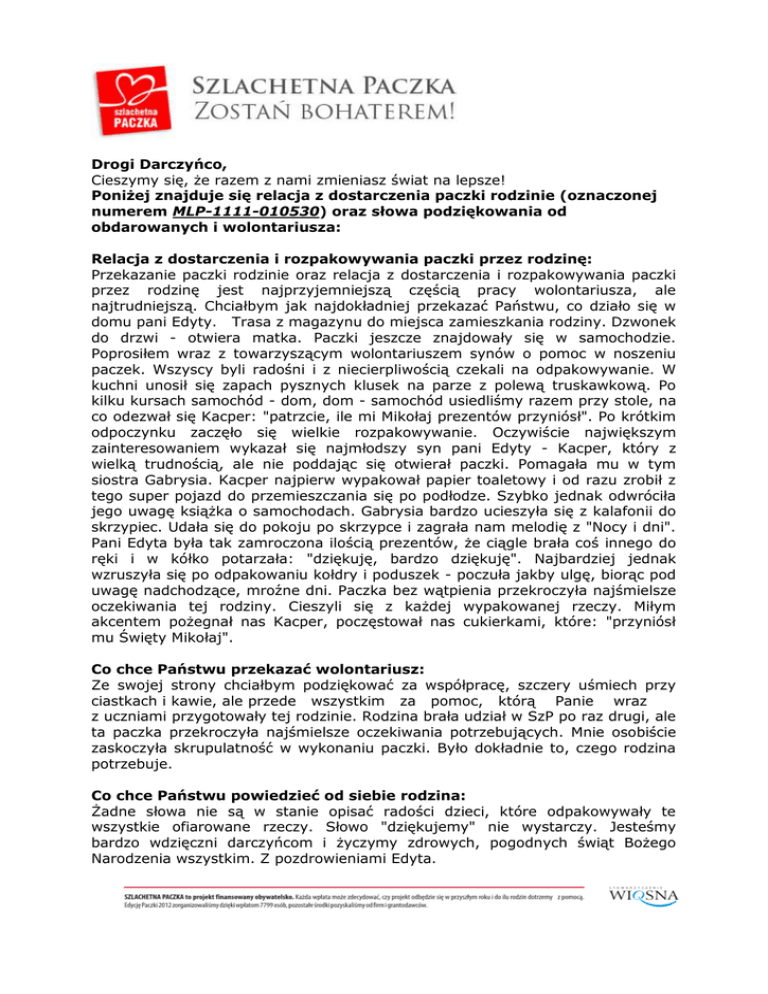 Drogi Darczyńco, Cieszymy się, że razem z nami zmieniasz świat na lepsze! Poniżej znajduje się relacja z dostarczenia paczki rodzinie (oznaczonej numerem MLP-1111-010530) oraz słowa podziękowania od obdarowanych i wolontariusza: Relacja z dostarczenia i rozpakowywania paczki przez rodzinę: Przekazanie paczki rodzinie oraz relacja z dostarczenia i rozpakowywania paczki przez rodzinę jest najprzyjemniejszą częścią pracy wolontariusza, ale najtrudniejszą. Chciałbym jak najdokładniej przekazać Państwu, co działo się w domu pani Edyty. Trasa z magazynu do miejsca zamieszkania rodziny. Dzwonek do drzwi - otwiera matka. Paczki jeszcze znajdowały się w samochodzie. Poprosiłem wraz z towarzyszącym wolontariuszem synów o pomoc w noszeniu paczek. Wszyscy byli radośni i z niecierpliwością czekali na odpakowywanie. W kuchni unosił się zapach pysznych klusek na parze z polewą truskawkową. Po kilku kursach samochód - dom, dom - samochód usiedliśmy razem przy stole, na co odezwał się Kacper: "patrzcie, ile mi Mikołaj prezentów przyniósł". Po krótkim odpoczynku zaczęło się wielkie rozpakowywanie. Oczywiście największym zainteresowaniem wykazał się najmłodszy syn pani Edyty - Kacper, który z wielką trudnością, ale nie poddając się otwierał paczki. Pomagała mu w tym siostra Gabrysia. Kacper najpierw wypakował papier toaletowy i od razu zrobił z tego super pojazd do przemieszczania się po podłodze. Szybko jednak odwróciła jego uwagę książka o samochodach. Gabrysia bardzo ucieszyła się z kalafonii do skrzypiec. Udała się do pokoju po skrzypce i zagrała nam melodię z "Nocy i dni". Pani Edyta była tak zamroczona ilością prezentów, że ciągle brała coś innego do ręki i w kółko potarzała: "dziękuję, bardzo dziękuję". Najbardziej jednak wzruszyła się po odpakowaniu kołdry i poduszek - poczuła jakby ulgę, biorąc pod uwagę nadchodzące, mroźne dni. Paczka bez wątpienia przekroczyła najśmielsze oczekiwania tej rodziny. Cieszyli się z każdej wypakowanej rzeczy. Miłym akcentem pożegnał nas Kacper, poczęstował nas cukierkami, które: "przyniósł mu Święty Mikołaj". Co chce Państwu przekazać wolontariusz: Ze swojej strony chciałbym podziękować za współpracę, szczery uśmiech przy ciastkach i kawie, ale przede wszystkim za pomoc, którą Panie wraz z uczniami przygotowały tej rodzinie. Rodzina brała udział w SzP po raz drugi, ale ta paczka przekroczyła najśmielsze oczekiwania potrzebujących. Mnie osobiście zaskoczyła skrupulatność w wykonaniu paczki. Było dokładnie to, czego rodzina potrzebuje. Co chce Państwu powiedzieć od siebie rodzina: Żadne słowa nie są w stanie opisać radości dzieci, które odpakowywały te wszystkie ofiarowane rzeczy. Słowo "dziękujemy" nie wystarczy. Jesteśmy bardzo wdzięczni darczyńcom i życzymy zdrowych, pogodnych świąt Bożego Narodzenia wszystkim. Z pozdrowieniami Edyta.