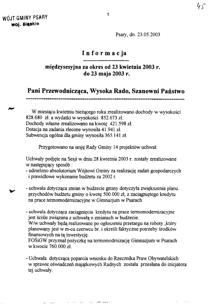 WOJT GMINY PSARY woj. Psary, dn. 23.05.2003 I n f o r m a c ja mifdzysesyjna za okres od 23 kwietnia 2003 r. do 23 maja 2003 r. Pani Przewodniczqca, Wysoka Rado, Szanowni Panstwo W miesiacu kwietniu biezajsego roku zrealizowano dochody w wysokosci 828.680 zl. a wydatki w wysokosci 852.673 zl. Dochody wlasne zrealizowano na kwot§ 421.598 zl. Dotacja na zadania zlecone wynosila 41.941 zl. Subwencja ogolna dla gminy wynosila 365.141 zl. Przygotowano na sesj? Rady Gminy 14 projektow uchwal. Uchwaty podjete na Sesji w dniu 28 kwietnia 2003 r. zostaly zrealizowane w nastepuja,cy spos6b : - udzielono absolutorium Wojtowi Gminy za realizacje. zadari gospodarczych i prawidlowe wykonanie budzetu za 2002 r. - uchwala dotycza^ca zmian w budzecie gminy dotyczyla zwi^kszenia planu przychodow budzetu gminy o kwot? 500.000 zl, z zacia£nietego kredytu na prace termomodernizacyjne w Gimnazjum w Psarach - uchwala dotycza^ca zacia£nie_cia kredytu na prace termomodernizacyjne jest scisle zwiazana z uchwala, o zmianach w budzecie. W/w uchwaly b?da_ realizowane po ogloszeniu przetargu na roboty ,ktory planowany jest w m-cu czerwcu br. i okresli faktyczne potrzeby srodkow finansowych na tst inwestycj^. FOSiGW przyznal pozyczk^ na termomodrnizacj? Gimnazjum w Psarach wkwocie 760.000 zl. - Uchwala dotyczajsa poparcia wniosku do Rzecznika Praw Obywatelskich w sprawie oswiadczen majajkowych Radnych zostala przeslana do inicjatora tej uchwary. - Uchwala dotyczaca zmian planu zagospodarowania przestrzennego obejmujaca tereny w Gorze Siewierskiej przeznaczone pod budow? oczyszczalni sciekow jest wtrakcie raealizacji .Wystapiono do Starostwa 0 zgod? na zmian? przeznaczenia gruntow i przeklasyfikowania terenow lesnych na tereny zadrzewione. Opinia Starostwa b?dzie negatywna, decyzj? podejmie wlasciwe Ministerstwo , co znacznie przedhizy tryb zatatwienia tej sprawy. - Uchwala dotyczaca nadania imienia Marszalka Jozefa Pilsudskiego Gimnazjum Publicznemu w Psarach jest w trakcie realizacji. Uroczystosci zwiazane z tym faktem odb?da. si? w dniu 11 listopada br. - Uchwala dotyczaca sprzedazy budynku bytej Szkory Podstawowej w Preczowie jest w trakcie realizacji. Kompletowane sa. dokumenty do sprzedazy .Problem stanowi przeniesienie lokatorki do mieszkania zast?pczego . Planuje si? w budynku w Psarach przy ul. szkolnej /budynek bytego Urz?du Gminy /przygotowac 1 mieszkanie 2 pokojowe dla P. Gryty. W minionym okresie wydatem 4 zarza^dzenia, ktore dotyczyly : - powolania Komisji Konkursowej do przeprowadzenia konkursu na stanowisko Dyrektora Szkory Podstawowej w Dabiu .Konkurs zostal przeprowadzony w dniu 05.05.2003r. Sposrod 2 kandydatow wytoniono Dyrektora Szkory Podstawowej w Dabiu P.Grazyn? Trzcionk? - dotychczasowego nauczyciela - w SP Dabie. - Zorganizowania przetargu na wykonanie obudowy studni wierconej w Dabiu wraz z wcinka. do istniejacego ruroci^gu Przetarg odbyl si? w dniu 23maja br - zmian w budzecie gminy , ktore polegary na zwi?kszeniu dochodow 1 wydatkow w dziale ,,oswiata i opieka spoleczna oraz gospodarka komunaina i ochrona srodowiska „. Zmiany polegary na przemesiem'u srodkow w dzialach pomi?dzy paragrafami. Zarza.dzeniem tym przeniesiono rowniez z rezerwy budzetowej 20.000 zl na zakup gazu do ogrzewania budynkow komunakiych w Dabiu i w Strzyzowicach .Kwota ta zostanie zrefiindowana przez uzytkownikow tych obiektow. - Przyj?cia Regulaminu Pracy Urz?du Gminy ,ktory zostanie wprowadzony w zycie w Urz?dzie Gminy. 9?- W omawianym okresie podjajem 68 decyzji administracyjnych dotyczacych nastejiujacych spraw: - 11 decyzji dotyczacych umorzeri podatkow na kwot? 1466,37 zh - 2 decyzje orzekaj^ce o odpowiedzialnosci za zalegtosci podatkowe - 53 decyzje ustalajace i weryfikujace podatek od nieruchomosci i podatek rolny - 2 decyzje dotyczace zwolnien z tytuhi ulg nowonabytych gruntow na powi^kszenie gospodarstwa rolnego - 2 decyzje dotyczace rozlozenia na raty podatku od spadkow i darowizn nakwote.3801 zl. -15 decyzji dotyczacych ustalenia warunkow zabudowy i zagospodarowania terenu - 1 decyzja zatwierdzaja^ca projekt podziahi nieruchomosci - 2 decyzje zatwierdzaja^ce rozgraniczenie nieruchomosci 3 decyzje dotyczace zaj^cia pasa drogowego drog gminnych 9 decyzji dotyczacych wykresleh dzialalnosci gospodarczej - 2 decyzje dotyczace sprostowania danych w aktach stanu cywilnego W minionym okresie wydano : -1 zaswiadczenie o stanie majatkowym podatnika - zameldowano 12 osob, a wymeldowano 1 osob? W - przyjeto 35 podari o wydanie odpisow z akt USC i wydano 57 odpisow aktow urodzeri, malzeristw i zgonow - sporz^dzono 7 aktow zgonu oraz 3 akty malzeristwa - udzielono 2 slubow cywilnych - wydano 2 zaswiadczenia stwierdzaja.ce brak okolicznosci wyla.czajacych zawarcie matzeristwa - wydano 31 dowodow osobistych oraz przyjeto 42 wnioski o wydanie dowodu osobistego - dokonano 9 likwidacji dowodow osobistych z powodu zgonu - wydano 19 informacji o przeznaczeniu gruntow w planie zagospodarowania przestrzennego - zarejestrowano 8 podmiotow gospodarczych - dokonano 8 zmian w dzialalnosci gospodarczej - dokonano 6 wykreslen dzialalnosci gospodarczej - wydano 6 zezwolen na sprzedaz alkoholu - wypisano 15 zaswiadczen potwierdzenia wplaty za zezwolenia na sprzedaz alkoholu W okresie obje,tym informacjq. zawartem 4 umowy dotyczajse: - uzyczenia dla LKS ,3tyskawica" Preczow i LKS ,,Iskra „ Psary dzialek na ktorych usytuowane sa. boiska sportowe - wykonania odwietu poszukiwawczego wody pitnej w Malinowicach. Umowe; zawarto z Przedsiebiorstwem Handlowo-Ustugowym ,,Wodmar „ w Bielsku Biatej na kwote, 51.083 zl ,z terminem realizacji do 12.08.2003 r. - Opracowania wnioskow o dofinansowanie z Narodowego Funduszu Ochrony Srodowiska i Gospodarki Wodnej na modernizacje_ gospodarki cieplnej w budynku gimnazjum i w budynku Urze_du Gminy w Psarach na kwote, 5490 zl, z terminem realizacji do 31 maja 2003 r. Umow? o opracowanie w/ w wnioskow zawarto z Przedsiebiorstwem ,,Dynamika „ w Gliwicach. - Opracowania zmian w studium zagospodarowania 