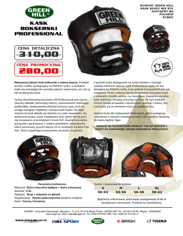 Najwyższej jakości kask bokserski z osłoną twarzy. Produkt bardzo rzadko występujący na Polskim rynku, a podobne kaski nie posiadają tak wysokiej jakości wykonania, ani nie są tak atrakcyjnej cenie. Cechą charakterystyczną kasku GH Professional jest użycie twardej wkładki osłonowej twarzy, zastosowanie stabilnego podbródka, zastosowanie płaskiej ochrony uszu, oraz na uwagę zasługuje miękkość i elastyczność kasku. Do tego stopnia że kask układa się idealnie na czole zawodnika. Do wykonania kasku użyto najlepszych skór jakich do tej pory nie stosowano w produktach Green Hill. Zewnętrzna skóra jest gruba i garbowana, z małym połyskiem, wewnętrzna skóra zamszowa, jeszcze lepsza niż w modelach kasków Five Star. Która zapobiega przesuwaniu się kasku na głowie. Parametry techniczne: Materiał: Skóra naturalna bydlęca + skóra zamszowa Rozmiar: S-XL Zapięcie: Rzep + wiązanie na głowie Wypełnienie: Pianka poliuretanowa [średnio miękka] Kolor: Czarny, Czerwony Z pośród wielu dostępnych na rynku kasków z różnego rodzaju osłonami twarzy, kask Professional nigdy nie był dostępny na Polskim rynki, a na rynkach Europejskich jest od niedawna. Kaski z osłoną twarzy przewyższa wszystkie kaski z osłonami z kratki, pleksy, czy tworzywa. Zapewnia szerokie pole widzenia i wysoką ochronę na ciosy. W tych kaskach można śmiało prowadzić najostrzejsze sparingi z boksu, bez narażania się na złamanie nosa czy podbicie oka. Idealne kaski dla zastosowań klubowych, gdzie występują zawodnicy o różnych umiejętnościach i sile. Idealną rękawicą do kasku będzie Tiger. NOWOŚĆ NA POLSKIM RYNKU PRODUKT TAK JAK WSZYSKIE Z OFERTY NA ZAMÓWIENIE. ROCZNA GWARANCJA PRODUCENTA. Dobór i dopasowanie kasków: S M L 50-54 54-56 56-58 XL 58-62 Będziemy informować jeżeli będą występowały braki w dostępnych rozmiarach. Produkt na zamówienie. CAGER – Krzysztof Zakrzewski, Mieszka I 17 m.5, 05-270 Marki Polska, NIP/EU NIP: PL 125-041-24-60, Regon: 145992650 www.cager.pl, Mail: [email protected], Tel: 0048 518-947-860, Fax: 0048 22-415-50-11
