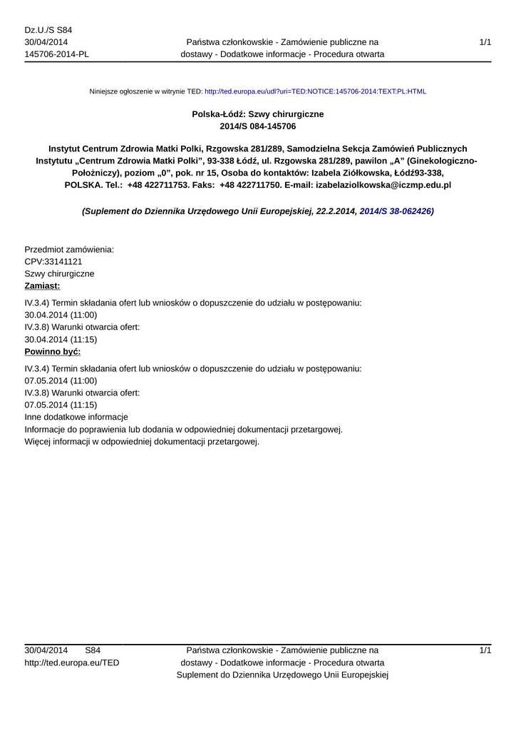 Dz.U./S S84 30/04/2014 145706-2014-PL Państwa członkowskie - Zamówienie publiczne na dostawy - Dodatkowe informacje - Procedura otwarta 1/1 Niniejsze ogłoszenie w witrynie TED: http://ted.europa.eu/udl?uri=TED:NOTICE:145706-2014:TEXT:PL:HTML Polska-Łódź: Szwy chirurgiczne 2014/S 084-145706 Instytut Centrum Zdrowia Matki Polki, Rzgowska 281/289, Samodzielna Sekcja Zamówień Publicznych Instytutu „Centrum Zdrowia Matki Polki”, 93-338 Łódź, ul. Rzgowska 281/289, pawilon „A” (GinekologicznoPołożniczy), poziom „0”, pok. nr 15, Osoba do kontaktów: Izabela Ziółkowska, Łódź93-338, POLSKA. Tel.: +48 422711753. Faks: +48 422711750. E-mail: [email protected] (Suplement do Dziennika Urzędowego Unii Europejskiej, 22.2.2014, 2014/S 38-062426) Przedmiot zamówienia: CPV:33141121 Szwy chirurgiczne Zamiast: IV.3.4) Termin składania ofert lub wniosków o dopuszczenie do udziału w postępowaniu: 30.04.2014 (11:00) IV.3.8) Warunki otwarcia ofert: 30.04.2014 (11:15) Powinno być: IV.3.4) Termin składania ofert lub wniosków o dopuszczenie do udziału w postępowaniu: 07.05.2014 (11:00) IV.3.8) Warunki otwarcia ofert: 07.05.2014 (11:15) Inne dodatkowe informacje Informacje do poprawienia lub dodania w odpowiedniej dokumentacji przetargowej. Więcej informacji w odpowiedniej dokumentacji przetargowej. 30/04/2014 S84 http://ted.europa.eu/TED Państwa członkowskie - Zamówienie publiczne na dostawy - Dodatkowe informacje - Procedura otwarta Suplement do Dziennika Urzędowego Unii Europejskiej 1/1