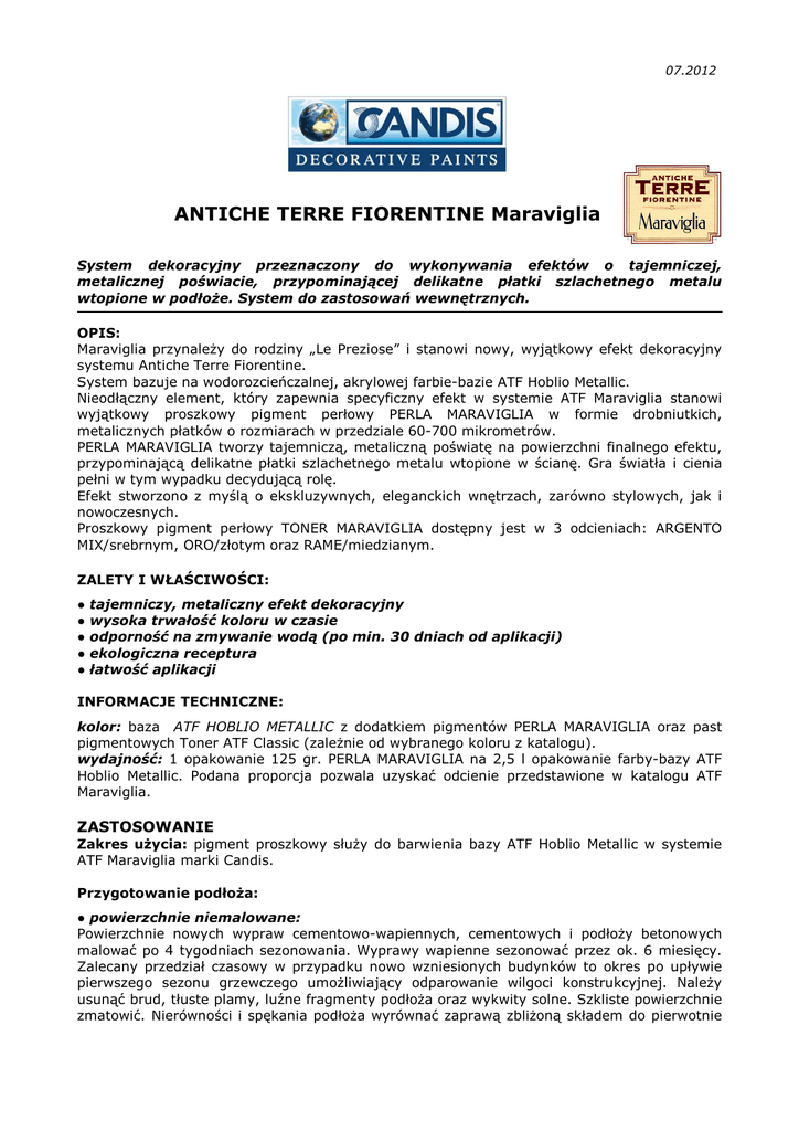 07.2012 ANTICHE TERRE FIORENTINE Maraviglia System dekoracyjny przeznaczony do wykonywania efektów o tajemniczej, metalicznej poświacie, przypominającej delikatne płatki szlachetnego metalu wtopione w podłoŜe. System do zastosowań wewnętrznych. OPIS: Maraviglia przynaleŜy do rodziny „Le Preziose” i stanowi nowy, wyjątkowy efekt dekoracyjny systemu Antiche Terre Fiorentine. System bazuje na wodorozcieńczalnej, akrylowej farbie-bazie ATF Hoblio Metallic. Nieodłączny element, który zapewnia specyficzny efekt w systemie ATF Maraviglia stanowi wyjątkowy proszkowy pigment perłowy PERLA MARAVIGLIA w formie drobniutkich, metalicznych płatków o rozmiarach w przedziale 60-700 mikrometrów. PERLA MARAVIGLIA tworzy tajemniczą, metaliczną poświatę na powierzchni finalnego efektu, przypominającą delikatne płatki szlachetnego metalu wtopione w ścianę. Gra światła i cienia pełni w tym wypadku decydującą rolę. Efekt stworzono z myślą o ekskluzywnych, eleganckich wnętrzach, zarówno stylowych, jak i nowoczesnych. Proszkowy pigment perłowy TONER MARAVIGLIA dostępny jest w 3 odcieniach: ARGENTO MIX/srebrnym, ORO/złotym oraz RAME/miedzianym. ZALETY I WŁAŚCIWOŚCI: ● ● ● ● ● tajemniczy, metaliczny efekt dekoracyjny wysoka trwałość koloru w czasie odporność na zmywanie wodą (po min. 30 dniach od aplikacji) ekologiczna receptura łatwość aplikacji INFORMACJE TECHNICZNE: kolor: baza ATF HOBLIO METALLIC z dodatkiem pigmentów PERLA MARAVIGLIA oraz past pigmentowych Toner ATF Classic (zaleŜnie od wybranego koloru z katalogu). wydajność: 1 opakowanie 125 gr. PERLA MARAVIGLIA na 2,5 l opakowanie farby-bazy ATF Hoblio Metallic. Podana proporcja pozwala uzyskać odcienie przedstawione w katalogu ATF Maraviglia. ZASTOSOWANIE Zakres uŜycia: pigment proszkowy słuŜy do barwienia bazy ATF Hoblio Metallic w systemie ATF Maraviglia marki Candis. Przygotowanie podłoŜa: ● powierzchnie niemalowane: Powierzchnie nowych wypraw cementowo-wapiennych, cementowych i podłoŜy betonowych malować po 4 tygodniach sezonowania. Wyprawy wapienne sezonować przez ok. 6 miesięcy. Zalecany przedział czasowy w przypadku nowo wzniesionych budynków to okres po upływie pierwszego sezonu grzewczego umoŜliwiający odparowanie wilgoci konstrukcyjnej. NaleŜy usunąć brud, tłuste plamy, luźne fragmenty podłoŜa oraz wykwity solne. Szkliste powierzchnie zmatowić. Nierówności i spękania podłoŜa wyrównać zaprawą zbliŜoną składem do pierwotnie uŜytej. Występujące na powierzchni mikroorganizmy naleŜy usunąć specjalnym preparatem. PodłoŜe zagruntować dwiema warstwami podkładu FONDO ATF CLASSIC. Pierwszą warstwę naleŜy rozcieńczyć wodą w ilości 20-25%, drugą w ilości 15-20%. FONDO ATF CLASSIC aplikować równomiernie pędzlem, wałkiem lub natryskiem, aby uzyskać jednolitą, bardzo gładką powierzchnię. Przed nanoszeniem ATF Hoblio Metallic warstwa podkładu FONDO ATF CLASSIC musi być całkowicie wyschnięta i związana. Generalnie najlepszy efekt przy aplikacji ATF Hoblio Metallic osiągany jest w przypadku bardzo gładkiej powierzchni. ● powierzchnie malowane (istniejące powłoki malarskie): Usunąć brud, tłuste plamy, łuszczące się powłoki malarskie, luźne fragmenty podłoŜa i wykwity solne. Szkliste powierzchnie zmatowić. Nierówności i spękania podłoŜa wyrównać zaprawą zbliŜoną składem do pierwotnie uŜytej. Występujące na powierzchni mikroorganizmy naleŜy usunąć specjalnym preparatem. Następnie naleŜy postępować zgodnie z metodą przedstawioną w przypadku „powierzchni niemalowanych”. W przypadku renowacji starych powłok malarskich wykonać wymalowanie próbne. Uzyskanie pozytywnego wyniku decyduje o ostatecznym zastosowaniu produktu. W przypadku powłok wapiennych i klejowych naleŜy je bezwzględnie usunąć. APLIKACJA: PodłoŜe musi być nośne, suche, czyste i odpylone. Farba-baza ATF Hoblio Metallic przeznaczona jest do stosowania w postaci handlowej, przed uŜyciem wymaga jedynie dokładnego wymieszania. W zaleŜności od ostatecznego efektu kolorystycznego przedstawionego w katalogu systemu ATF Maraviglia naleŜy wybrać jedną z przedstawionych poniŜej metod: Metoda nr 1: zmieszać bazę ATF Hoblio Metallic z jednym z 3 metalicznych pigmentów PERLA MARAVIGLIA w proporcji 250 g (1 opakowanie) tonera na 2.5 l opakowanie bazy. Następnie dokładnie i równomiernie rozprowadzić na powierzchni podłoŜa za pomocą pędzla. Metoda nr 2: zmieszać bazę ATF Hoblio Metallic z jednym z 3 metalicznych pigmentów PERLA MARAVIGLIA w proporcji 250 g (1 opakowanie) tonera na 2.5 l opakowanie bazy. Następnie dodać odpowiedni toner TONER ATF CLASSIC. Dokładnie i równomiernie rozprowadzić na powierzchni podłoŜa za pomocą pędzla. Farbę-bazę ATF HOBLIO METALLIC dokładnie zmieszać szpatułą lub mieszadłem (wolnoobrotowym) z wybranym pigmentem PERLA MARAVIGLIA (metoda nr 1) lub pigmentem PERLA MARAVIGLIA i dodatkowo z tonerem TONER ATF CLASSIC (metoda nr 2) w ilości zaleŜnej od Ŝądanego odcienia i intensywności barwy. NaleŜy zwrócić szczególną uwagę na dokładne połączenie pigmentów PERLA MARAVIGLIA z bazą z uwagi na fakt, iŜ występują one w formie proszkowej. Produkt aplikować jednokrotnie na podłoŜe o powierzchni 1-2 m2 metodą „na krzyŜ”, pędzlem PANNELLO ATF. Granice opracowywanego fragmentu powinny być nieregularne. NaleŜy unikać schematycznej aplikacji. W trakcie postępu prac naleŜy okresowo mieszać produkt w opakowaniu z uwagi na tendencję do sedymentacji pigmentów proszkowych PERLA MARAVIGLIA. Nie nanosić na powłoki farb wapiennych i klejowych. Efekt ostateczny moŜe być oceniany po całkowitym wyschnięciu naniesionego produktu. Bezpośrednio po aplikacji dekoracji na ścianę, niektóre partie mogą wykazywać mleczny odcień, który zanika wraz z postępującym procesem schnięcia spoiwa. Warunki klimatyczne w trakcie i po aplikacji: Prace malars