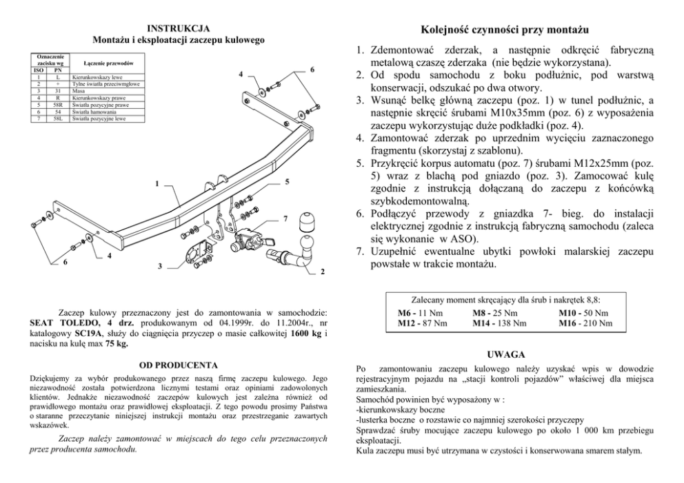 INSTRUKCJA MontaŜu i eksploatacji zaczepu kulowego Oznaczenie zacisku wg ISO PN 1 L 2 + 3 31 4 R 5 58R 6 54 7 58L Kolejność czynności przy montaŜu Łączenie przewodów 6 4 Kierunkowskazy lewe Tylne światła przeciwmgłowe Masa Kierunkowskazy prawe Światła pozycyjne prawe Światła hamowania Światła pozycyjne lewe 1 5 7 6 4 3 2 Zaczep kulowy przeznaczony jest do zamontowania w samochodzie: SEAT TOLEDO, 4 drz. produkowanym od 04.1999r. do 11.2004r., nr katalogowy SC19A, słuŜy do ciągnięcia przyczep o masie całkowitej 1600 kg i nacisku na kulę max 75 kg. 1. Zdemontować zderzak, a następnie odkręcić fabryczną metalową czaszę zderzaka (nie będzie wykorzystana). 2. Od spodu samochodu z boku podłuŜnic, pod warstwą konserwacji, odszukać po dwa otwory. 3. Wsunąć belkę główną zaczepu (poz. 1) w tunel podłuŜnic, a następnie skręcić śrubami M10x35mm (poz. 6) z wyposaŜenia zaczepu wykorzystując duŜe podkładki (poz. 4). 4. Zamontować zderzak po uprzednim wycięciu zaznaczonego fragmentu (skorzystaj z szablonu). 5. Przykręcić korpus automatu (poz. 7) śrubami M12x25mm (poz. 5) wraz z blachą pod gniazdo (poz. 3). Zamocować kulę zgodnie z instrukcją dołączaną do zaczepu z końcówką szybkodemontowalną. 6. Podłączyć przewody z gniazdka 7- bieg. do instalacji elektrycznej zgodnie z instrukcją fabryczną samochodu (zaleca się wykonanie w ASO). 7. Uzupełnić ewentualne ubytki powłoki malarskiej zaczepu powstałe w trakcie montaŜu. Zalecany moment skręcający dla śrub i nakrętek 8,8: M6 - 11 Nm M8 - 25 Nm M10 - 50 Nm M12 - 87 Nm M14 - 138 Nm M16 - 210 Nm UWAGA OD PRODUCENTA Dziękujemy za wybór produkowanego przez naszą firmę zaczepu kulowego. Jego niezawodność została potwierdzona licznymi testami oraz opiniami zadowolonych klientów. JednakŜe niezawodność zaczepów kulowych jest zaleŜna równieŜ od prawidłowego montaŜu oraz prawidłowej eksploatacji. Z tego powodu prosimy Państwa o staranne przeczytanie niniejszej instrukcji montaŜu oraz przestrzeganie zawartych wskazówek. Zaczep naleŜy zamontować w miejscach do tego celu przeznaczonych przez producenta samochodu. Po zamontowaniu zaczepu kulowego naleŜy uzyskać wpis w dowodzie rejestracyjnym pojazdu na „stacji kontroli pojazdów” właściwej dla miejsca zamieszkania. Samochód powinien być wyposaŜony w : -kierunkowskazy boczne -lusterka boczne o rozstawie co najmniej szerokości przyczepy Sprawdzać śruby mocujące zaczepu kulowego po około 1 000 km przebiegu eksploatacji. Kula zaczepu musi być utrzymana w czystości i konserwowana smarem stałym. PPUH AUTO-HAK Sp.J. WyposaŜenie zaczepu: Produkcja Zaczepów Kulowych Henryk & Zbigniew Nejman 76-200 SŁUPSK ul. Słoneczna 16K tel/fax (059) 8-414-414; 8-414-413 E-mail: [email protected] www. autohak.com.pl Zaczep kulowy bez wyposaŜenia elektrycznego SC19A Klasa: A50-X Nr kat. Przeznaczony do zamontowania w samochodzie: Producent: SEAT Model: TOLEDO Typ: 4drz. produkowanym od 04.1999r. do 11.2004r. Dane techniczne: Wartość siły D : 8,62 kN maksymalna masa przyczepy: 1600 kg maksymalny nacisk na kulę: 75 kg Numer homologacji zgodnie z Dyrektywą 94/20/WE: e20*94/20*1133*00 KARTA GWARANCYJNA Producent udziela gwarancji niniejszą kartą gwarancyjną na okres 24 miesięcy licząc od dnia zakupu zaczepu kulowego do samochodu: SEAT TOLEDO 4 drz. produkowanego od 04.1999r. do 11.2004r. Data produkcji .............................. Data zakupu............................................. Zakres gwarancji obejmuje wyłącznie wady jakościowe wynikające z winy producenta. Gwarancja nie obejmuje natomiast uszkodzeń zawinionych przez nabywcę, wynikających z niewłaściwego montaŜu, uŜytkowania lub konserwacji, uszkodzeń mechanicznych, normalnego zuŜycia podczas eksploatacji itp. Gwarancja udzielona na zakupiony towar nie wyłącza, nie ogranicza ani nie zawiesza uprawnień kupującego wynikających z niezgodności towaru z umową. Reklamacje naleŜy zgłaszać w punkcie sprzedaŜy, składając jednocześnie kartę gwarancyjną. Usunięcie "wady" następuje po stwierdzeniu przez punkt sprzedaŜy wspólnie z producentem słuszności złoŜonej reklamacji. Reklamacja powinna być załatwiona w ciągu 14 dni od dnia uznania reklamacji. Karta gwarancyjna jest niewaŜna jeŜeli nie jest wypełniona i podpisana. Data zgłoszenia reklamacji: ................................................................... INFORMACJA WSTĘPNA Zaczep kulowy jest skonstruowany zgodnie z zasadami bezpieczeństwa ruchu drogowego. Zaczep kulowy jest elementem wpływającym na bezpieczeństwo jazdy i moŜe zostać zainstalowany wyłącznie przez personel wyspecjalizowany. Niedopuszczalne jest dokonywanie jakichkolwiek zmian w konstrukcji zaczepu. Powoduje to wygaśniecie dopuszczenia do stosowania. W przypadku obecności masy izolacyjnej lub osłony podwozia w miejscu przylegania zaczepu, naleŜy ją usunąć. Nieosłonięte miejsca karoserii oraz wywiercone otwory naleŜy pomalować farbą antykorozyjną. Informacjami wiąŜącymi odnośnie wartości obciąŜeń są dane podawane przez producenta samochodu, względnie wartości maksymalnej masy przyczepy oraz maksymalnego nacisku na kulę, przy czym wartości parametrów zaczepu kulowego nie mogą być przekroczone. Wzór do obliczania wartości siły D: Maks. masa przyczepy [kg] x Maks. masa samochodu [kg] Maks. masa przyczepy [kg] + Maks. masa samochodu [kg] X 9,81 = 1000 D [kN]