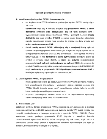 Sposób posługiwania się wykazem 1. Jeżeli znany jest symbol PKWiU danego wyrobu - np. kupiłam okna PCV i na fakturze podany jest symbol PKWiU następujący: 25.23.14 - sprawdzam więc czy w wykazie znajduje się grupowanie PKWiU o takim dokładnie symbolu albo zaczynające się od tych samych cyfr ( wyjaśnienie jak należy czytać klasyfikacje PKWiU – patrz pkt 4). Jeżeli znajdę dokładnie taki sam symbol PKWiU, a nazwa grupy towarów odpowiada nazwie zakupionego przeze mnie wyrobu, to znaczy, że dany wyrób jest objęty systemem zwrotu VAT. - Jeżeli znajdę symbol PKWiU składający się z mniejszej liczby cyfr niż symbol zakupionego przeze mnie towaru (np. w wykazie znajdę symbol 25.23, a mój symbol na fakturze to 25.23.14), to wówczas – jeżeli symbol PKWiU z faktury (25.23.14) ma dokładnie te same cyfry patrząc od lewej strony co symbol z wykazu (czyli 25.23), a różni się jedynie rozszerzeniem grupowania (czyli cyframi następującymi po cyfrach 25.23), to oznacza, że symbol PKWiU na mojej fakturze stanowi rozszerzenie symbolu PKWiU 25.23 (czyli zawiera się w grupowaniu 25.23 i podlega systemowi zwrotu VAT, o ile nie jest wyłączony – patrz pkt 3 – co oznacza „ex”). 2. Jeżeli symbol PKWiU nie jest znany - można próbować ustalić go poszukując wyrobu w PKWiU (pomocna może tu być wyszukiwarka internetowa – wpisujemy nazwa naszego wyrobu and PKWiU (dzięki dodaniu słowa „and” wyszukiwarka pokaże tylko te wyniki, które zawierają wszystkie poszukiwane frazy). - Przykład: poszukujemy symbolu okien PCV. W wyszukiwarce wpisujemy zatem następujący tekst: okna PCV and PKWiU 3. Co oznacza „ex” Jeżeli przy symbolu danego grupowania PKWiU znajduje się „ex”, oznacza to, iż z całego tego grupowania (np. ex 25.23) wyłączone są z systemu zwrotu VAT jakieś wyroby (np. budynki prefabrykowane z tworzyw sztucznych o symbolu PKWiU 25.23.2). Zatem systemowi zwrotu podlega grupowanie 25.23 (łącznie z wszelkimi bardziej rozbudowanymi symbolami PKWiU, które zaczynają się tak samo, czyli 25.23 + ewentualne dalsze cyfry), jednak z wyłączeniem wyrobów wymienionych (na ogół po zwrocie „z wyłączeniem”) w rubryce nr 3 wykazu. 4. Jak należy czytać Polską Klasyfikację Wyrobów i Usług (PKWiU) Przy tworzeniu PKWiU przyjęto zasadę kompletności podziału grupowań macierzystych, jako podstawowy i nieodzowny warunek poprawności całej klasyfikacji; zasada ta stanowi, że suma zakresów grupowań pochodnych musi być równa zakresowi bezpośrednio nadrzędnego grupowania macierzystego; oznacza to, że suma zakresów grupowań pochodnych musi w pełni wyczerpywać zakres grupowania macierzystego i nie może być od niego większa. Aktualne klasyfikacje PKWiU dostępne są na stronie Głównego Urzędu Statystycznego (www.stat.gov.pl ) pod linkiem : http://www.stat.gov.pl/klasyfikacje/PKWiU/pkwiu.htm ; należy jednak pamiętać, iż do celów podatkowych (a zatem do celów niniejszego obwieszczenia również) stosuje się klasyfikacje PKWiU z 1997 r. (Dz. U. Nr 42, poz. 264 ze zm.), których brzmienie jest tylko częściowo tożsame z brzmieniem klasyfikacji PKWiU z 2004 r.