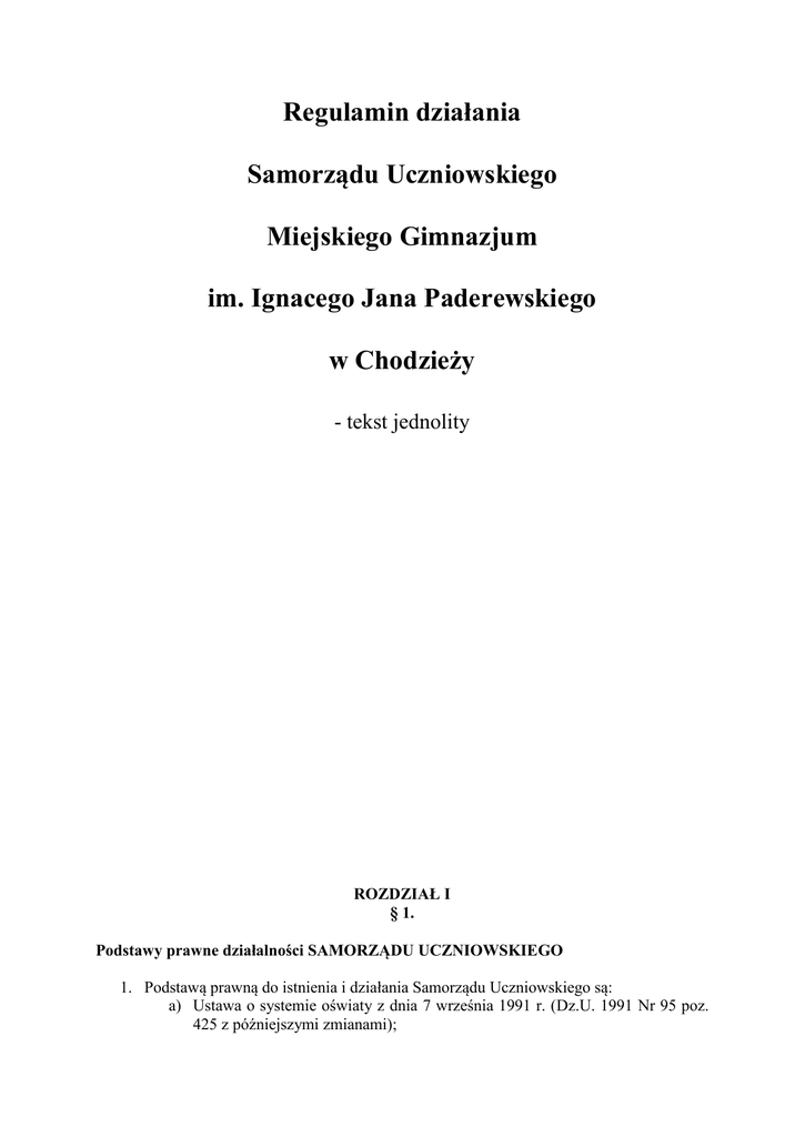 Regulamin działania Samorządu Uczniowskiego Miejskiego Gimnazjum im. Ignacego Jana Paderewskiego w Chodzieży - tekst jednolity ROZDZIAŁ I § 1. Podstawy prawne działalności SAMORZĄDU UCZNIOWSKIEGO 1. Podstawą prawną do istnienia i działania Samorządu Uczniowskiego są: a) Ustawa o systemie oświaty z dnia 7 września 1991 r. (Dz.U. 1991 Nr 95 poz. 425 z późniejszymi zmianami); b) Ustawa z dnia 19 marca 2009 r. o zmianie ustawy o systemie oświaty oraz zmianie niektórych innych ustaw (DZ.U. nr 56 poz.456); c) Statut Miejskiego Gimnazjum w Chodzieży. § 2. Nazwa i organizacja Samorządu 1. W Miejskim Gimnazjum im. Ignacego Jana Paderewskiego działa Samorząd Uczniowski, zwany dalej Samorządem. 2. Samorząd tworzą wszyscy uczniowie Miejskiego Gimnazjum. 3. Najwyższym organem władzy Samorządu jest Walne Zgromadzenie wszystkich samorządów klasowych („trójek”) i Rady Uczniowskiej. 4. Walne Zgromadzenie zwołuje Rada Uczniowska, a przewodniczy mu przewodniczący Rady Uczniowskiej. 5. Rada Uczniowska jest wybierana przez ogół uczniów Gimnazjum z listy kandydatów z wszystkich klas. 6. Radę Uczniowską tworzą: przewodniczący, zastępca, sekretarz, skarbnik oraz przewodniczący i członkowie sekcji. 7. W Samorządzie działają trzy sekcje: informacyjna, redakcyjna i rozrywkowa. 8. Zasady wybierania i odwoływania władz Samorządu określa ordynacja wyborcza uchwalona przez ogół uczniów w głosowaniu powszechnym, równym i tajnym na pierwszym zebraniu nowego Samorządu. 9. Organy Samorządu są jedynymi reprezentantami ogółu uczniów. 10. Wszystkie decyzje Samorządu zapadają większością głosów w głosowaniu jawnym. 11. Regulamin zawiera: a) strukturę Samorządu Uczniowskiego; b) kompetencje władz Samorządu; c) wykaz członków Samorządu i ich zadania; d) ordynację wyborczą do władz Samorządu i na jego opiekuna; e) finanse Samorządu; f) postanowienia końcowe. ROZDZIAŁ II § 3. Prawa i obowiązki Samorządu 1. Do kompetencji Walnego Zgromadzenia uczniów należy: a) przyjmowanie sprawozdań z działalności Rady Samorządu, wyrażanie opinii o pracy władz Samorządu; b) odwoływanie Rady Uczniowskiej lub poszczególnych członków Rady, jeżeli nie wykonują powierzonych im zadań, nie spełniają warunków narzuconych im przez ordynację wyborczą jako kandydatom do Samorządu lub z powodu zachowania niezgodnego ze Statutem Szkoły; c) wybór nauczyciela będącego opiekunem Samorządu; d) uchwalenie regulaminu Samorządu. 2. Do kompetencji Rady Uczniowskiej należy: a) zwoływanie Walnego Zgromadzenia; b) opracowywanie i przedstawianie projektów programu prac Samorządu; c) współdziałanie z organami Gimnazjum: Radą Rodziców, Radą Pedagogiczną i Dyrektorem Gimnazjum; d) organizowanie referendum w sprawach ważnych dla Gimnazjum; e) organizowanie pracy komisji stałych i doraźnych; f) realizacja uchwał Walnego Zgromadzenia; g) stawianie wniosków i propozycji inicjatyw własnych na posiedzeniach Rady Uczniowskiej i ich realizacji po akceptacji Rady; h) reprezentowanie opinii uczniów wobec Rady Pedagogicznej i Rady Rodziców oraz Dyrektora Gimnazjum; i) prowadzenie bieżącej dokumentacji działalności merytorycznej oraz gospodarczej. 3. Samorząd posiada prawo do: a) przedstawiania Radzie Szkoły, Radzie Pedagogicznej, Dyrektorowi wniosków i opinii we wszystkich sprawach Miejskiego Gimnazjum, w szczególności dotyczących realizacji podstawowych praw uczniów; b) organizacji życia szkolnego, z zachowaniem proporcji między nauką a możliwością rozwijania i zaspokajania własnych zainteresowań; c) organizowania różnych form aktywności: kulturalnej, oświatowej, sportowej i rozrywkowej, zgodnie z własnymi potrzebami i możliwościami organizacyjnymi, w porozumieniu z Dyrektorem Miejskiego Gimnazjum; d) wyboru nauczyciela pełniącego rolę opiekuna Samorządu; e) zapoznania się z programem nauczania, z jego treściami, celami i stawianymi wymaganiami na poziomie wszystkich klas; f) prawo redagowania i wydawania gazetki szkolnej. ROZDZIAŁ III § 4. Członkowie Rady Uczniowskiej i ich zadania 1. Do obowiązków Przewodniczącego Rady Uczniowskiej należy: a) planowanie i prowadzenie zebrań Rady Uczniowskiej i Walnego Zgromadzenia (lub wyznaczenie prowadzącego, gdy sam nie może w nim uczestniczyć); b) przydzielanie zadań członkom Rady; c) współpraca z Dyrektorem Gimnazjum i opiekunem Samorządu; d) angażowanie wszystkich uczniów do współpracy na rzecz Samorządu; e) pełnienie funkcji łącznika między uczniami a Dyrektorem Gimnazjum, Radą Pedagogiczną , Radą Rodziców. 2. Do obowiązków Zastępcy Przewodniczącego należy: a) w czasie nieobecności przewodniczącego pełnienie jego obowiązków; b) wspomaganie przewodniczącego w pełnieniu jego obowiązków. 3. Do obowiązków Sekretarza Rady Uczniowskiej należy: a) opracowanie wraz z przewodniczącym porządku zebrań Rady Uczniowskiej i Walnego Zgromadzenia; b) gromadzenie wniosków, które mają być rozpatrzone przez Radę; c) protokołowanie zebrań oraz prowadzenie dokumentacji (sprawozdania z zebrań, korespondencja, uchwały Rady, opisy działań Samorządu); d) informowanie uczniów Gimnazjum na bieżąco o inicjatywach Rady (na łamach gazety szkolnej, tablicy informacyjnej, poprzez radiowęzeł, poprzez Sekcję Informacyjną). 4. Do obowiązków Skarbnika należą: a) prowadzenie finansów Samorządu pod nadzorem opiekuna Samorządu; b) prowadzenie dokładnych zapisów wszystkich operacji finansowych i gromadzenie rachunków; c) informowanie Rady Uczniowskiej o stanie kasy, wpływach i wydatkach; d) współpraca z przewodniczącym i opiekunem Samorządu w sprawach budżetu i finansów. 5. Obowiązki Przewodniczących Sekcji Rady Uczniowskiej: a) kierowanie pracami poszczególnych Sekcji; b) aktywne uczestniczenie w pracach i zebraniach Rady Uczniowskiej; c) uczestniczenie w opracowaniu projektu budżetu. 6. Obowiązki członków Rady Uczniow