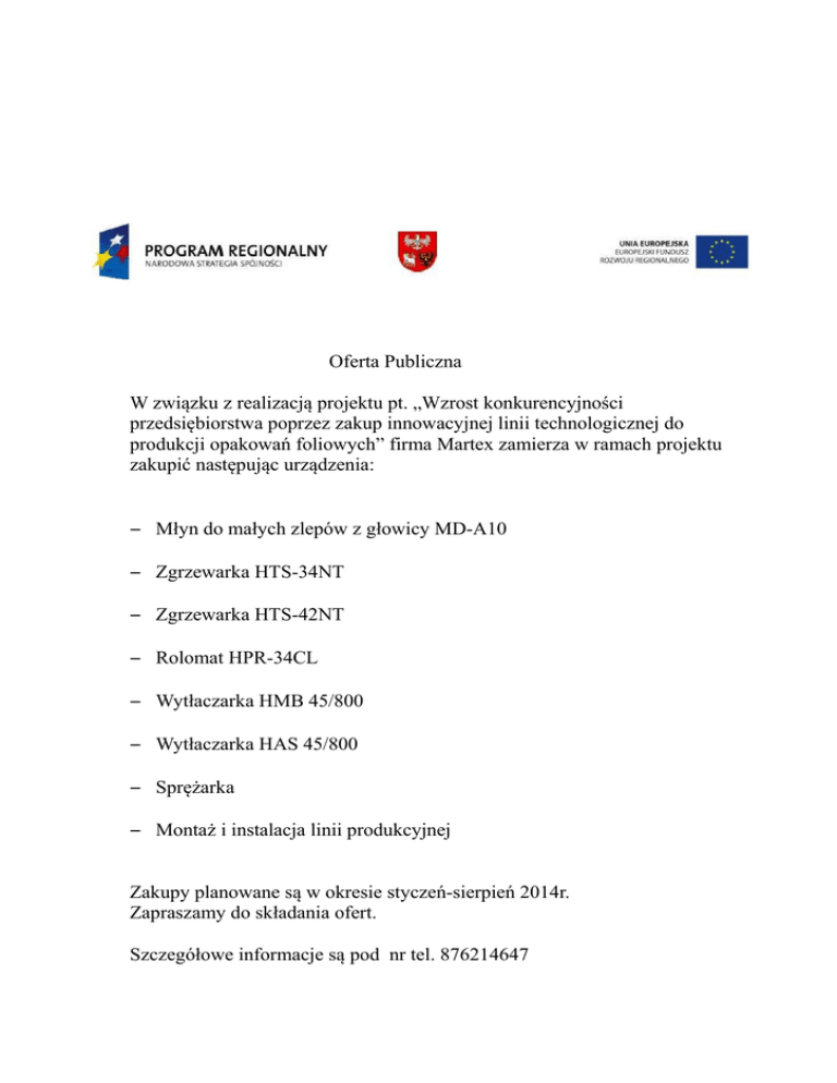 Oferta Publiczna W związku z realizacją projektu pt. „Wzrost konkurencyjności przedsiębiorstwa poprzez zakup innowacyjnej linii technologicznej do produkcji opakowań foliowych” firma Martex zamierza w ramach projektu zakupić następując urządzenia: – Młyn do małych zlepów z głowicy MD-A10 – Zgrzewarka HTS-34NT – Zgrzewarka HTS-42NT – Rolomat HPR-34CL – Wytłaczarka HMB 45/800 – Wytłaczarka HAS 45/800 – Sprężarka – Montaż i instalacja linii produkcyjnej Zakupy planowane są w okresie styczeń-sierpień 2014r. Zapraszamy do składania ofert. Szczegółowe informacje są pod nr tel. 876214647