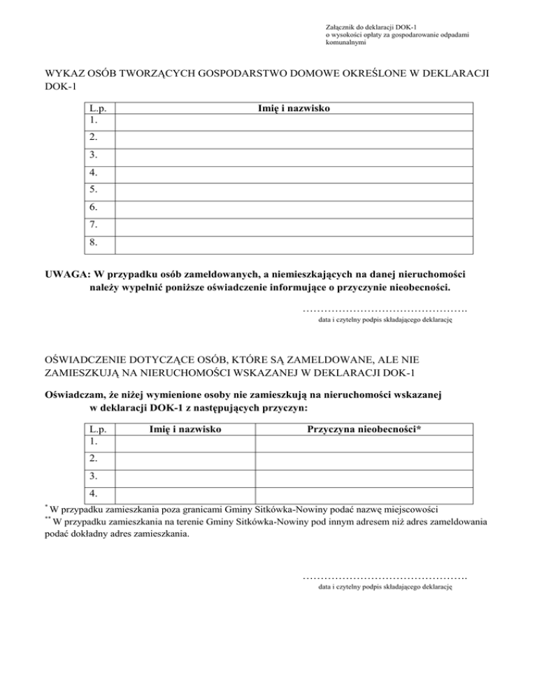 Załącznik do deklaracji DOK-1 o wysokości opłaty za gospodarowanie odpadami komunalnymi WYKAZ OSÓB TWORZĄCYCH GOSPODARSTWO DOMOWE OKREŚLONE W DEKLARACJI DOK-1 Imię i nazwisko L.p. 1. 2. 3. 4. 5. 6. 7. 8. UWAGA: W przypadku osób zameldowanych, a niemieszkających na danej nieruchomości należy wypełnić poniższe oświadczenie informujące o przyczynie nieobecności. ………………………………………. data i czytelny podpis składającego deklarację OŚWIADCZENIE DOTYCZĄCE OSÓB, KTÓRE SĄ ZAMELDOWANE, ALE NIE ZAMIESZKUJĄ NA NIERUCHOMOŚCI WSKAZANEJ W DEKLARACJI DOK-1 Oświadczam, że niżej wymienione osoby nie zamieszkują na nieruchomości wskazanej w deklaracji DOK-1 z następujących przyczyn: L.p. 1. Imię i nazwisko Przyczyna nieobecności* 2. 3. 4. W przypadku zamieszkania poza granicami Gminy Sitkówka-Nowiny podać nazwę miejscowości W przypadku zamieszkania na terenie Gminy Sitkówka-Nowiny pod innym adresem niż adres zameldowania podać dokładny adres zamieszkania. * ** ………………………………………. data i czytelny podpis składającego deklarację